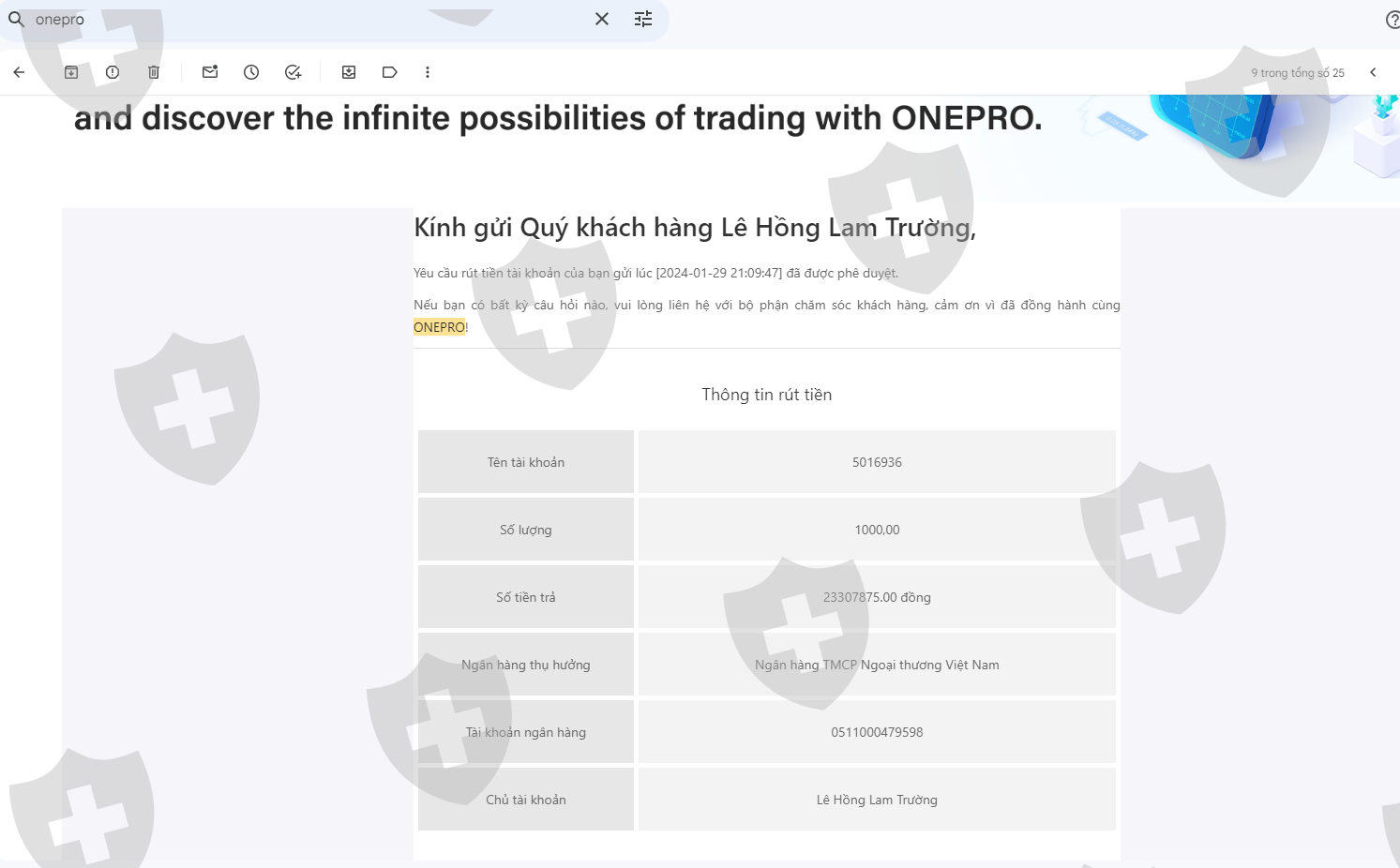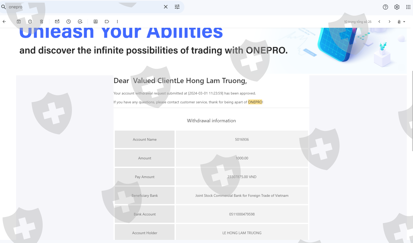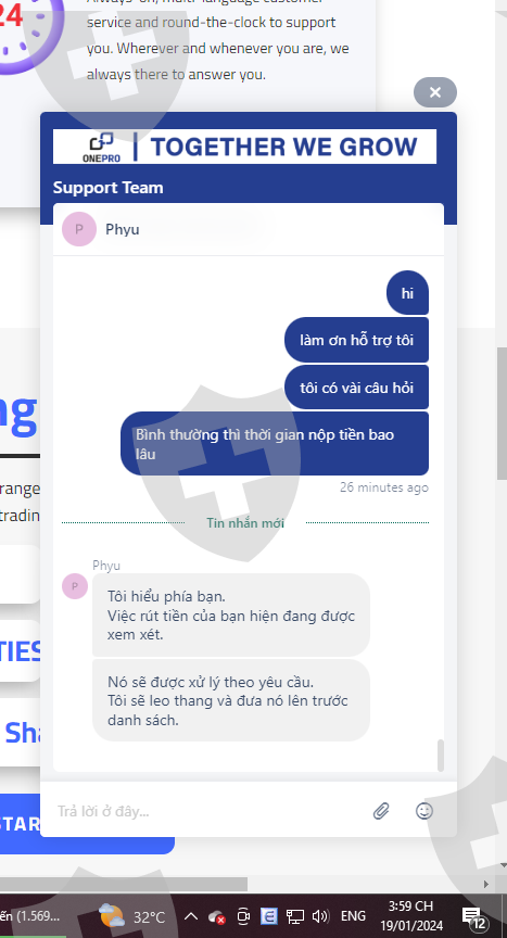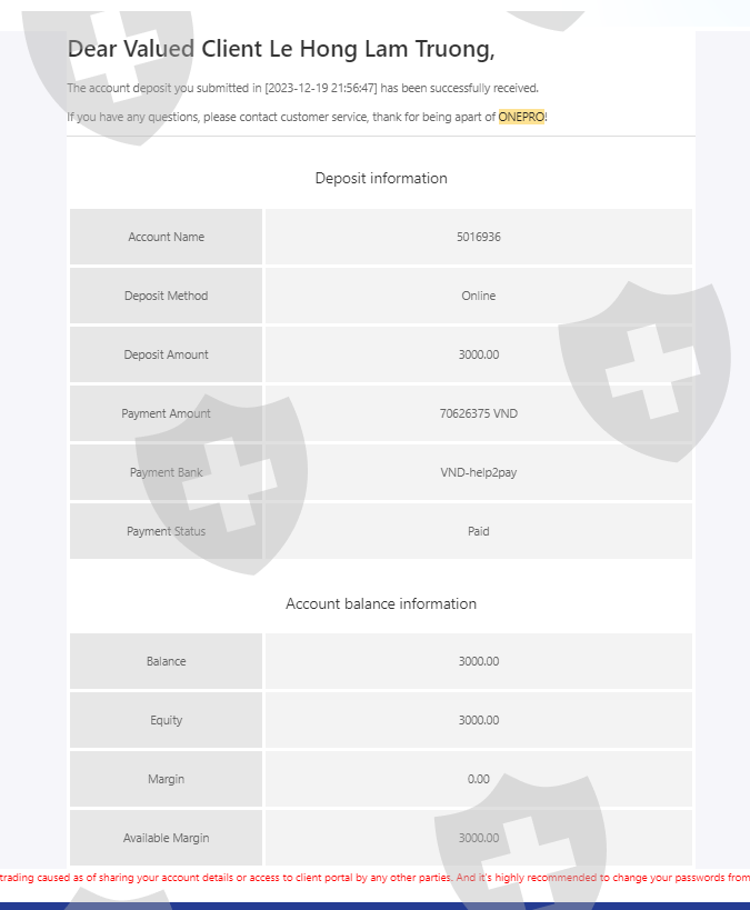 Ngày 19/12/2023 tôi có nộp số tiền 3000$ vào tài khoản giao dịch, sau 1 tháng giao dịch sinh lợi nhuận tôi có làm lệnh rút tiền 1000$ đầu tiên vào ngày 29/01/2024 nhưng tài khoản ngân hàng của tôi không nhận được số tiền đó. trong khi nó đã trừ vào tk giao dịch của tôi và thông báo đã thành công nhưng không nhận được. Sàn Onepro cố ý tạo lịch sử giả để chiếm đoạt số tiền của tôi và sau nhiều lần liên hệ cố gắng kéo dài thời gian và sau đó mất tích. Phi vụ lừa đảo trắng trợn và số tiền vốn 3000$ vẫn chưa được rút. Live chat thì không thấy hoạt động và không có support hỗ trợ. Tôi muốn lấy lại 3000$ của tôi