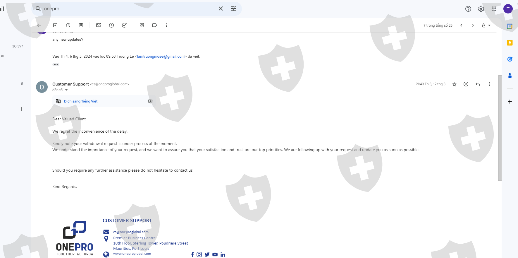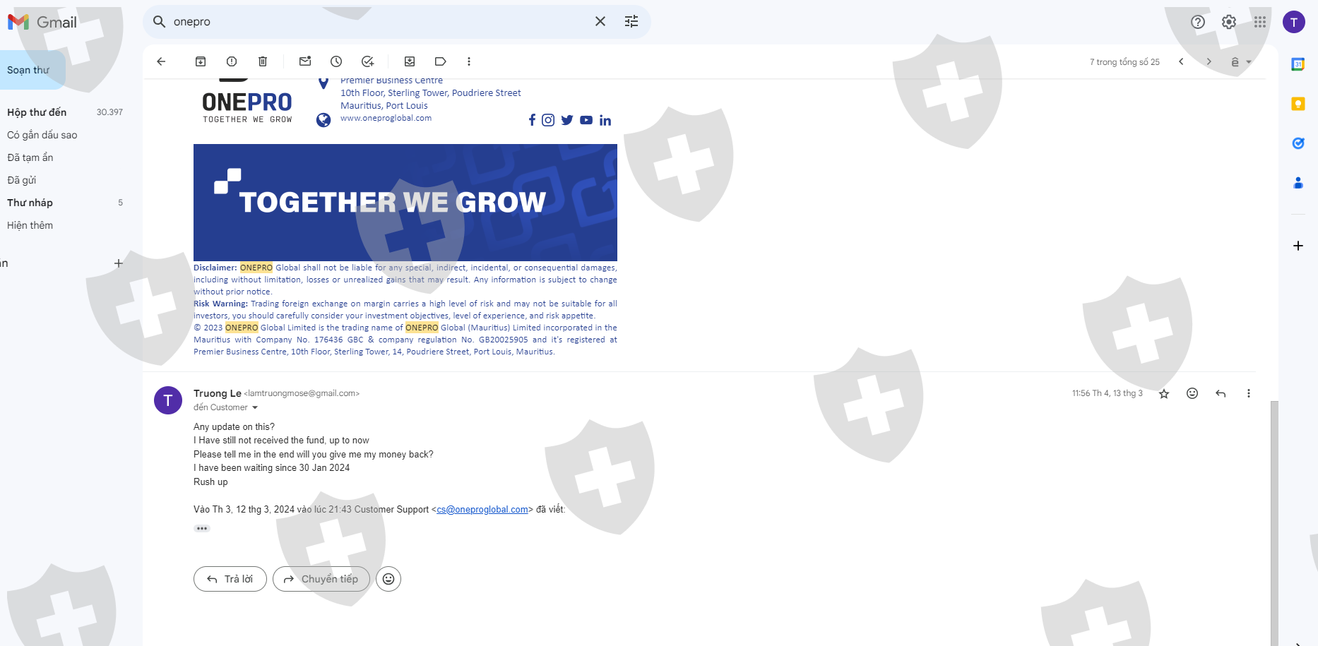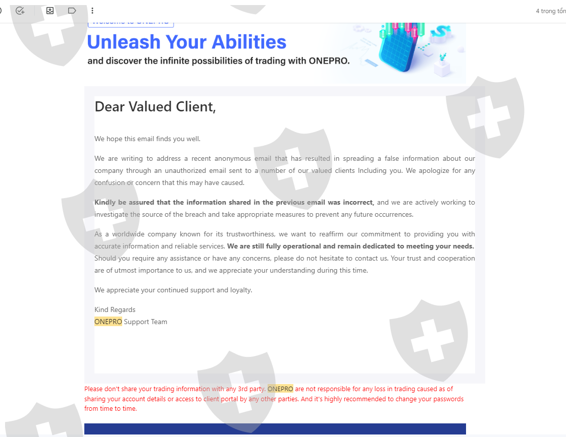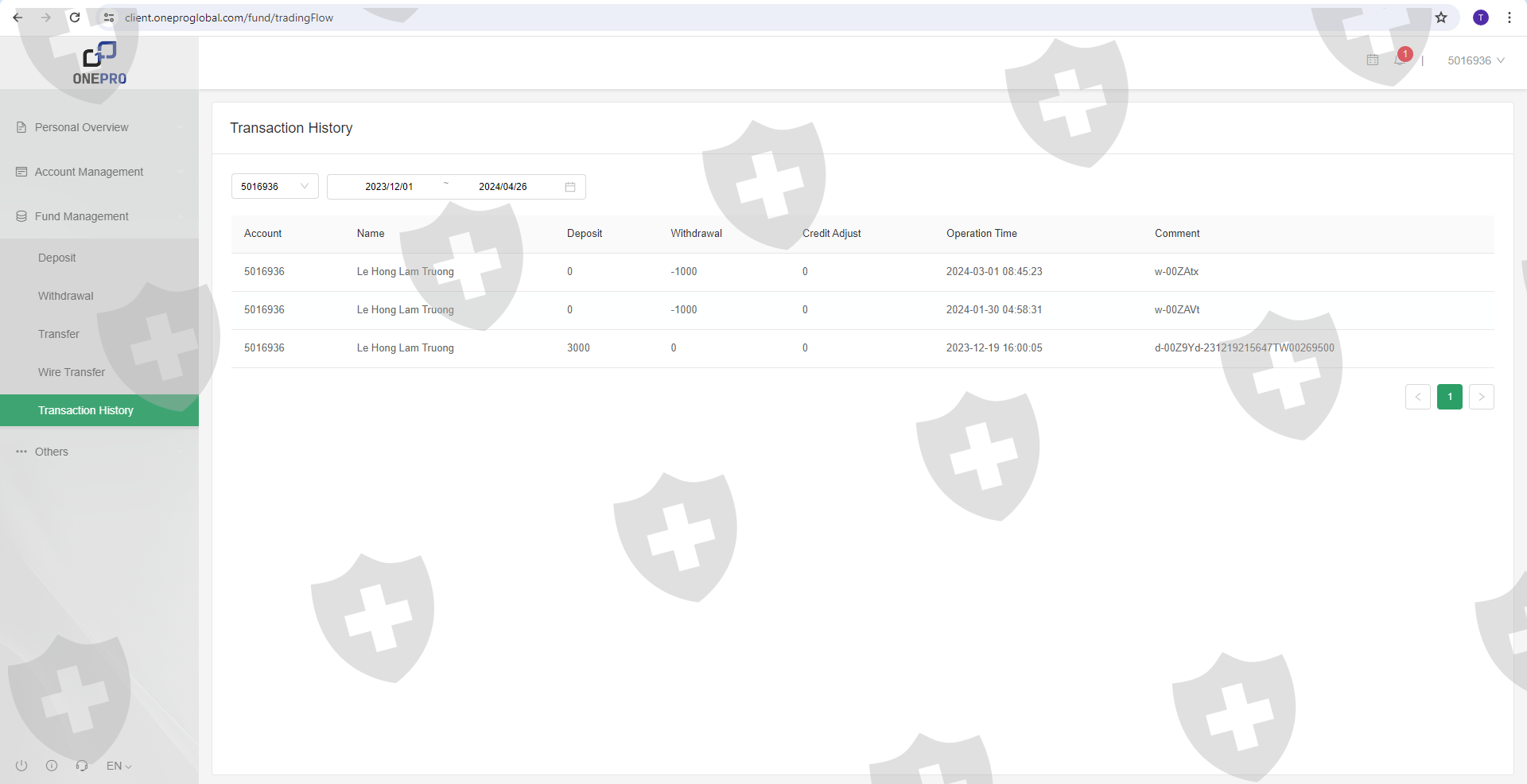 Ngày 19/12/2023 tôi có nộp số tiền 3000$ vào tài khoản giao dịch, sau 1 tháng giao dịch sinh lợi nhuận tôi có làm lệnh rút tiền 1000$ đầu tiên vào ngày 29/01/2024 nhưng tài khoản ngân hàng của tôi không nhận được số tiền đó. trong khi nó đã trừ vào tk giao dịch của tôi và thông báo đã thành công nhưng không nhận được. Sàn Onepro cố ý tạo lịch sử giả để chiếm đoạt số tiền của tôi và sau nhiều lần liên hệ cố gắng kéo dài thời gian và sau đó mất tích. Phi vụ lừa đảo trắng trợn và số tiền vốn 3000$ vẫn chưa được rút. Live chat thì không thấy hoạt động và không có support hỗ trợ. Tôi muốn lấy lại 3000$ của tôi