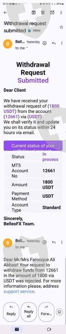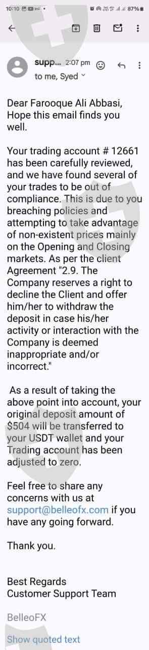 I am writing to provide my review of the services provided by Belleofx scammer Broker. My name is Farooq Ali Abbasi, and I opened an account with Belleofx with the MT5 A/C No. . I2661 would like to bring to your attention an incident that has occurred with my account, which has led me to believe that Belleofx is a fraudulent broker.