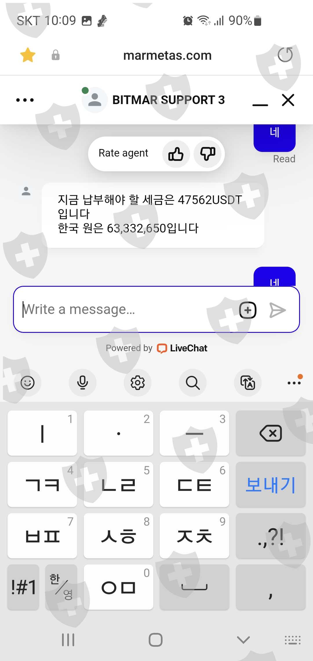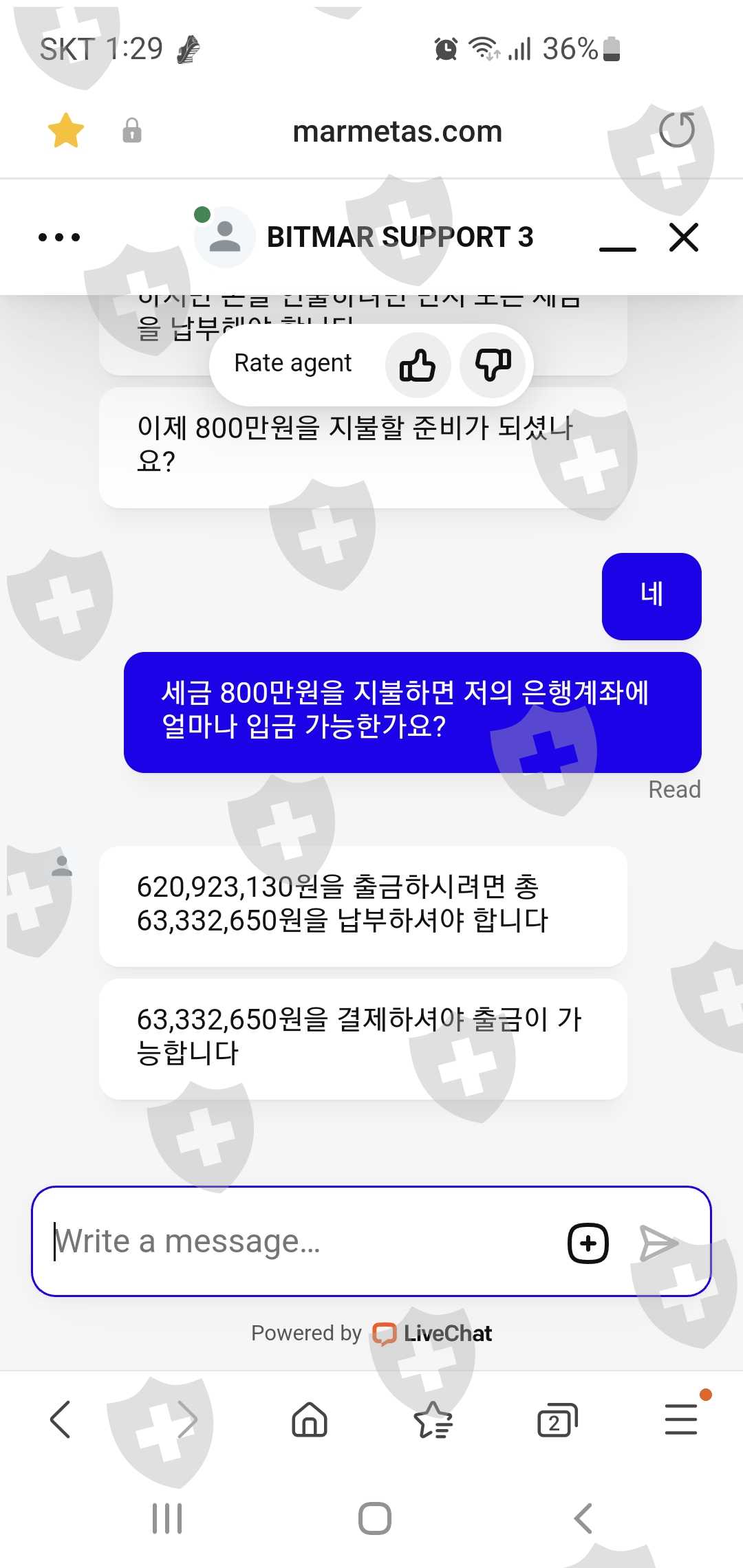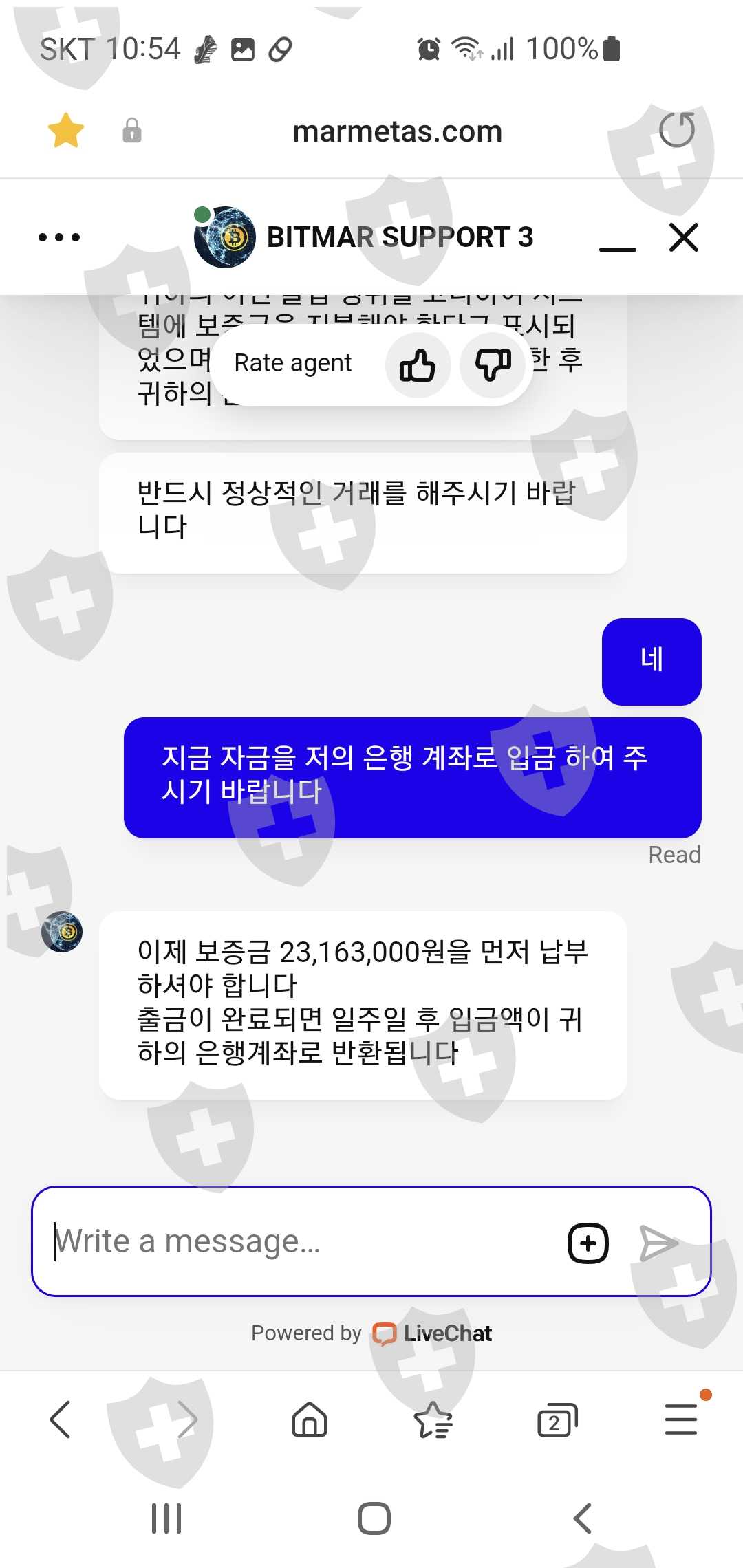 https://www.bitmarmeta.com 에서 선물 거래를 하던 중 2024년 2월 14일에 자금이 필요하여 거래소에 출금을 요청 했지만 거래소에서는 자금세탁 등으로 계정에 문제가 생겼다며 자금 466305 USDT를 일시에 출금을 하라며 세금 한국 원화 63332650원을 먼저 납부 해야지 출금이 가능 하다고 합니다.어렵게 세금을 완납 했는데 이제는 거래소에서는 보증금 한국원화 23163000원을 먼저 납부해야지 출금이 가능하다고 합니다.어렵게 보증금을 완납 했지만 거래소에서는 온갖 핑계로 지금까지 (2024년 4월 29일) 출금을 안해 주고 있습니다.