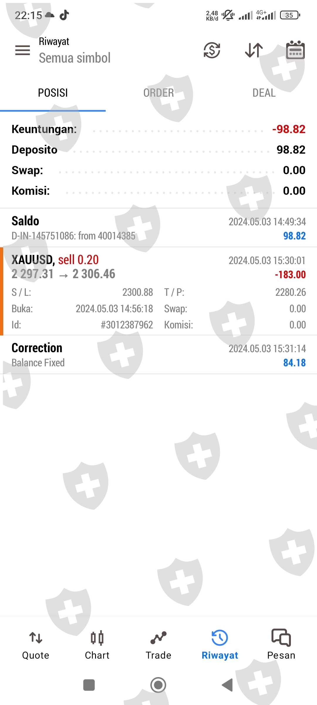在5月3日(周五)晚上7:30的时候,我在交易黄金,这时有新闻数据,我设止损在2300.88,但没触发。所以我损失了大概71美元,和183美元的追加保证金。