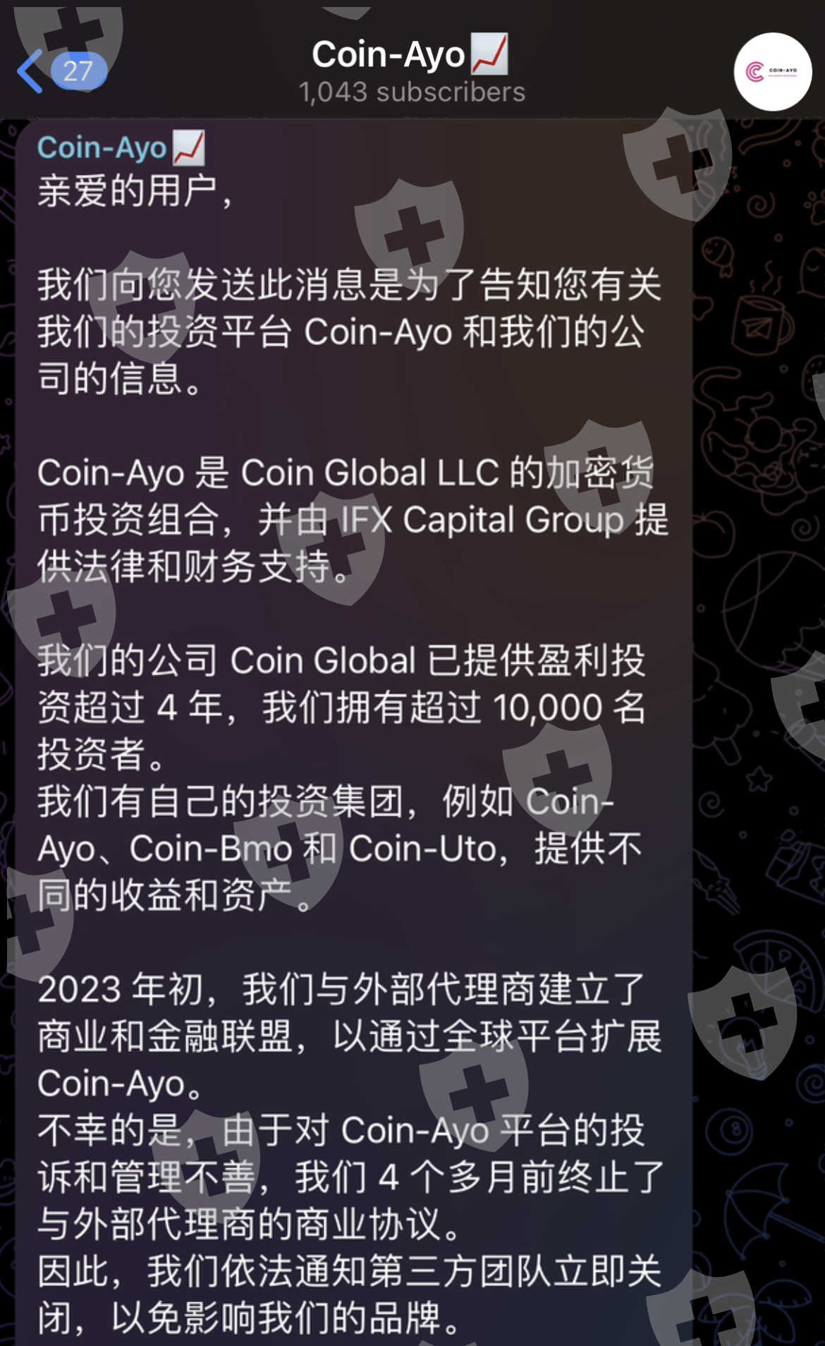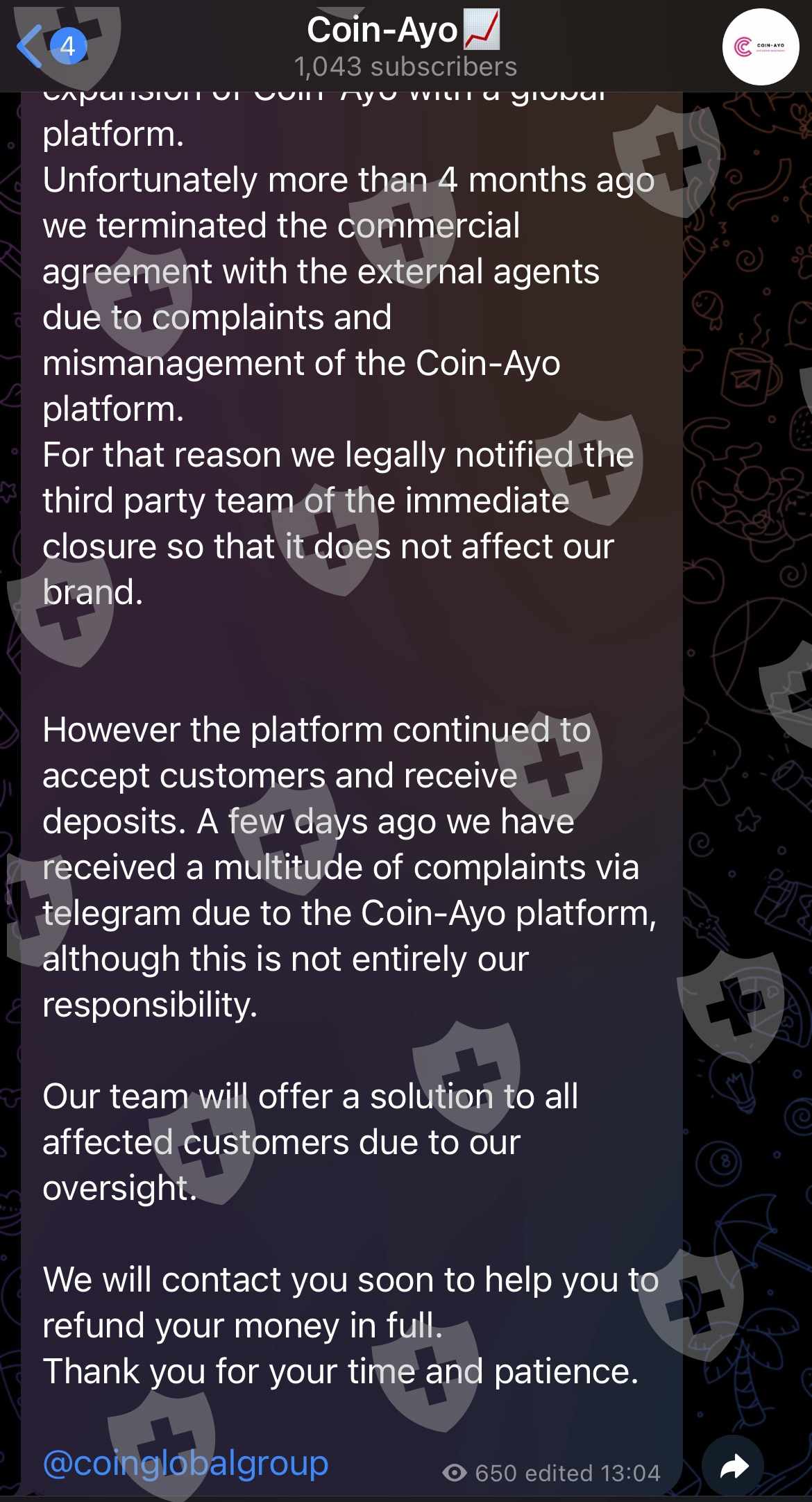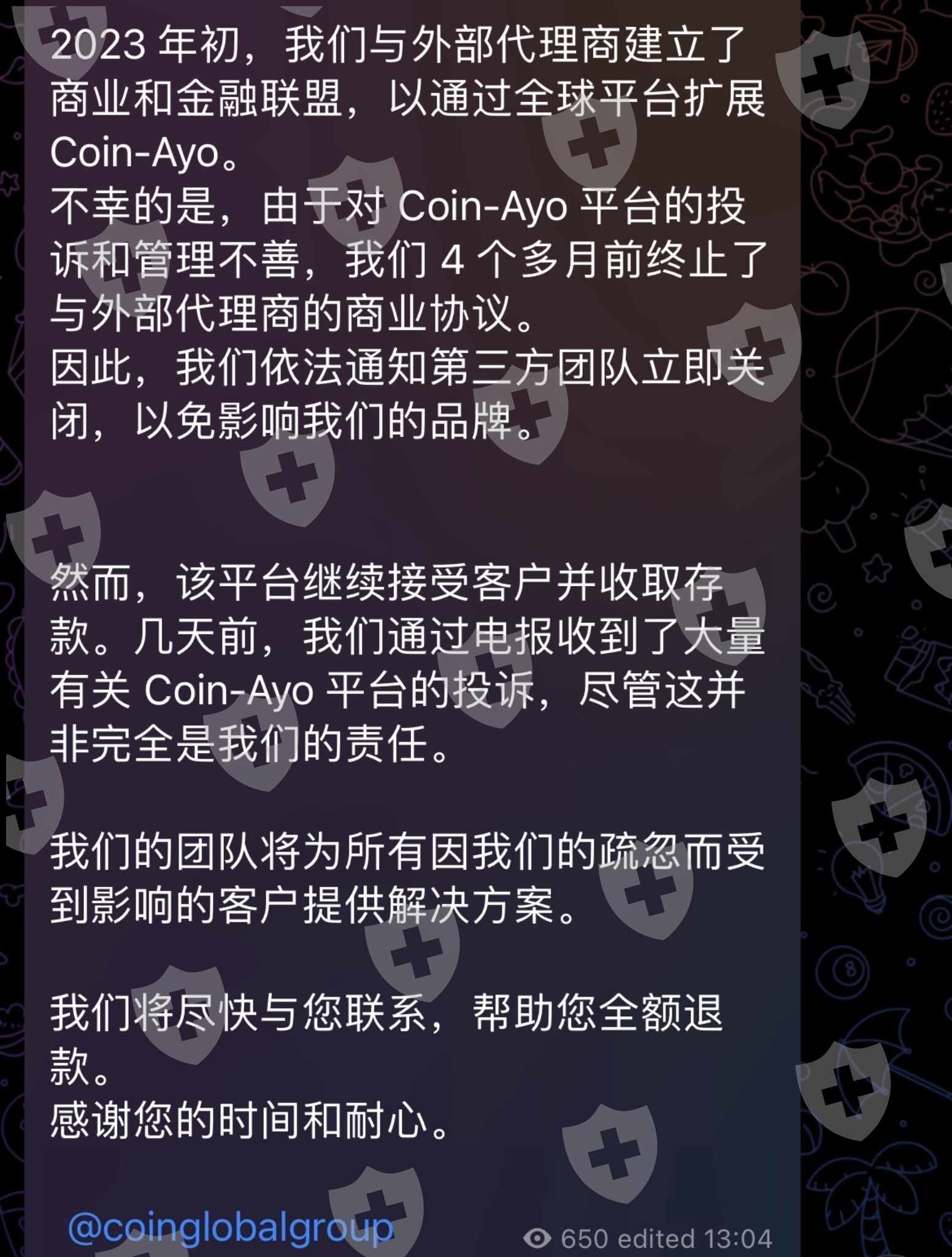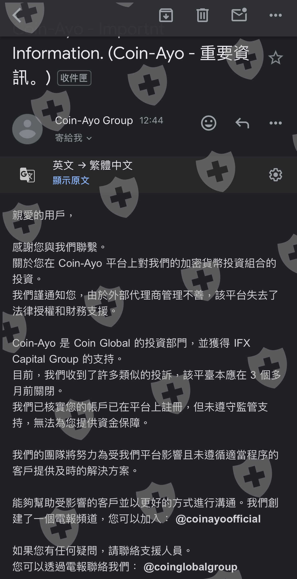 搜尋後,我找到了Coin-ayo群組,他們向我解釋說該平台應該在4個多月前關閉 !