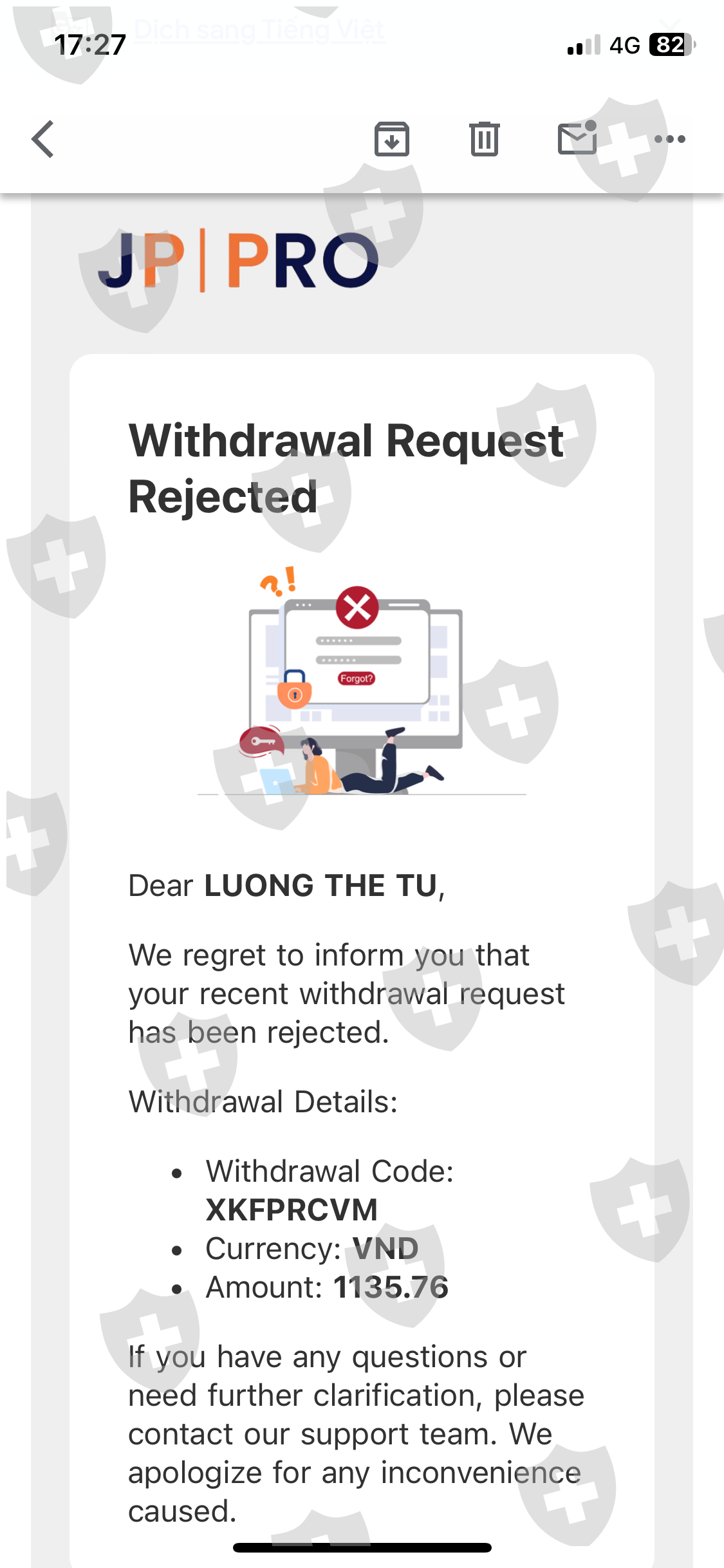 Jppro.com在我的mt5账户406105中欺诈并占用了我的资金。该平台是不道德的。我向警方、国际金融机构以及越南举报了他们占用资金、在mt5上欺诈性调整价格、欺骗客户的行为;为了阻止他们在越南继续操作并且有不道德的占用客户资金的行为,该交易所在我提款时故意取消了提款订单,比如594美元、1135美元的提款订单被取消并且不允许提款。允许交易所员工干扰并对交易客户造成损害。这一事件导致jppro在越南不再运营。