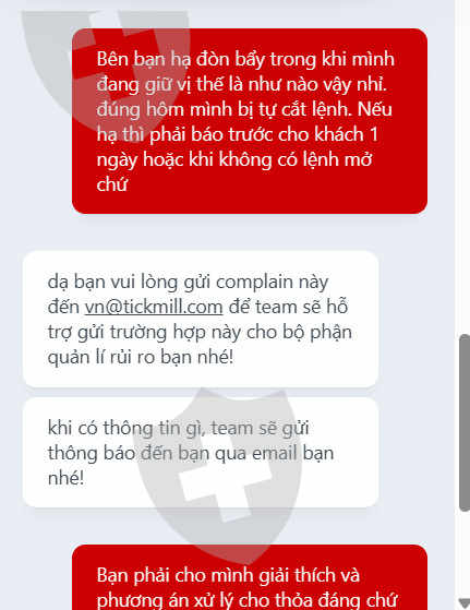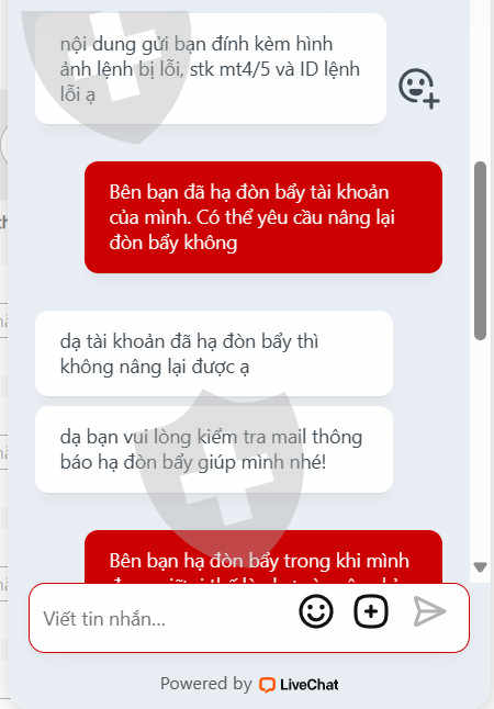 Tự cắt lệnh của khách hàng bằng cách hạ đòn bẩy. Mình đang giữ lệnh thì đột ngột hạ đòn bẩy từ 1:1000 xuống 1:50. Thế là stopout luôn. Thế mà bảo can thiệp lệnh của khách thì không chịu. Scam