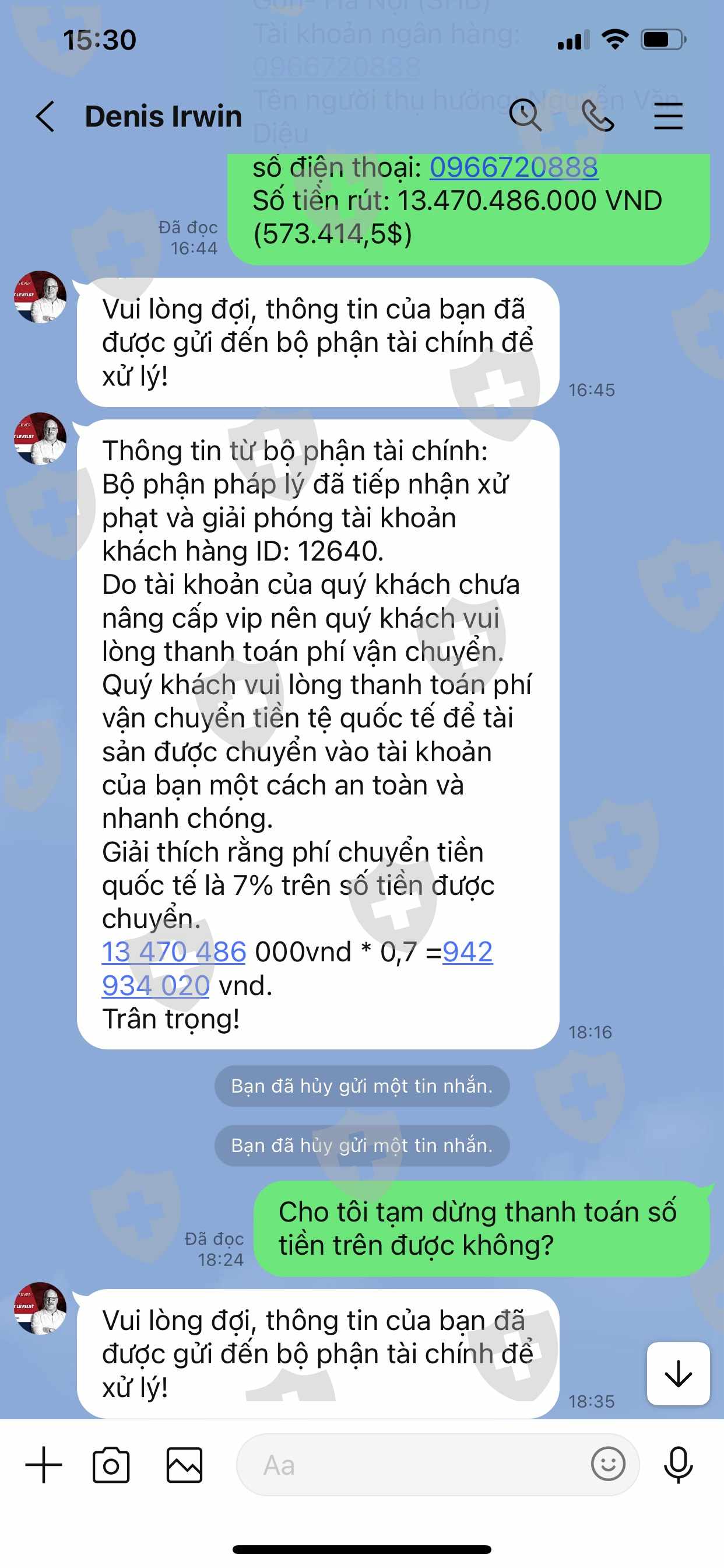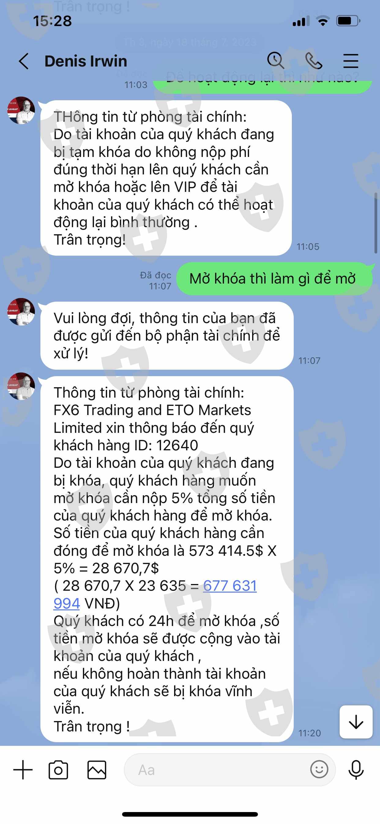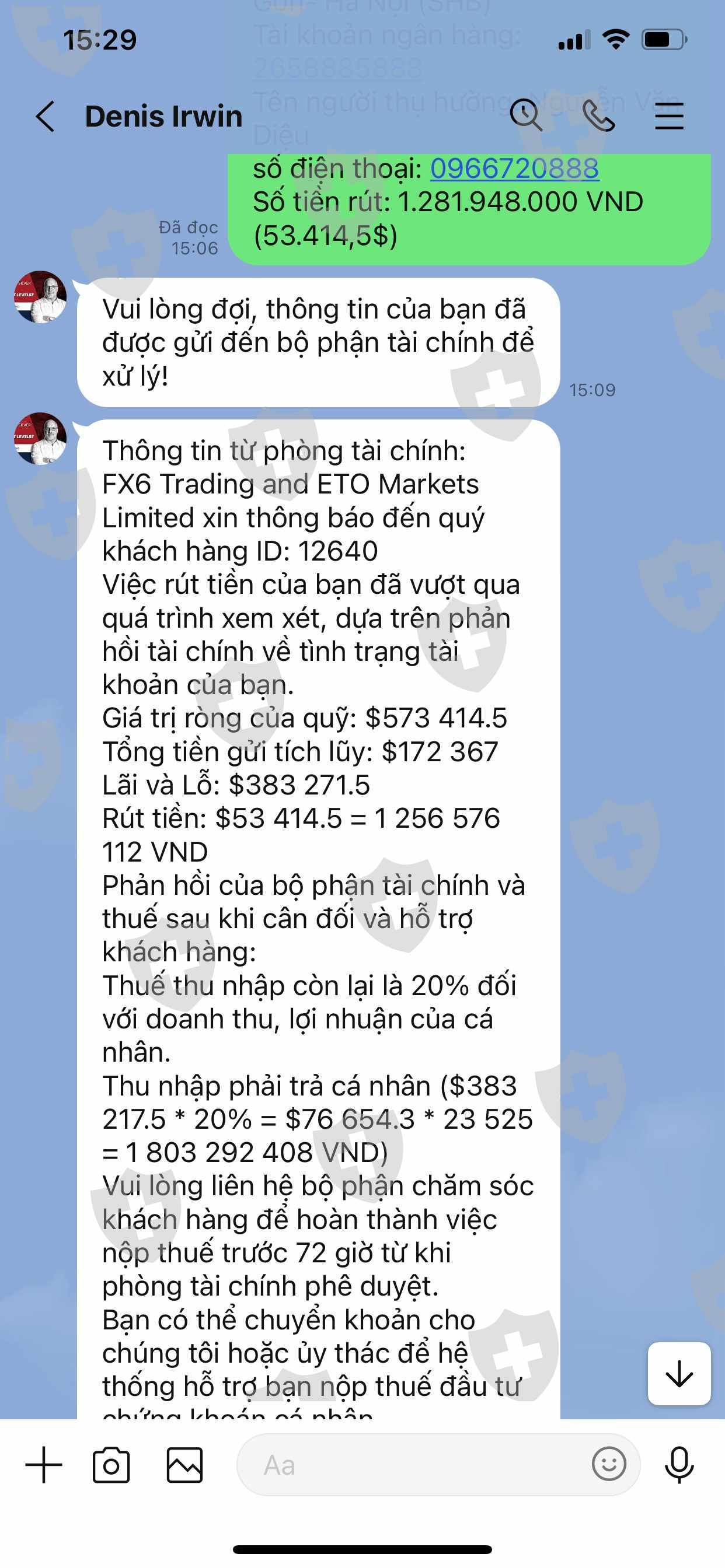 Từ tháng tháng 5 đến tháng 6 năm 2023 tôi có đầu tư vào sàn Ai TradeMateFX6 nhưng khi rút toàn bộ số tiền: 573.414,5 USDT về tài khoản thì bộ phận CSKH của sàn thông báo bắt đóng thuế 20% xong sau đó lại bắt đóng phí chuyển tiền quốc tế 7% tôi không đóng số tiền đó nữa. Đến 20/7 sàn khoá tài khoản của tôi.