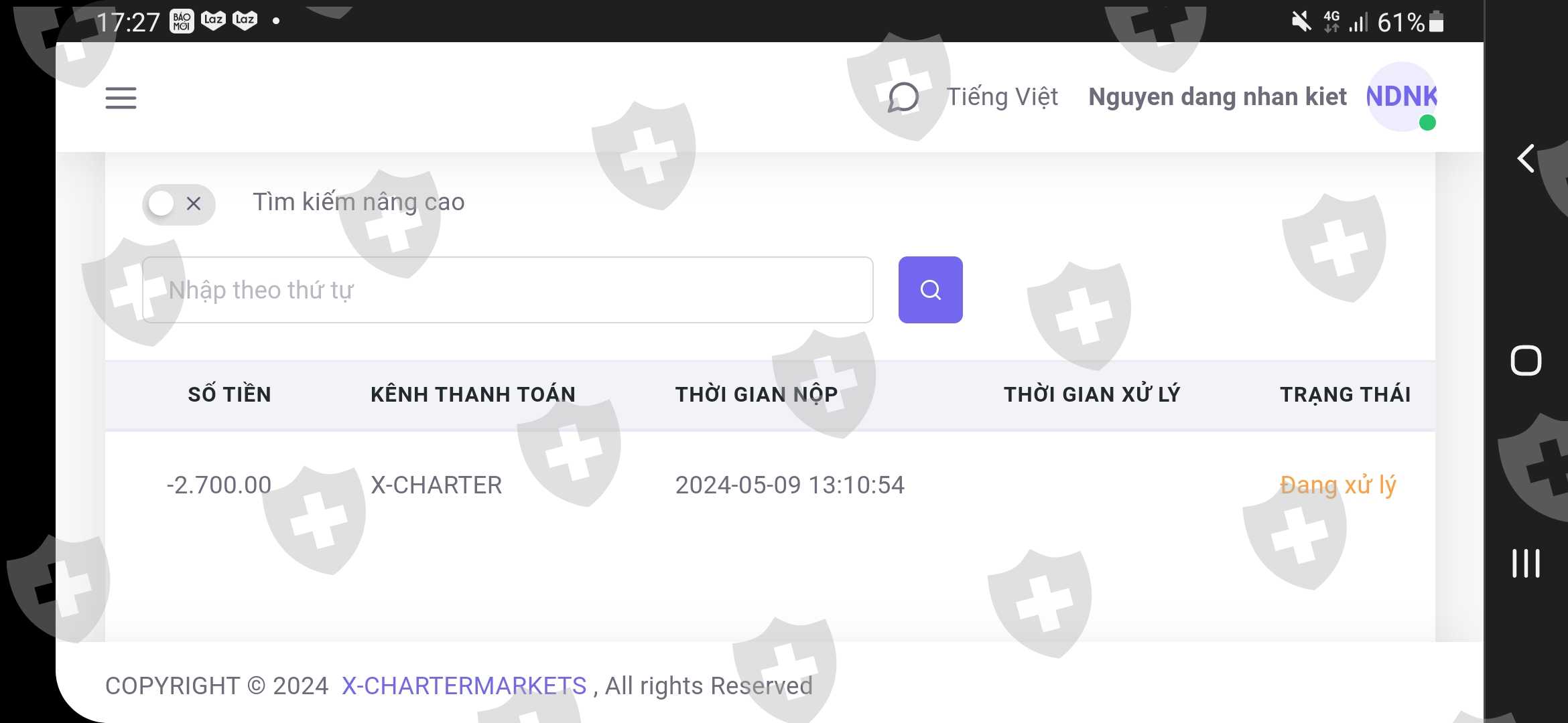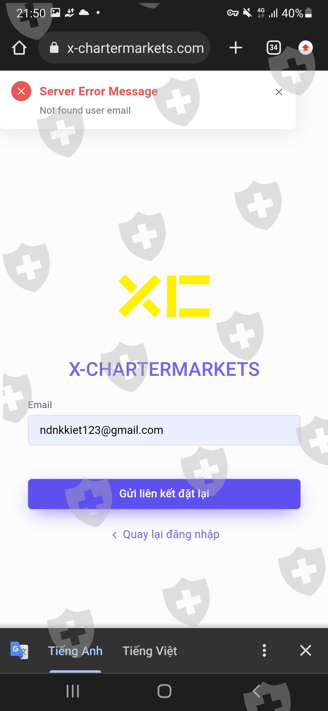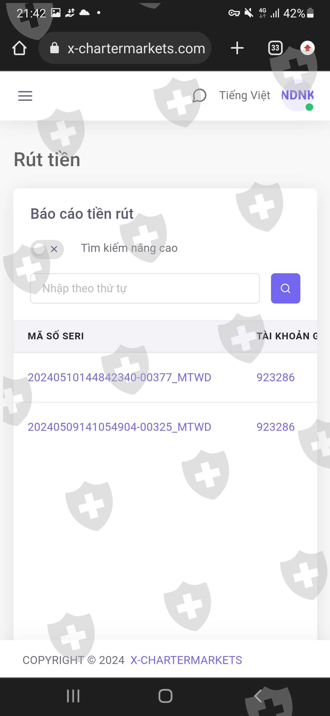 tôi đã nạp tiền vào sàn x-charter 2 lần mỗi lần đều 2k$ . 1 lần tôi đã cháy , lần 2 tôi lời 3708.40. nhưng khi tôi đặt lệnh rút lợi nhuận thì bị hủy không lý do . tôi đã cố gắng liên hệ với sàn qua email nhưng không được hồi đáp . bây khi vào trình duyệt để kiểm tra tài khoản thì không bị báo tài khoản không tồn tại . tôi có quyền nghi ngờ sàn x-charter lừa đảo tiền củ tôi .