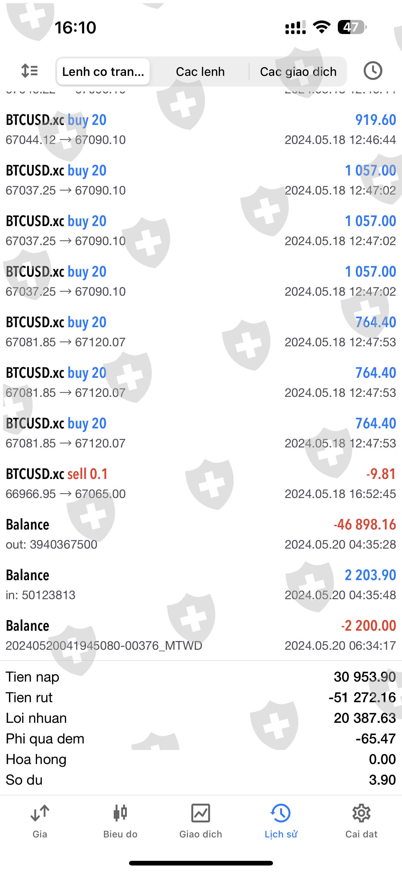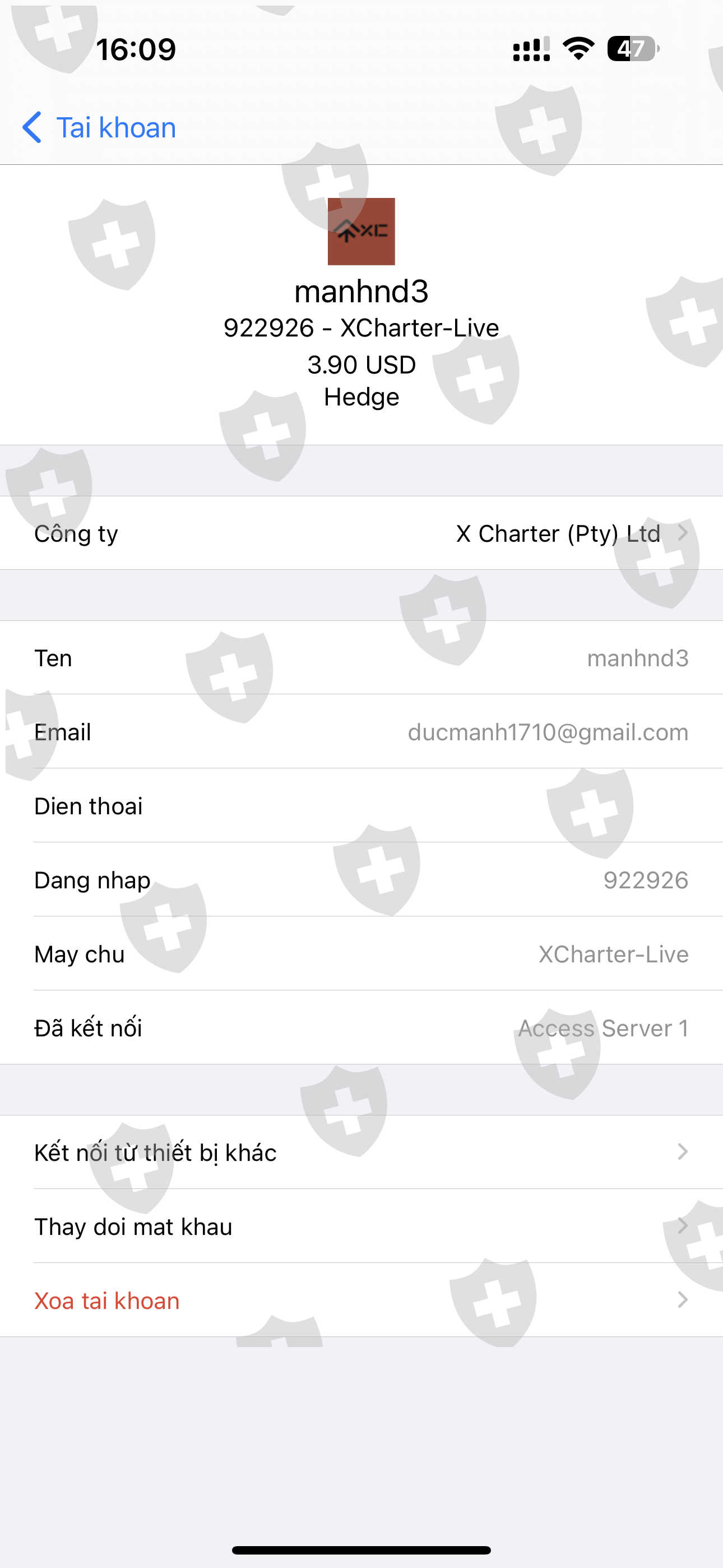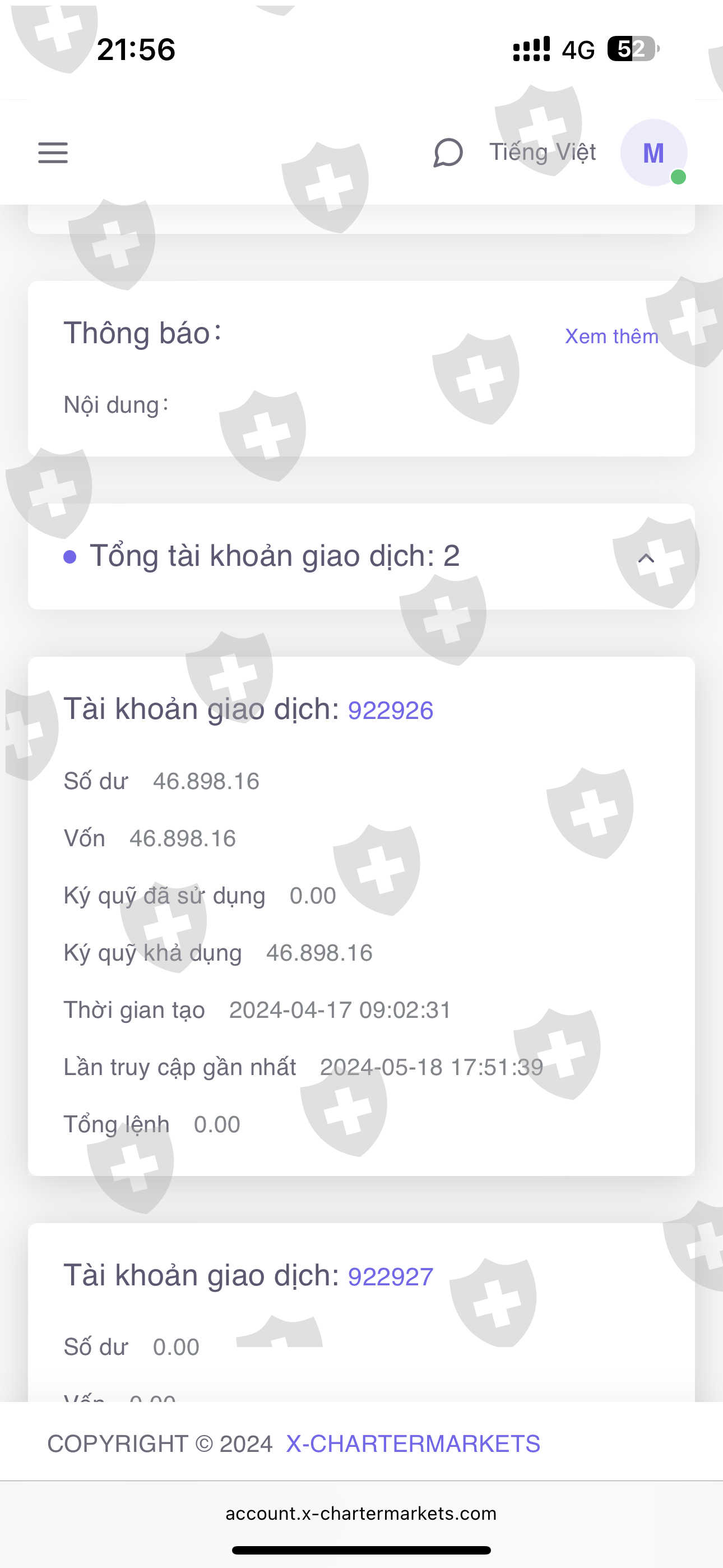 Tuy nhiên đến ngày 20/05/2024 tôi có phát hiện ra sàn X Charter có tự ý trừ số tiền 46 898.16$ của tài khoản 922926 của tôi mà tôi không nhận được bất kỳ hỗ trợ hay thông tin nào từ sàn giao dịch.