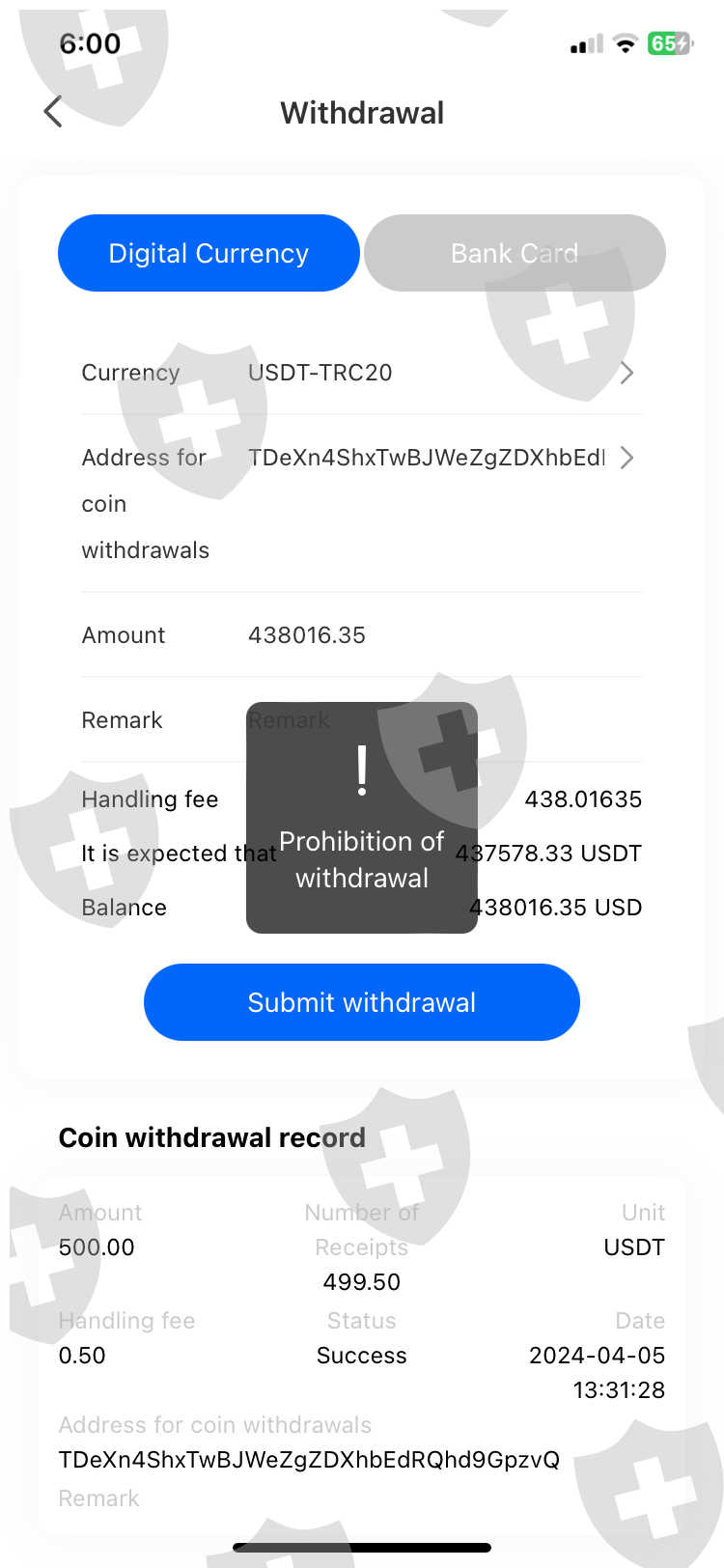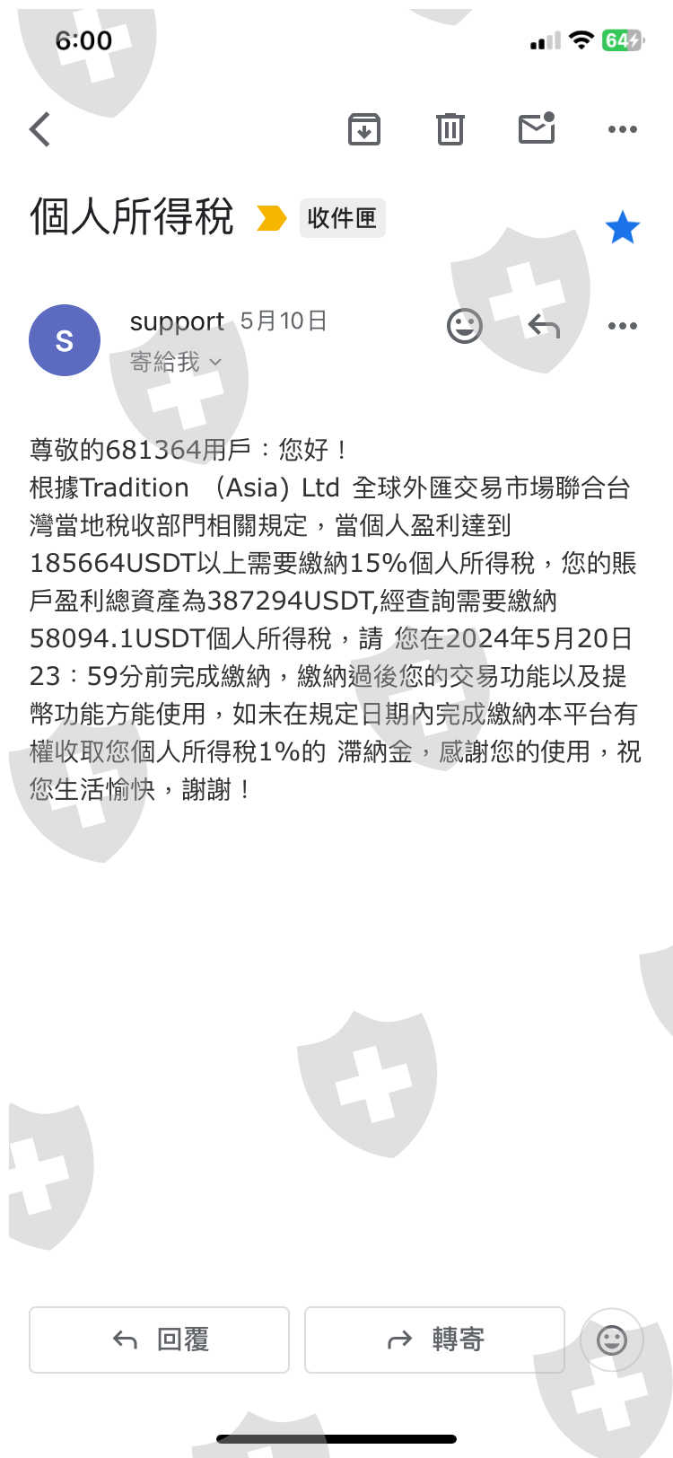 謊稱因獲利超過USDT185664,需繳交15%個人所得稅,並限制出金!