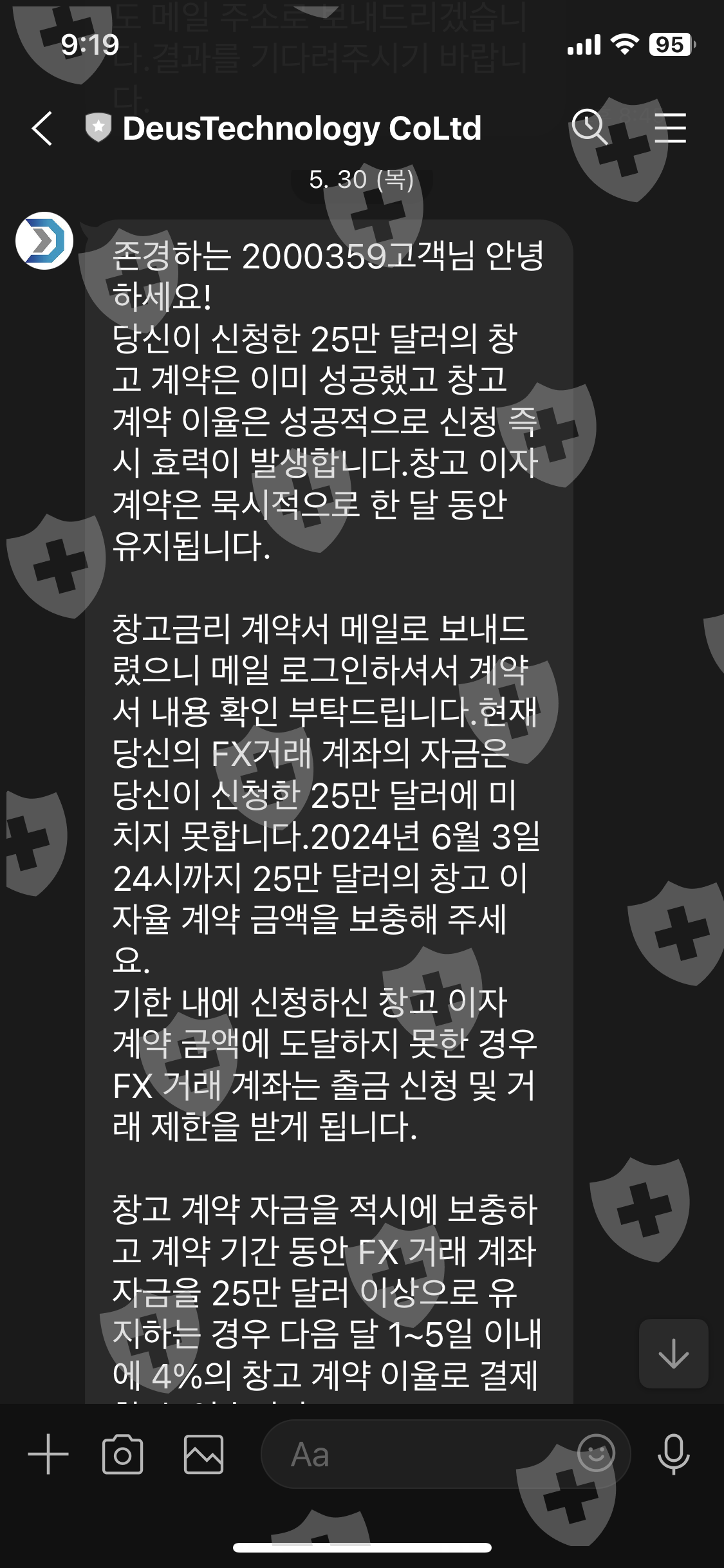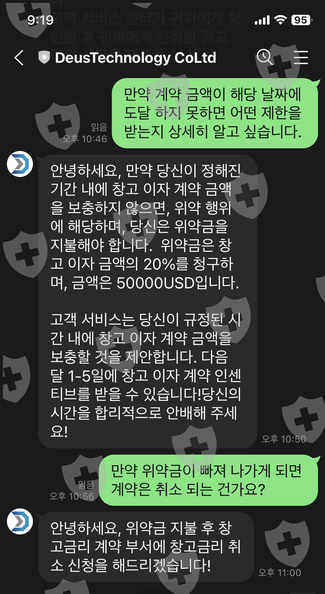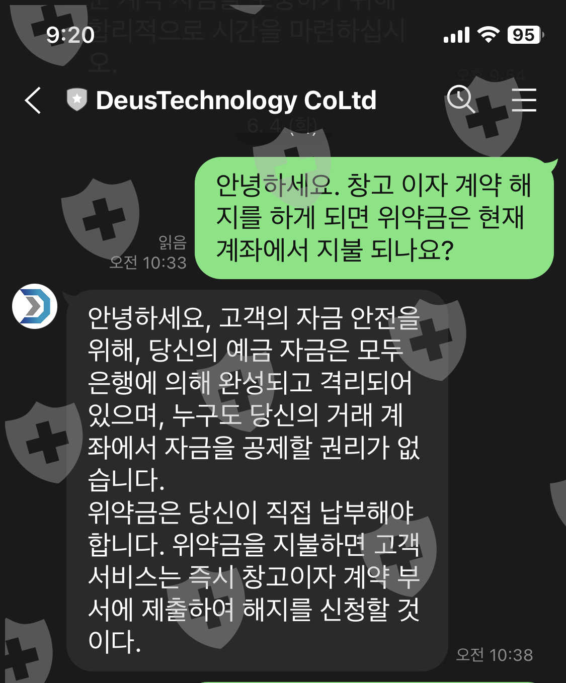 창고 이자 계약 사기를 당한 것 같습니다. 도와주세요.창고 이자 계약을 신청 하고 싶다고 하니 계약서나 신청서 동의나 사인 없이 계약을 진행 되었고,계약을 신청 시 신청서 및 계약 약정을 고지를 하지 않고 일방적으로 계약이 완료 되었다는 통보를 받았습니다.이에 대해 계약을 취소 철회 하려고 하니 고객센터에서 사전에 고지 되지 않은 약정 등을 사유로 취소 시 현재 계좌의 자금이 아니라 추가로 위약금을 지불해야 거래 및 입출금이 가능 하다고 합니다.예금 자금 모두가 은행에 격리 되어 있어서 저의 계좌에 있는 자금으로 위약금을 지불 하려고 하니 안된다고 합니다.계약서나 신청서에 본인의 동의나 사인 없이 계약이 진행 된 것에 대해 위약금을 지불 하여야 하는지 또한 궁금합니다. 위약금을 지불 해야 한다고 하면 현재 계좌에서 지불이 가능 한지 알고 싶습니다.도움의 손길이 절실합니다.
