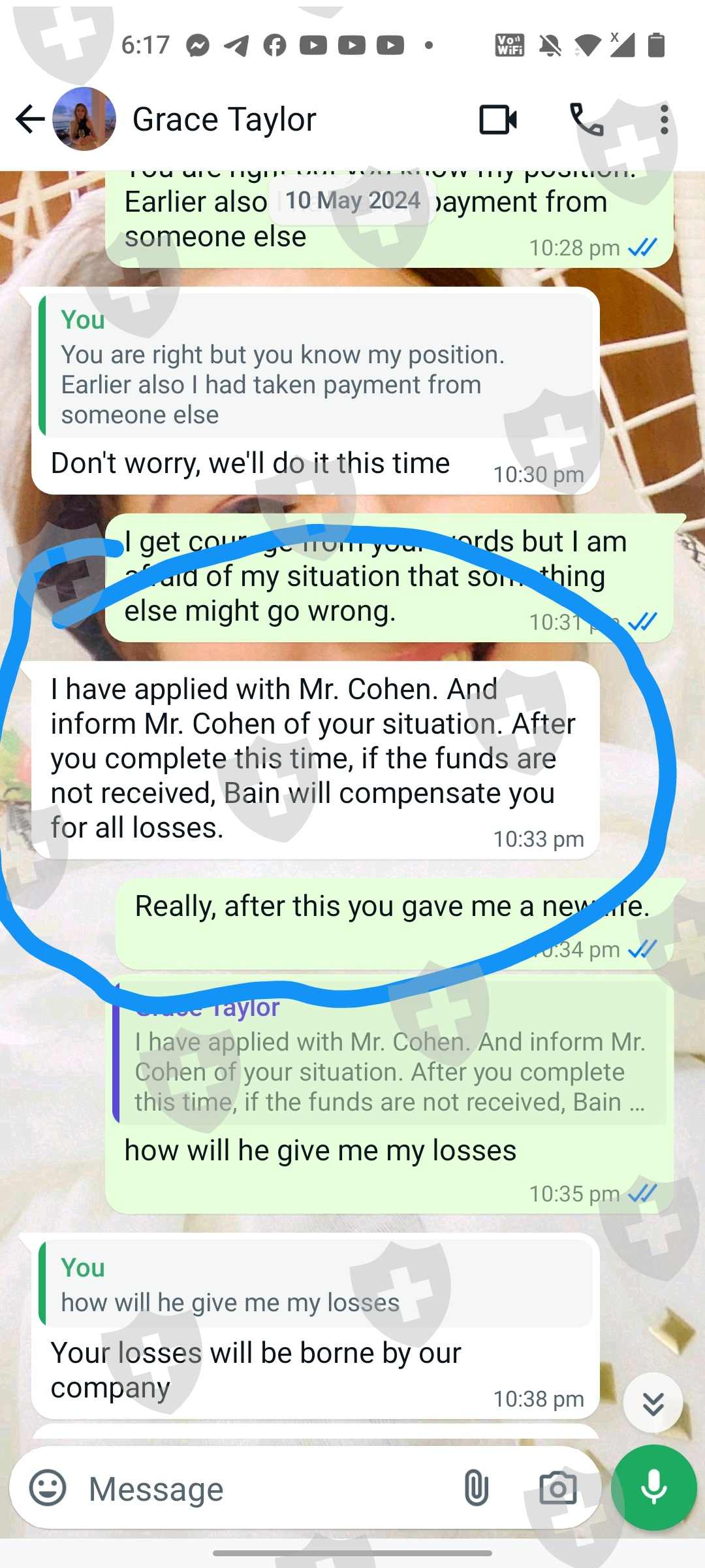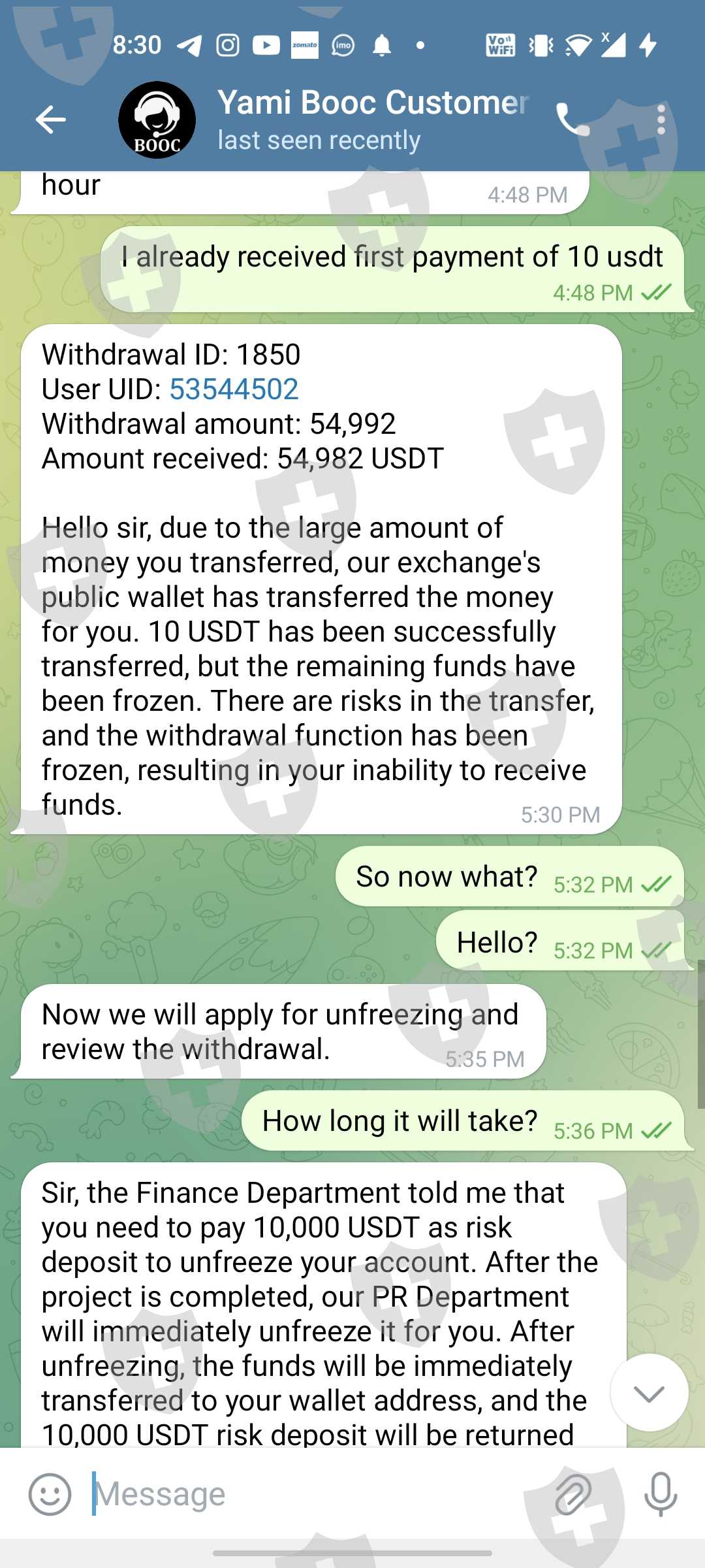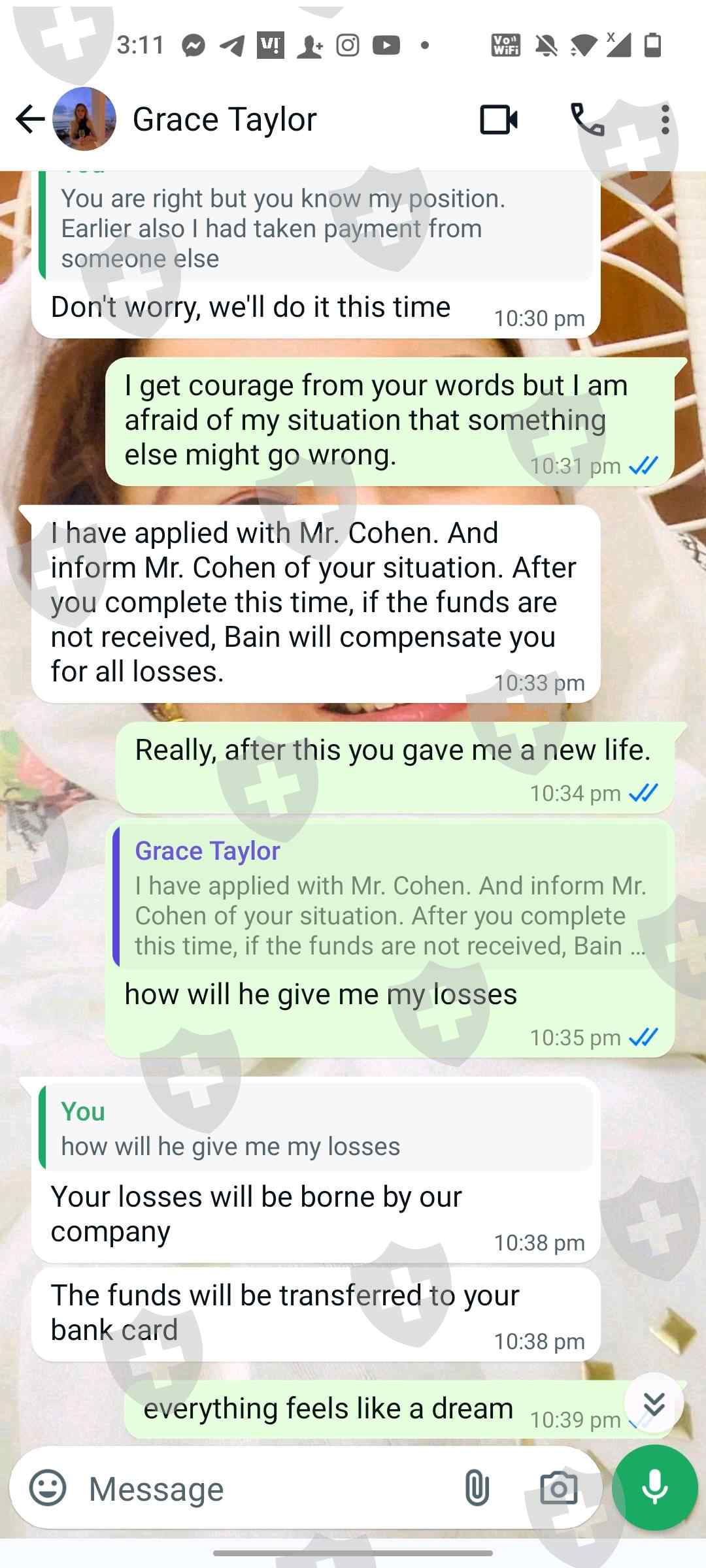 您将无法提取您的资金,他们会要求您支付手续费,支付手续费后,他们会告诉您您的账户被冻结,因此您必须支付另外的费用来解冻您的账户。他们会要求越来越多的钱,但您将无法提取您的资金,他们破坏了许多WhatsApp群组,包括bain capital ventures经纪人Grace Taylor,他们在booc平台上交易,甚至booc客服也不会回答您,这意味着他们都在一起破坏这个骗局。所以,请大家注意这个骗子。