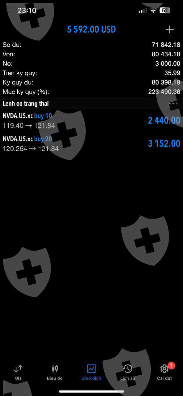 khi tôi vào lệnh vào ngày 07/06/2024 mua 3Lost NVIDIA đến ngày 10/06/2024 tài khoản tôi bị âm trạng thái 298076.38USD tôi cảm thấy tài khoản của tôi bị tác động bởi sàn giao dịch X Charter vào lúc 23h13 phút, tôi có vào tài khoản của tôi, tôi thấy bên sàn có cộng vào tài khoản của tôi 25000USD và tự ý giao dịch tài khoản của tôi 30Lost NVIDIA.