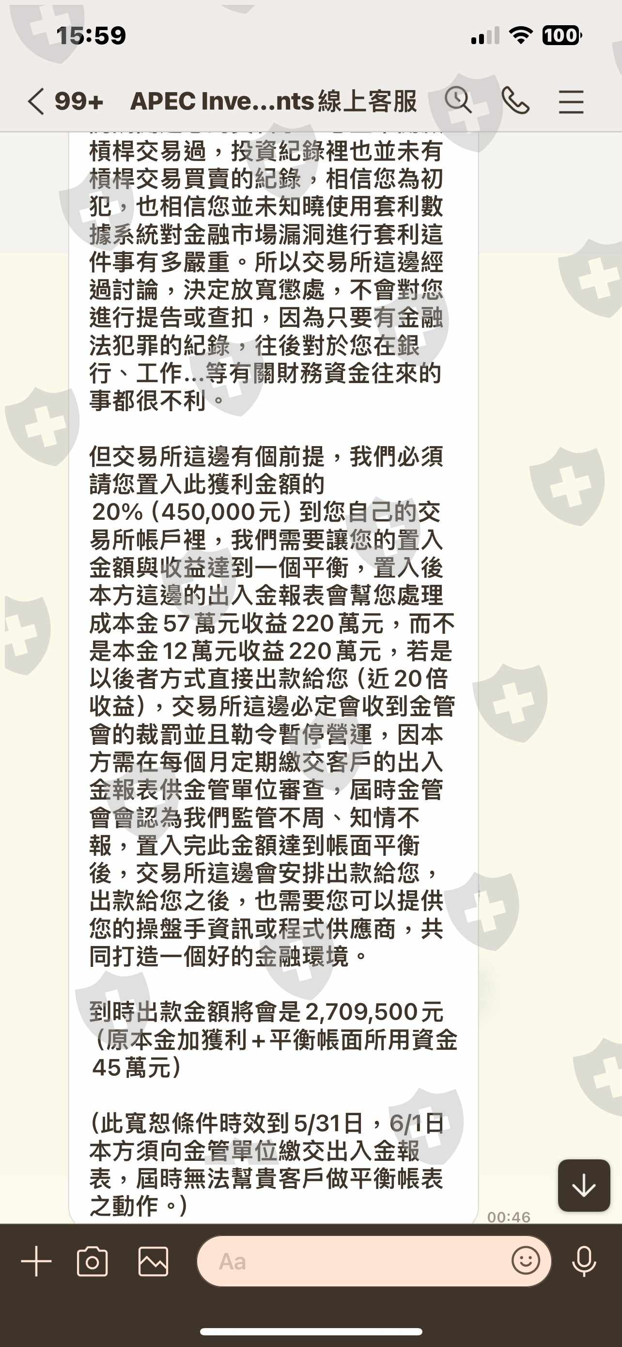 我在Facebook進入了一個家庭代工群組,一開始進去看起來時蠻正當的,就一般的試吃留言喜歡什麼冰種少少賺60元。後面進入了一位稱講師帶我們跟單,但我還沒跟過。沒多久社團就有活動方案可以參加,我觀望了很久,發現很多人都去參加確實有領到錢,我就也跟著參加了,我就去私訊稱講師的人,說我也想參加,參加了12萬,活動方案打圖片上說不用先匯款,講師會代墊,有收益我們再歸還本金。可以選擇匯款囉門市歸還。我選擇了門市歸還,我自己以為門市歸還比較保險,都是我自己認為,一開始我的認知是他們有配合。最後我到虛擬貨幣的門市存入12萬到冷錢包,講師傳他的冷錢包地址給我,我就轉帳給他了,他收到款項之後,帶我提款,他說要私訊平臺客服確認我的款項,之後客服一連串到拖延,一下說要確認USDT夠不夠、要我螢幕錄製防洗錢、金管會要求加強審核監管之類話語⋯到最後我不知道稱講師的人用了違法的方式讓我們獲利,平台說要我置入45萬做平衡才可以讓我提領。這時我才驚覺自己被詐騙了⋯到現在稱講師的那位訊息都不回我瘋狂打電話也不接。之後那位講師有用一個群組,裡面加講師總共11位,他說他正在跟其他律師還有專業人士討論方案解決這些事情。但是遲遲都沒有消息。我就到Google查詢這個平台發現是詐騙。