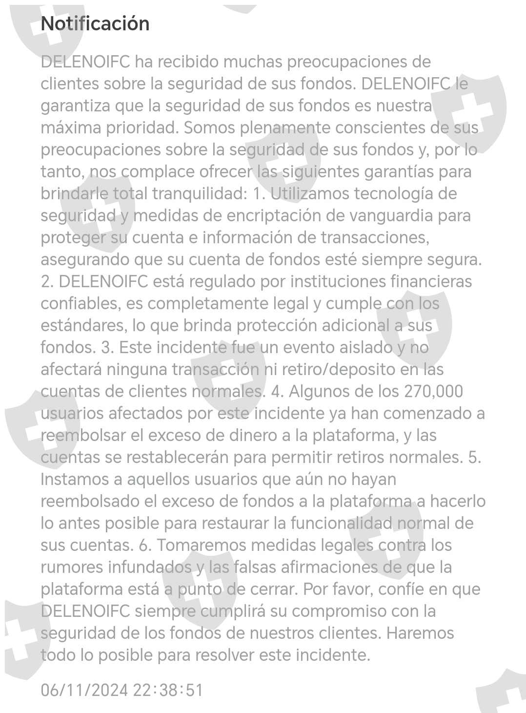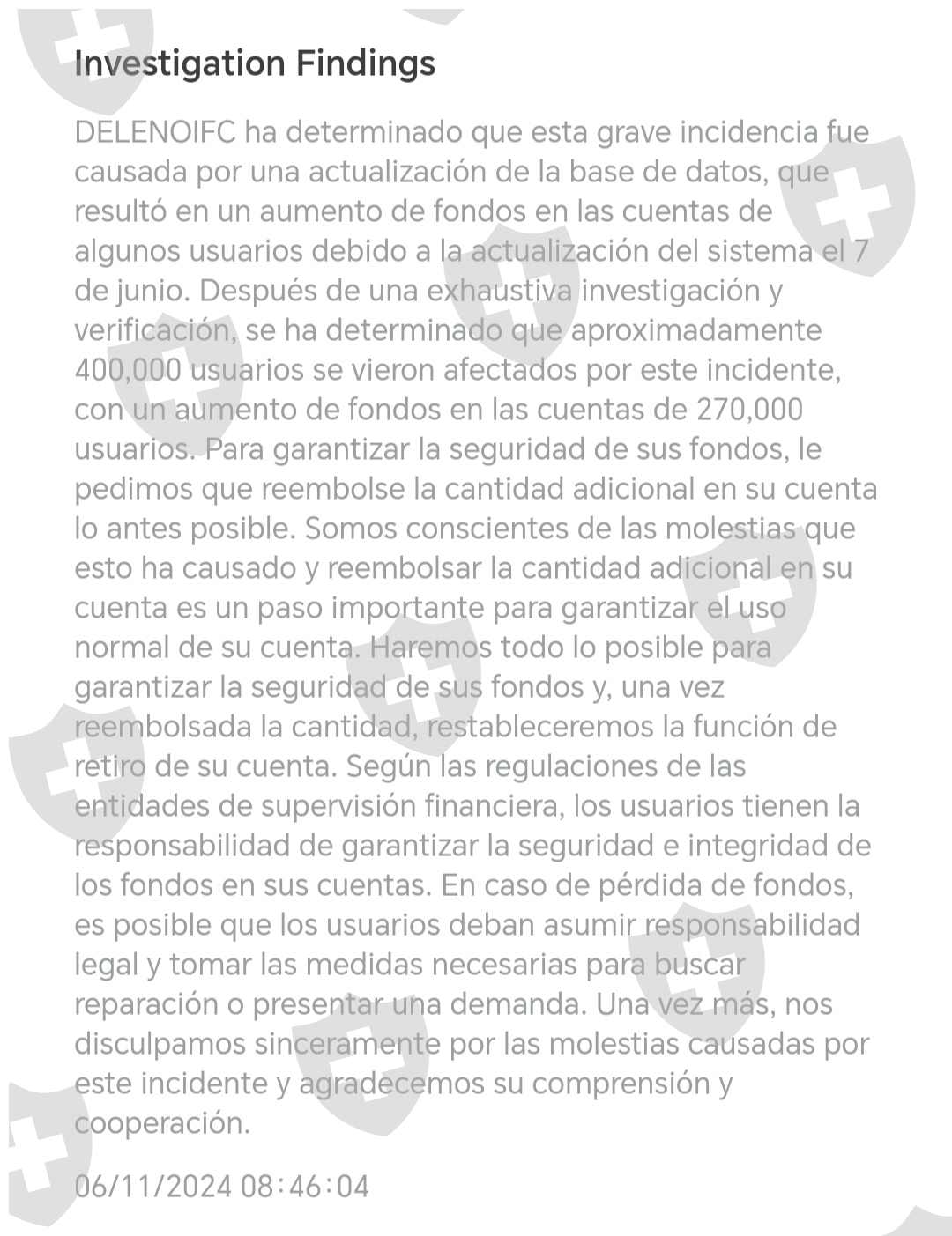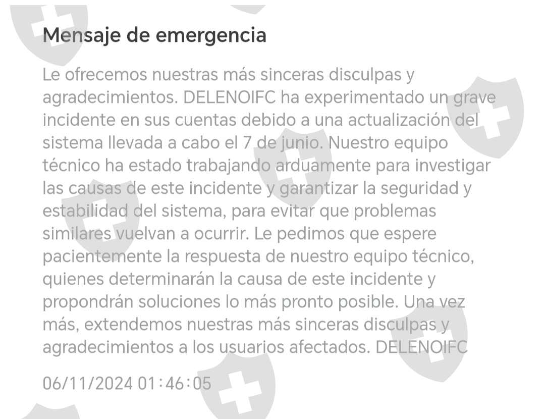我声明,在2024年6月11日,由于系统错误,Ifc在更新后向其用户的账户中存入了双倍的资金。迫使用户存入相同金额的资金以释放其余额,以便可以提取,并因此阻止了提款选项。