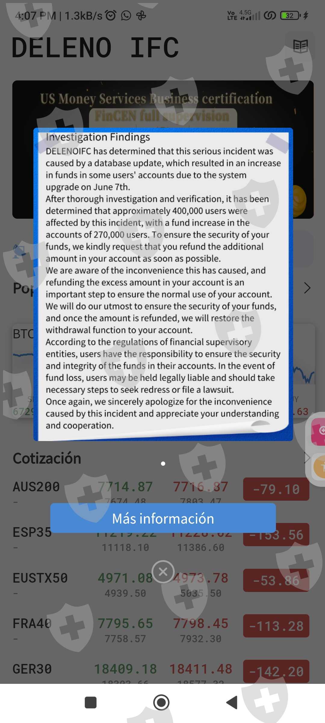 Buen dia la plataforma por error depósito a las cuentas de los usuarios el doble de lo que cada uno tenia, la solución brindada por parte de ellos, es que hagamos un depósito por el mismo valor depositado, y asi se liberen nuestros fondos, cosa que es algo inadecuada teniendo en cuenta que el supuesto erros de actualización fue de Deleno y no de los usuarios, adjunto imagenes donde deniegan los procesos de retiro y demás. pero si nos invitan a seguir operando, sin tener garantías de devolución del capital.