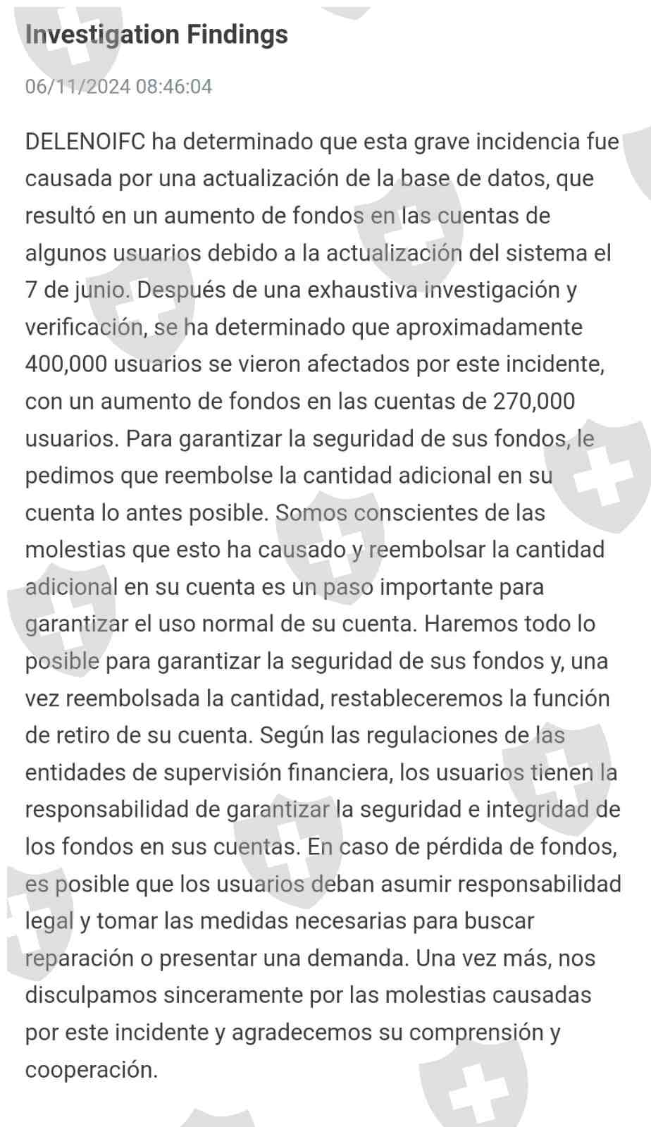 解决从账户中提取资金的问题需要花费一定的费用。在更新后,为我和成千上万的投资者拥有的货币账户价值进行了存款。自凌晨1点以来,他们通过系统进行了一笔“错误”存款,并要求存入相同金额的存款。Lugo将全部资金全部提取出来,然后最终将资金退还给Deleno IFC,因为他说这不是我们的。