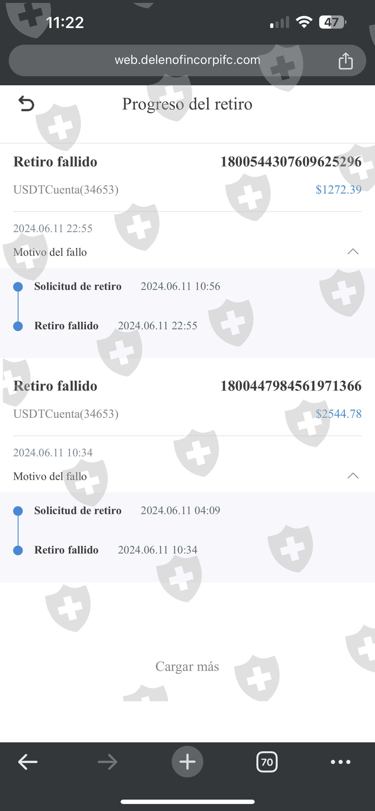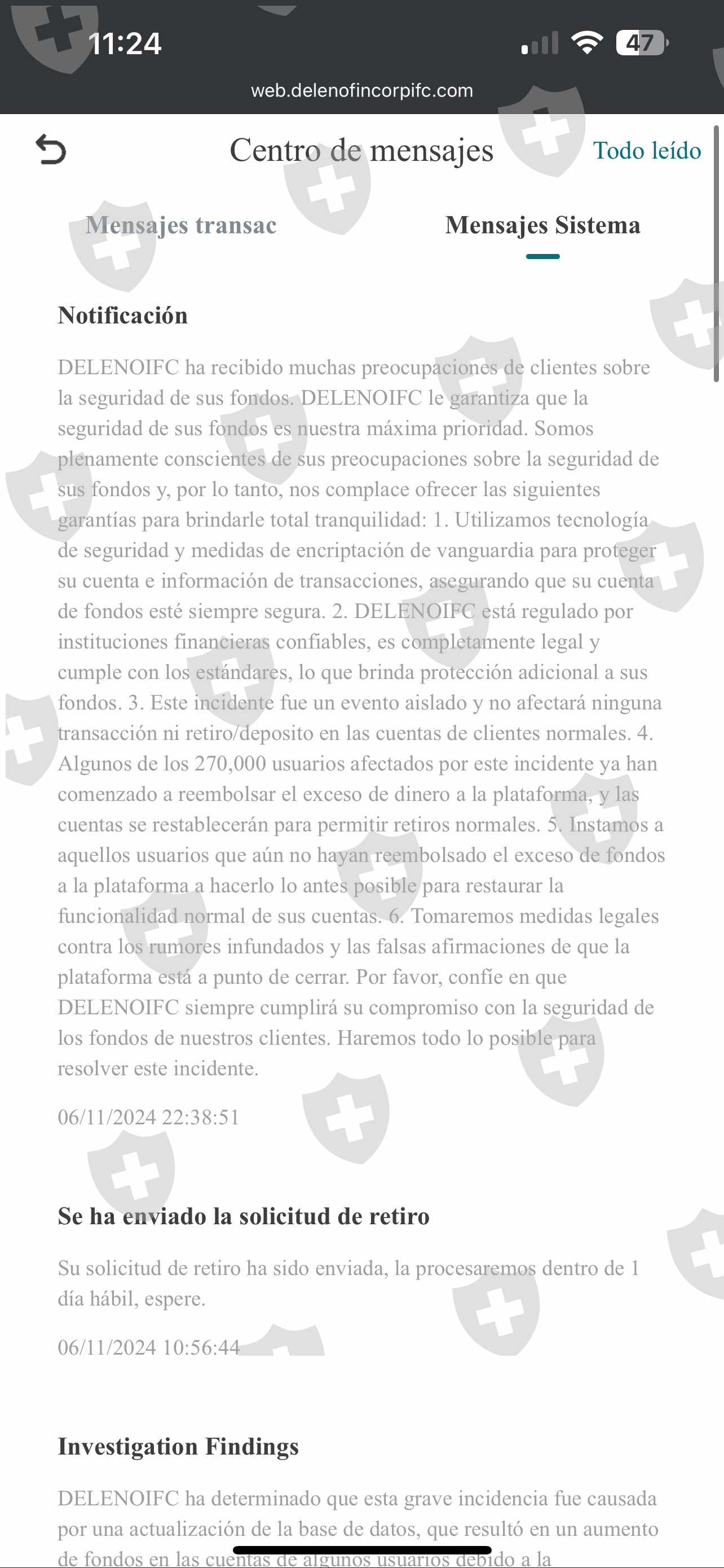 desde el día 11 de junio 2024, he tratado de retirar dinero de la aplicación Deleno IFC ya que en horas de la madrugada hubo un incidente donde informaron que a 270.000 cuentas se les aumentó el fondo, lo cual esto prendió mis sospechas, de dos retiros solicitados ambos han sido rechazados sin argumento alguno, por ende solicito apoyo de ustedes sobre esta novedad presentada , adjunto dejo evidencias de los retiros, alertas de la APP, y pantallazos de los fondos de mi cuenta el real y el duplicado