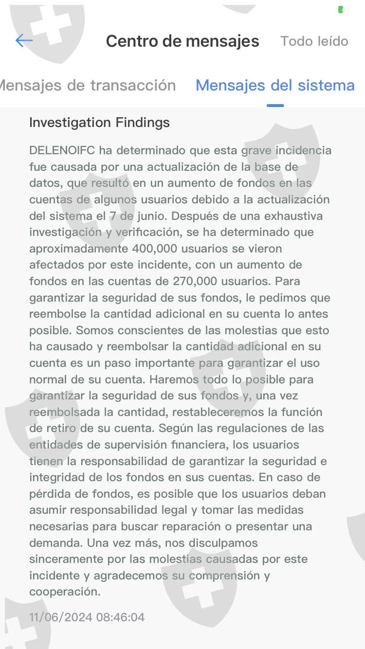 En este momento DELENO IFC no está permitiendo retirar el saldo de las cuentas supuestamente por un error de actualización y por dicha razón ya no te permite retirar a menos que deposites más cantidad de dinero según ellos es un total fraude y muchísimos usuarios han salido perjudicados con esto lo cual indica que DELENO va a desaparecer y en este momento ya no está en funcionamiento, nadie te da respuesta de absolutamente nada y según la licencia de regulación tenías un monto de reembolso de hasta 2.000 USDT lo cual es falso porque en este momento nadie te da respuesta sobre el dinero