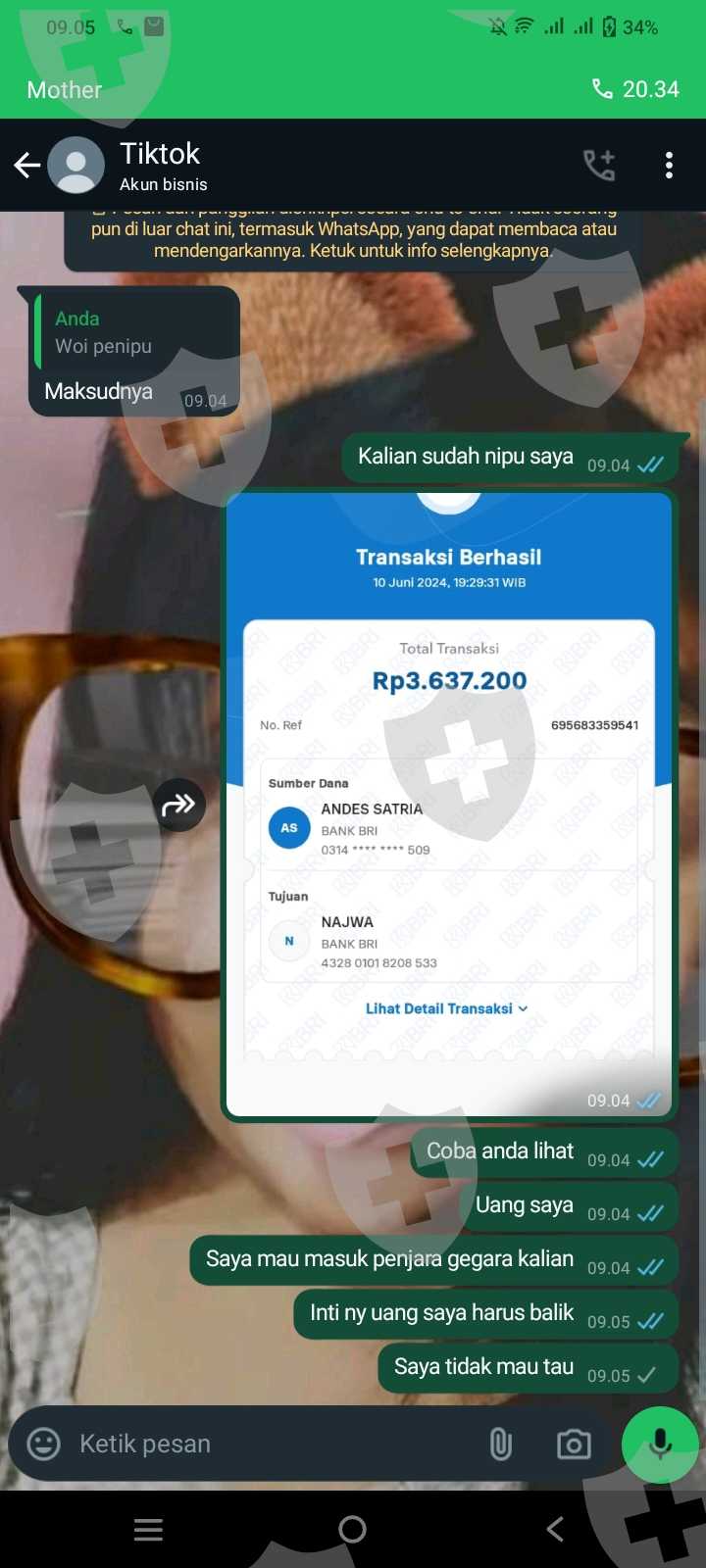 首先,我从TikTok上看到,30万的资本可以产生双倍的收入,我通过TikTok应用进行了聊天,之后管理员发送了一个WhatsApp号码,号码是+62 822-4537-9742,我通过WhatsApp进行了聊天,他们发送了一个资本收据,我选择了30万印尼盾,可以兑换成200万印尼盾,之后我进行了一笔30万印尼盾的交易,然后我将其发送给了管理员,管理员说要确认给付款方,之后我发送了30万的交付证明,然后付款方说我必须进行一笔552,729印尼盾的交易,我先发送了40万印尼盾,付款方说必须与指定金额相符,我又发送了152,729印尼盾,我进行了交易后,付款方说必须与指定金额相符,我又进行了一笔552,729印尼盾的交易,交易完成后,我发送了交付证明,付款方又说我必须发送753,429印尼盾,我进行了一笔753,429印尼盾的交易,之后付款方说我还必须进行一笔3,637,200印尼盾的交易,付款方说完后,我感到震惊和怀疑。我问付款方为什么要这么多,付款方说是交易税,交易税支付后,利润将自动进入您的账户,我又进行了一笔交易,之后,我发送了交付证明,之后管理员说我还必须发送另外5,046,509印尼盾来激活余额,但我不想这样做,之后我咒骂了他们,他们屏蔽了我的号码,无论是管理员还是付款方,他们都屏蔽了我的号码。
