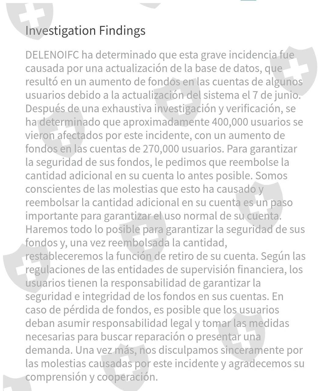 deslues de una actualización de delono el 7/06/2024. los cuales no permitieron el reriro el dia lunes 10/06/2024 aparece el doble del saldo . y envian el mensaje donde seben de rembolzar los fondos que se acreditaron de para poder relizar los retiros normalmente. haya ahora no hay respuesta del broker y los fomdos estan retenidos y no se puede reriar. solicto amablemente si ayuda para resolver este problema