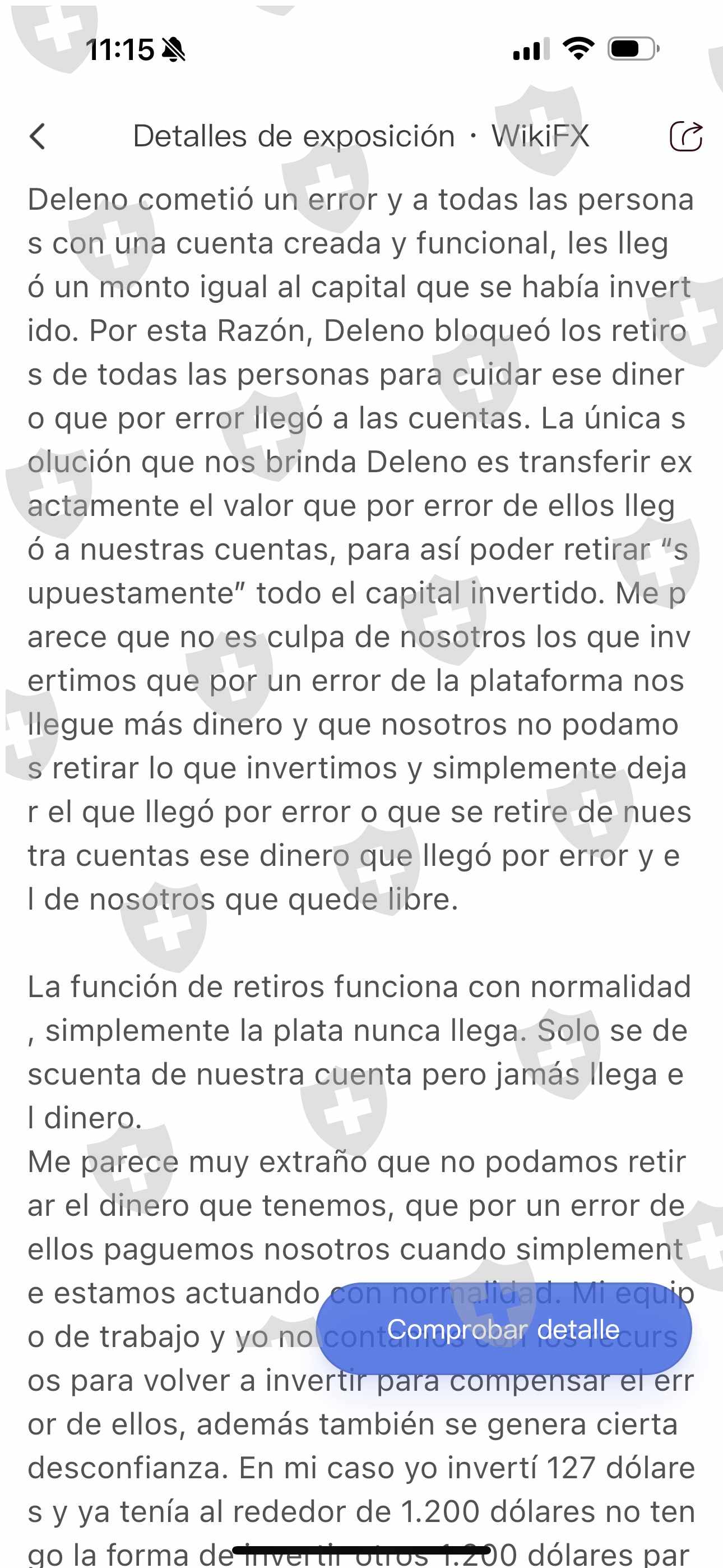 Deleno cometió un error y a todas las. personas con una cuenta creada y funcional, les llegó un monto igual al capital que se había invertido. Por esta Razón, Deleno bloqueó los retiros de todas las personas para cuidar ese dinero que por error llegó a las cuentas. La única solución que nos brinda Deleno es transferir exactamente el valor que por error de ellos llegó a nuestras cuentas, para así poder retirar "supuestamente" todo el capital invertido. Me parece que no es culpa de nosotros los queinv ertimos que por un error de la plataforma nos llegue más dinero y que nosotros no podamosretirar lo que invertimos y simplemente dejar el que llegó por error o que se retire de nuestra cuentas ese dinero que llegó por error y que el de nosotros que quede libre.