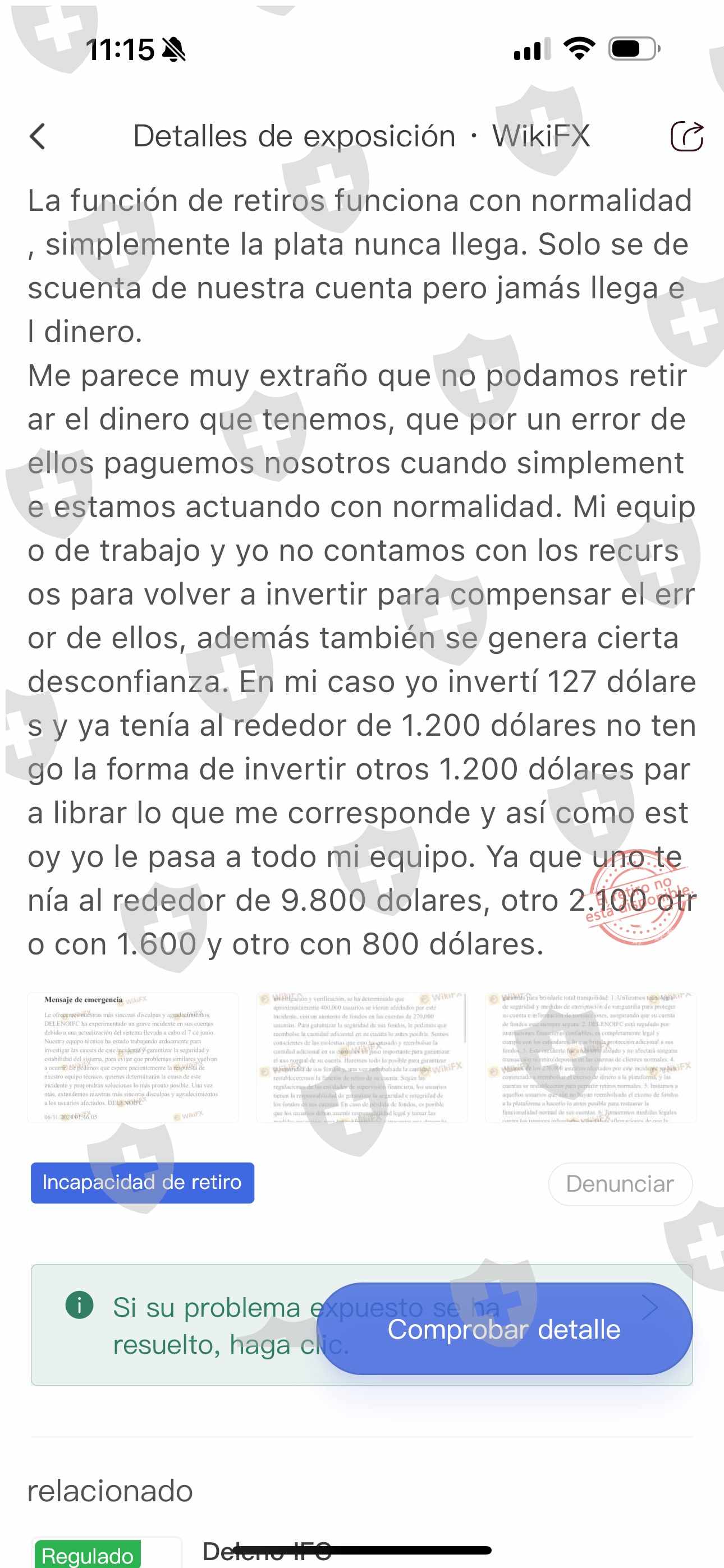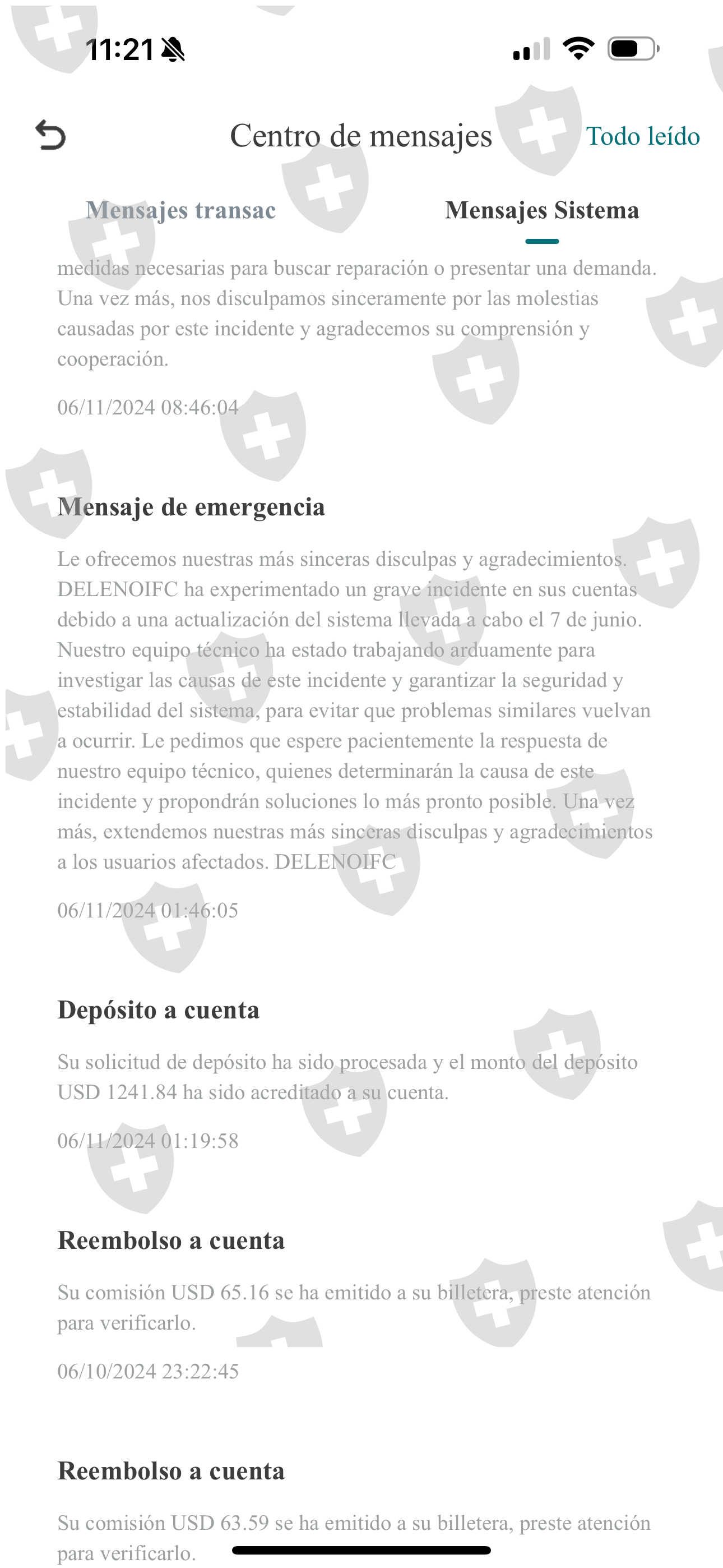 Deleno犯了一个错误,如果有的话。拥有有效账户的人收到了与投资的资本相等的金额。因此,Deleno封锁了所有人的提款,以处理意外到达账户的资金。Deleno唯一提供给我们的解决方案是将错误到达我们账户的价值转移,以“假设”提取所有投资的资本。在我看来,这不是我们的错,我们投资的人,由于平台上的错误,我们收到了更多的钱,而且我们无法提取我们投资的钱,只能留下错误到达的钱,或者错误到达的钱从我们的账户中提取。错误是他们的,而我们是自由的。提款功能正常工作,只是钱从我们的账户中扣除,但钱从未到达。我觉得很奇怪,因为由于他们的错误,我们无法提取我们的钱,当我们只是正常行事时,我们付出了代价。我和我的团队没有资源再次投资以弥补他们的错误,也会产生一定的不信任。在我的情况下,我投资了127美元,我已经有大约1200美元。我没有办法再投资1200美元来释放属于我的东西,就像我一样,我的整个团队也是如此。因为一个人大约有9800美元,另一个人有2100美元,另一个人有1600美元,另一个人有800美元,正如你所看到的,货币账户是我的真实价值,而基金账户是额外到达的价值。