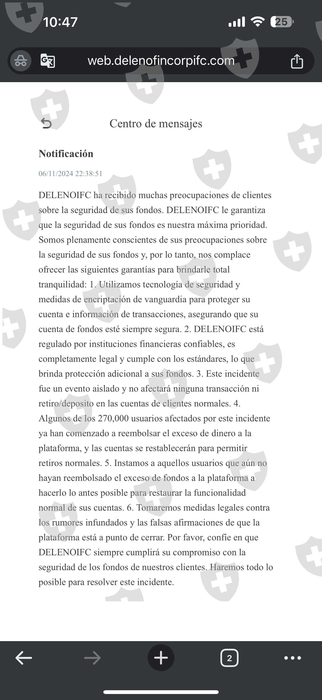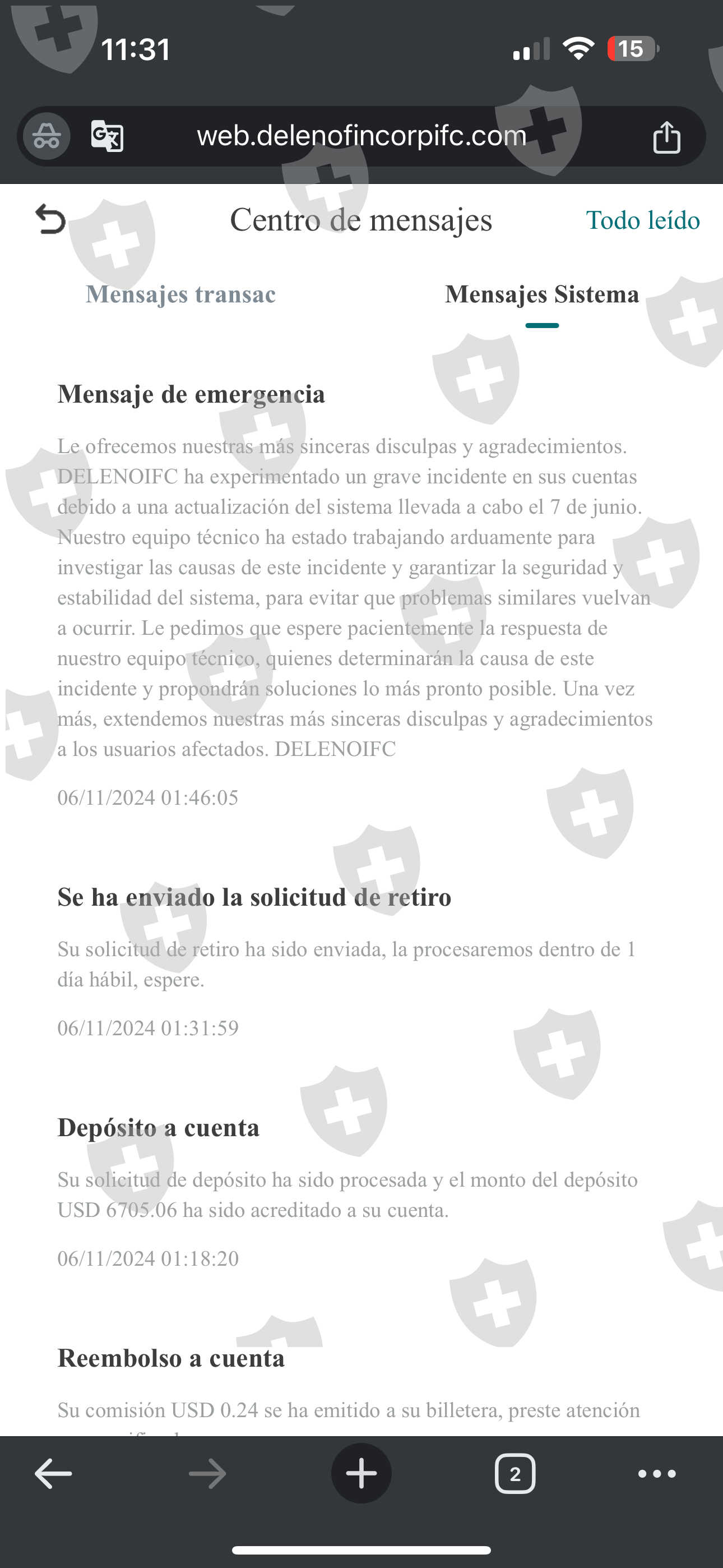 El 7 de julio Deleno tuvo una actualización que tuvo un error y el lunes a la 1 de la mañana nos llegó una cantidad inmensa de dinero, la cual dicen que debemos depositárselas a la plataforma para poder retirar, cosa que creo que es muy injusta ya que muchas personas no contamos con toda esa cantidad de dinero para depositar, en el momento tengo ese dinero que enviaron en fondos esperando que lo descuenten pero dicen que ellos no pueden descontarlos por sí mismo pero no nos deja retíralo para mandárselos y ahí está nuestro capital congelado sin poder hacer retiros, porfavor espere que WikiFX pueda mediar por nosotros y ayudarnos a tener una solución razonable.