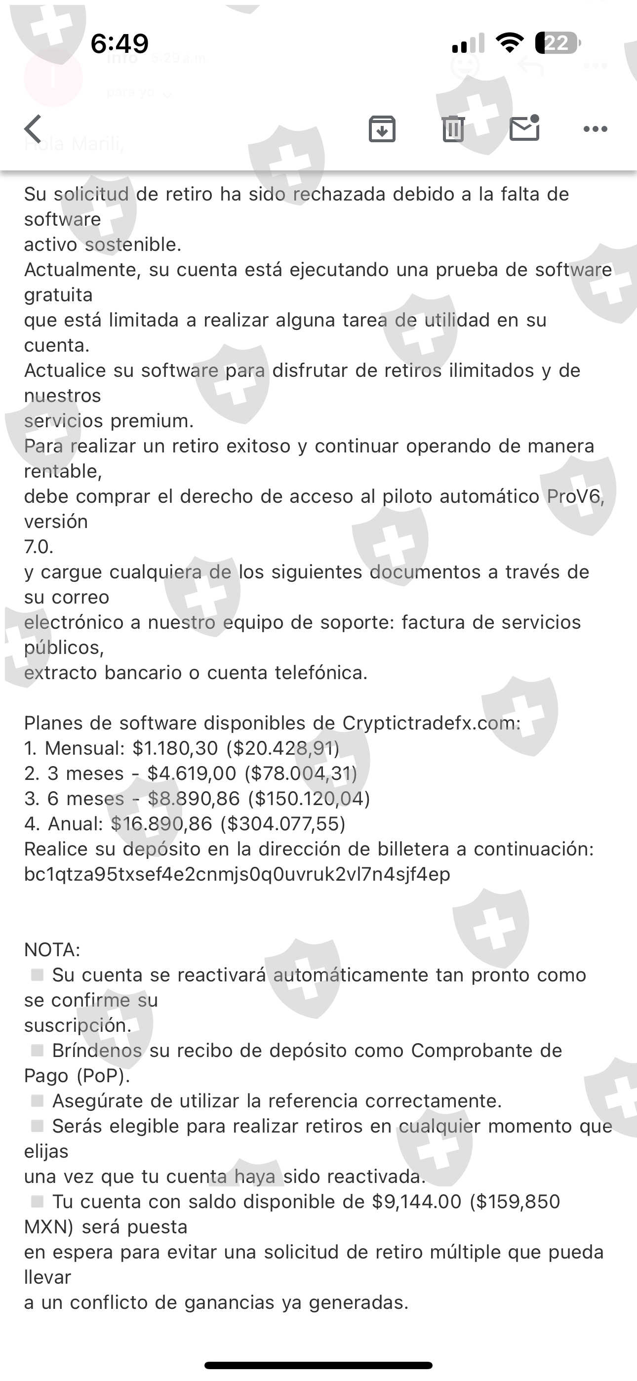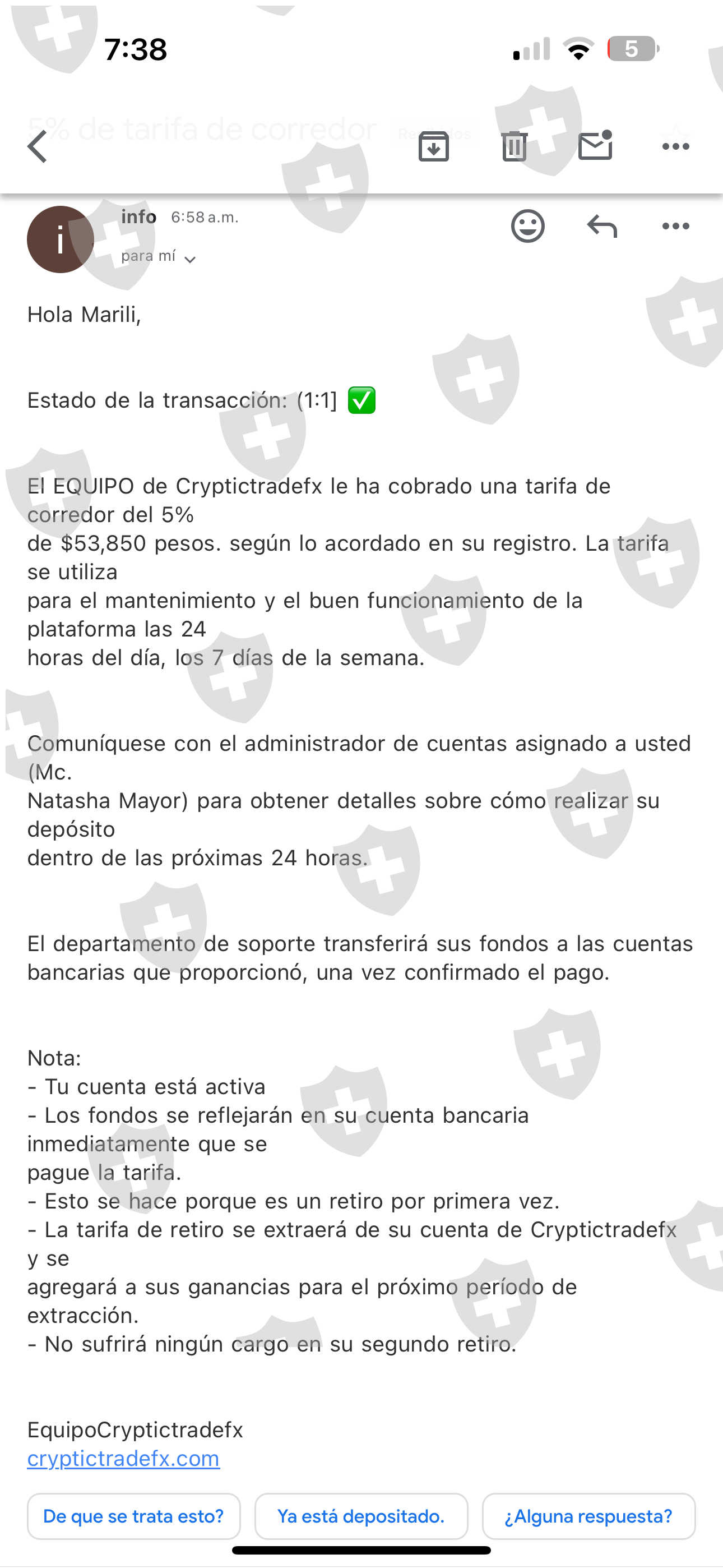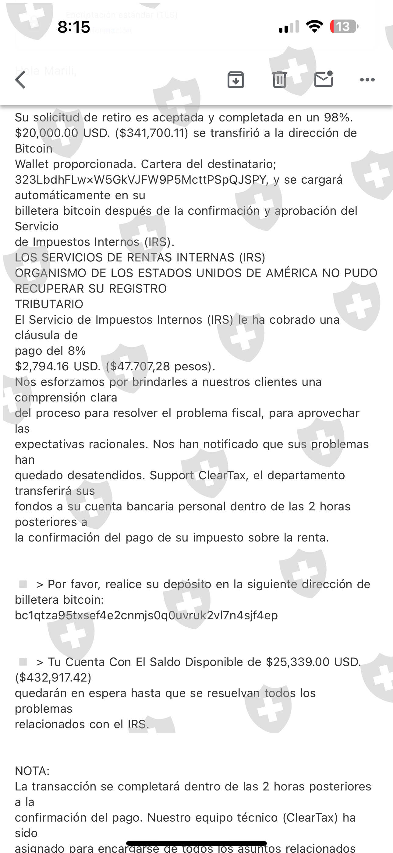 después me pidieron pagar una cuota minera,un software,el pago de IRS y al final me decían que tenía que pagar mantenimiento para que pudieran depositarme