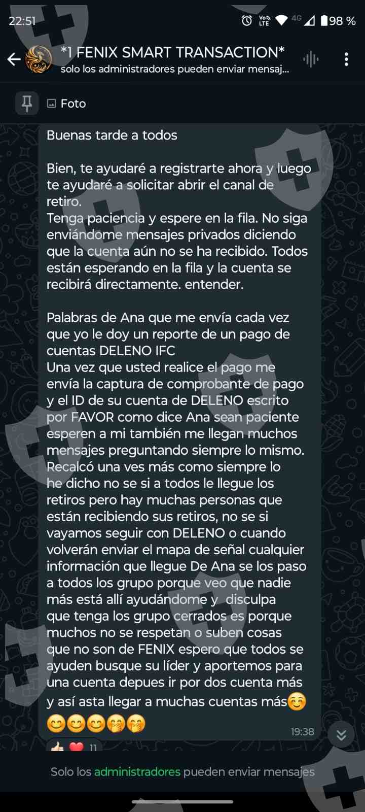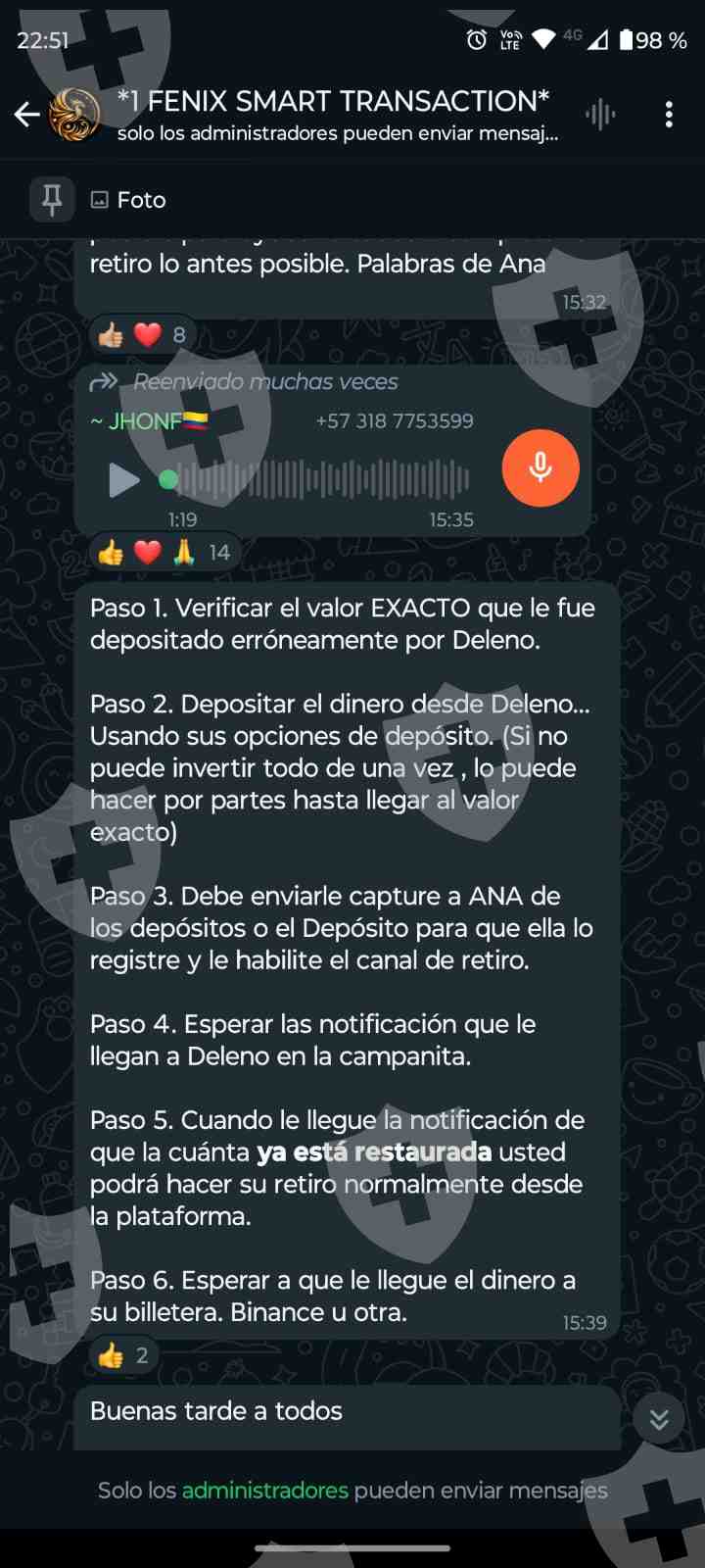 Hola, hace menos de una semana que Deleno ingreso "por error de una actualización", como le llaman ellos, un duplicado del dinero que teniamos la mayoria de usuarios en la plataforma. En mi caso, pase de tener 1074.53 a tener 2113.74 (exactamente el doble si descontamos los 17,66 de comision de mi equipo de ese dia)Desde ese dia, Deleno OBLIGÓ a depositar el excedente que ellos habian depositado "por error" para que se nos permitiera retirar nuestro dinero (fraude por retención de dinero), y con la promesa de que si "depositan el dinero, se agregarán a una lista y podrán retirar todo el dinero"Claramente Deleno puede descontar el dinero depositado "por error" o también brindar una dirección para que cada usuario envie el excedente QUE NO NOS CORRESPONDE, porque claramente no es nuestro dinero, pero no lo hace, obligando a que cada usuario deposite un dinero que no es suyo para retirar el total.En resumen, una completa estafa de la cuales se basan en que todo lo maneja una mujer de Hong Kong, cuando claramente lo esta manejando un equipo de Colombia organizado para estafar a la gente.Esperamos poder tener una solución o una manera de reportar a este tipo de gente para que la gente pueda recuperar su dinero o intimar legalmente a los responsables de esta farsa. Desde ya, muchas gracias, adjunto fotos de pruebas. (Tambien la cara de los estafadores e intimadores de esta estafa).
