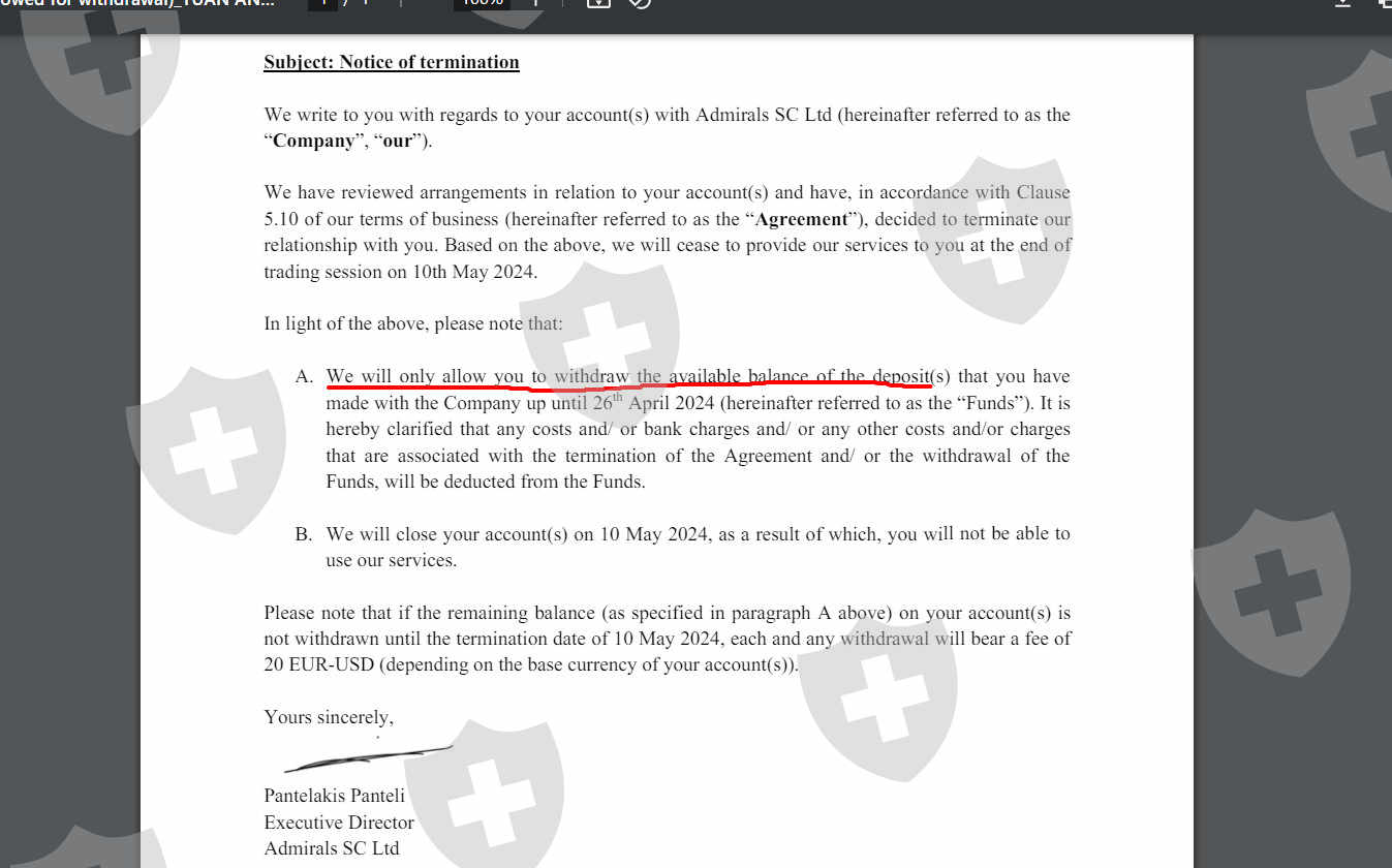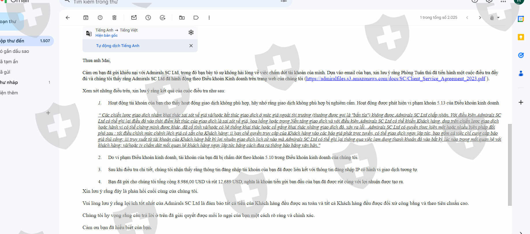 Tôi giao dịch admiral trong 1 tháng, mọi chuyện diễn ra hoàn toàn bình thường và không có bất cứ cảnh báo gì từ sàn, tôi cũng đã phải nạp tiền vào sàn nhiều lần khi lệnh bị lỗ và có thể stopout, nhưng khi có lãi và chốt thì sàn khóa lệnh của tôi và thông báo chỉ cho rút vốn, đây là một hành vi bẩn thiểu và lừa đảo đến từ 1 sàn uy tín 20 năm, tôi đã tìm hiểu và phát hiện nhiều người cũng bị như tôi khi bắt đầu có lãi, hình ảnh bên dưới, bọn chúng đã cướp đi công sức làm việc và tiền bạc hơn 1 tháng trời của tôi, qua rất nhiều email nói dối, bọn chúng không đưa ra được bất cứ bằng chứng nào về việc tôi giao dịch sai luật, mọi người hãy giúp tôi đánh giá xấu về sàn lừa đảo nhà đầu tư từ Việt Nam này, bọn chúng rất sợ người ở nước sở tại và các nước khác, chỉ có khách hàng từ các nước nhỏ thì chúng chơi chiêu trò hết sức bẩn thiểu vì biết tôi sẽ gặp rất nhiều rào cản để đưa bọn chúng ra ánh sáng.