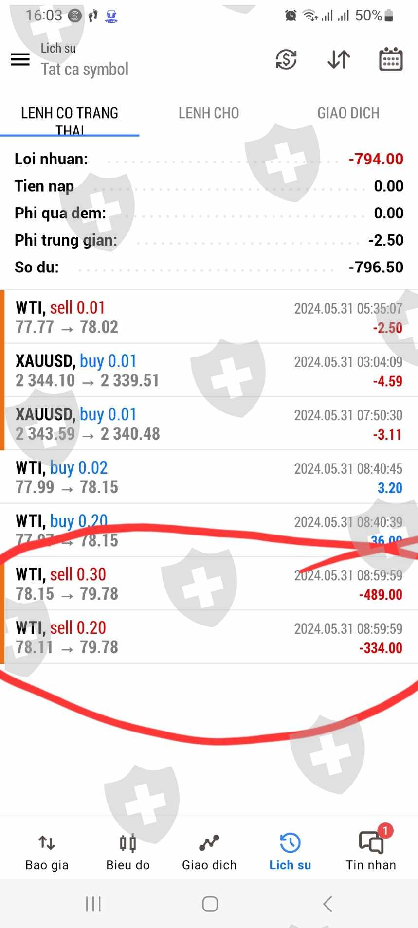 giao dịch trên sàn ACM từ ngày 4/4/2024, ID MT5 là 8000198, vốn 1000USD, chủ yếu giao dịch vàng, dầu. Ngày 31/5/2024 tôi đặt 2 lệnh Sell dầu WTI với volume là