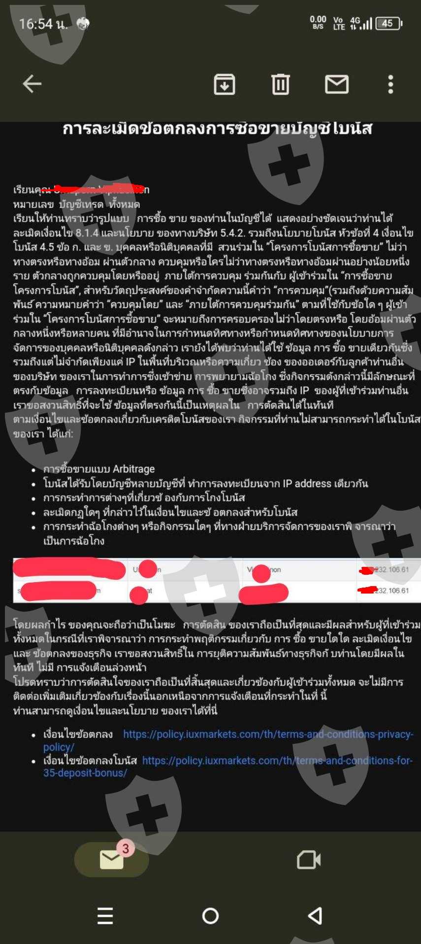 ฉันได้สมัครโบรกเกอร์ IUX แล้วเริ่มเติมเงิน เทรดตามปกติ เสียเงินก็เติมเล่นใหม่ พอได้กำไร กดถอนเงินก็ไม่สามารถถอนได้ โดยอ้าวว่า IP ซ้ำกับคนอื่น เลยตัดกำไรออกหมดเหลือแค่ทุนให้ถอน แล้วปิดบัญชีเทรดของฉัน ฉันติดต่อไปเพื่อจะขอเห็ตผลก็โยนกันไปมา โดนที่มือถือเครื่องนี้พึ่งซื้อมาใหม่ ไม่เคยต่อwifiที่ใหนมาก่อน ใช้แค่เน็ตซิมที่พึ่งเบอร์เบอร์ใหม่ ชื่อที่อ้างว่า IP ชนกันก็ไม่เคยรู้จัก