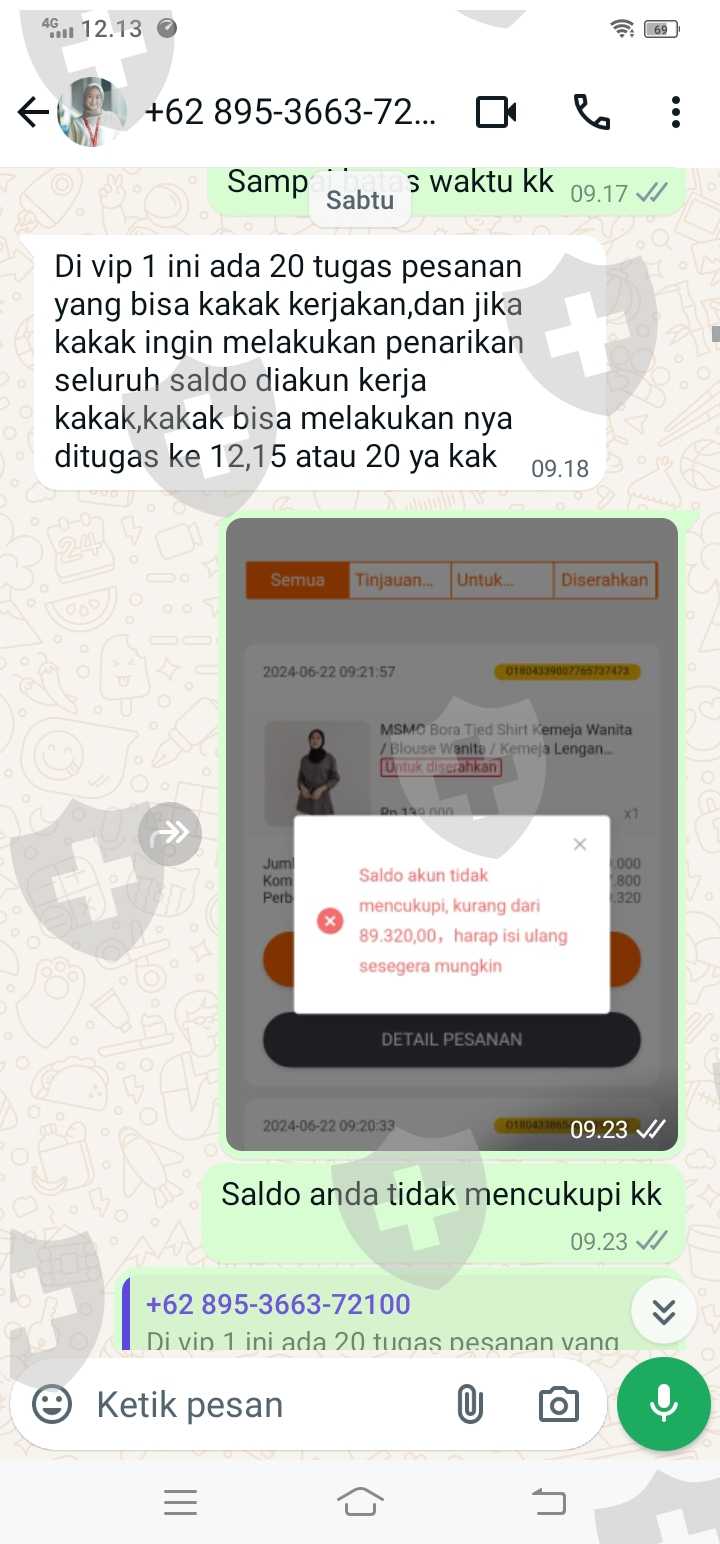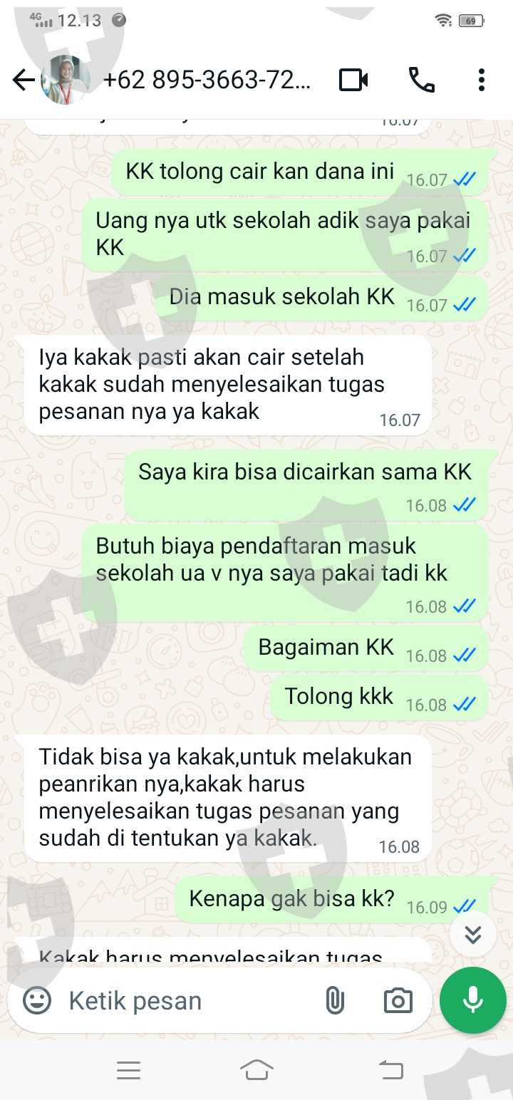 saya ingin uang saya kembali 500 rb admin ,itu hasil jeripayah saya selama ini admin, diimingi saya utk melanjutkan Daan menambah saldo, tolong bantu saya admin, dan tugas 8 saya dimintak 300 rb uang saya tidak ada utk melanjutkan tugas itu, dan saya mintak ke admin tugas uang saya dikembalikan. lalu gak bisa harus selesai tugas 10 dulu baru uang KK bisa cair kata admin .... bantu saya admin