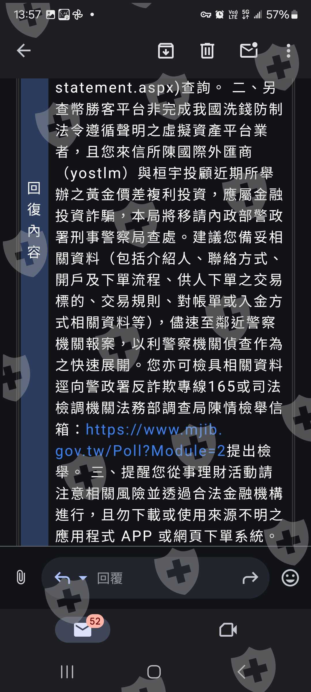 該國際外匯商宣稱(yostlm Saafan Marktes)與台灣投資顧問公司(桓宇)近期舉辦所謂的黃金價差複利投資(CFD),該平台於2024.05.15至聖盧西亞當地註冊,不足一年也並非是NFA會員,而國內投資顧問公司(桓宇)經本人電話中詢知,該公司並無所謂的line群組及複利投資計畫,並且不是國內合法期貨商。然而該國際外匯商(yostlm)表示操作該計畫必需跟兌換商(幣勝客)以面交現金方式取得USDT虛擬美金才得以在Meta Trader5操盤外匯,且入金金額最低為台幣十萬及要求獲利分成將近一半給予外匯商,該平台未有設定負餘額保護,因疑似被設計而造成穿倉(五千多塊美金及保證金3200美金),現該外匯商(楊宗興)要求將負數餘額補齊,否則將以公司名義(yostlm Saafan Marktes)提告...