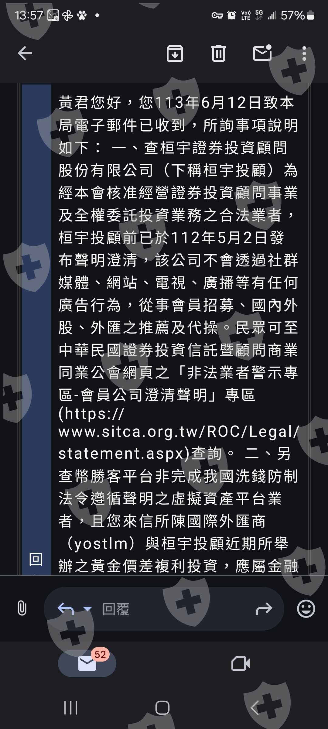 同時本人發函至期證局求證,該國內投資顧問公司(桓宇)已於民國112年5月2號發佈聲明澄清,該公司不會透過社群媒體、網站、電視、廣播等有任何廣告行為,從事會員招募、國內外股、外匯之推薦及代操。