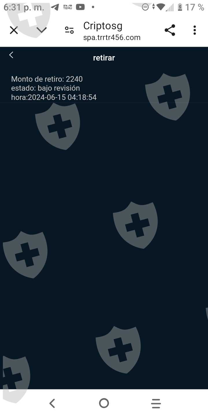 我存入了1600。我赚了2240比索的利润。但是当我点击提款按钮时,提款没有成功。页面告诉我,自2024年06月15日4:18:54起,正在审核中。