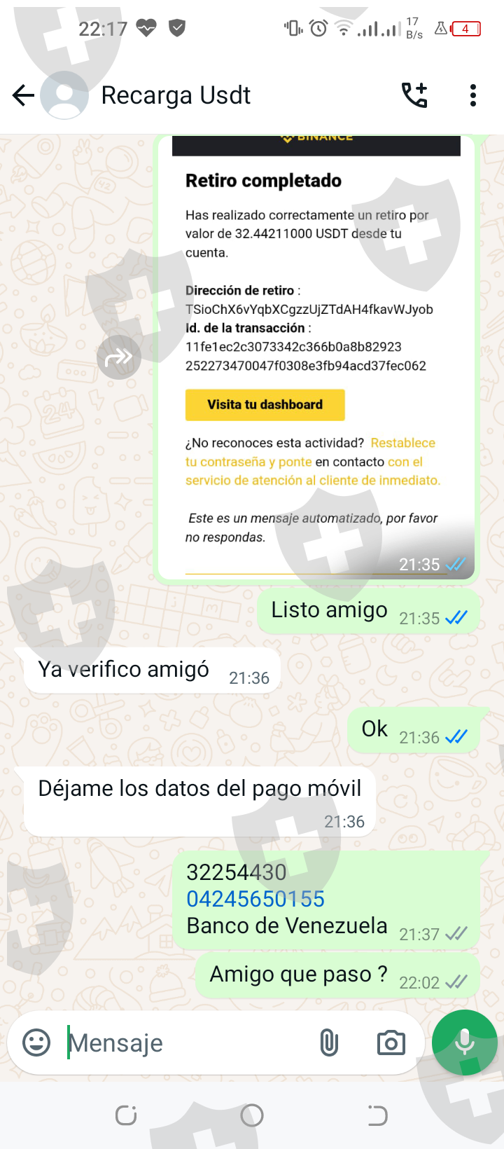 被一个声称用玻利瓦尔购买USDT的人骗了,结果证明是谎言。他要求我转账。我给了他我的账号,以便他可以付款。然而,他删除了所有的消息并将我拉黑。我该怎么办才能找回我的钱?我有截图显示账号、电话号码和其他所有信息。拜托,请帮我找回我的钱。🙏🏻🙏🏻🙏🏻