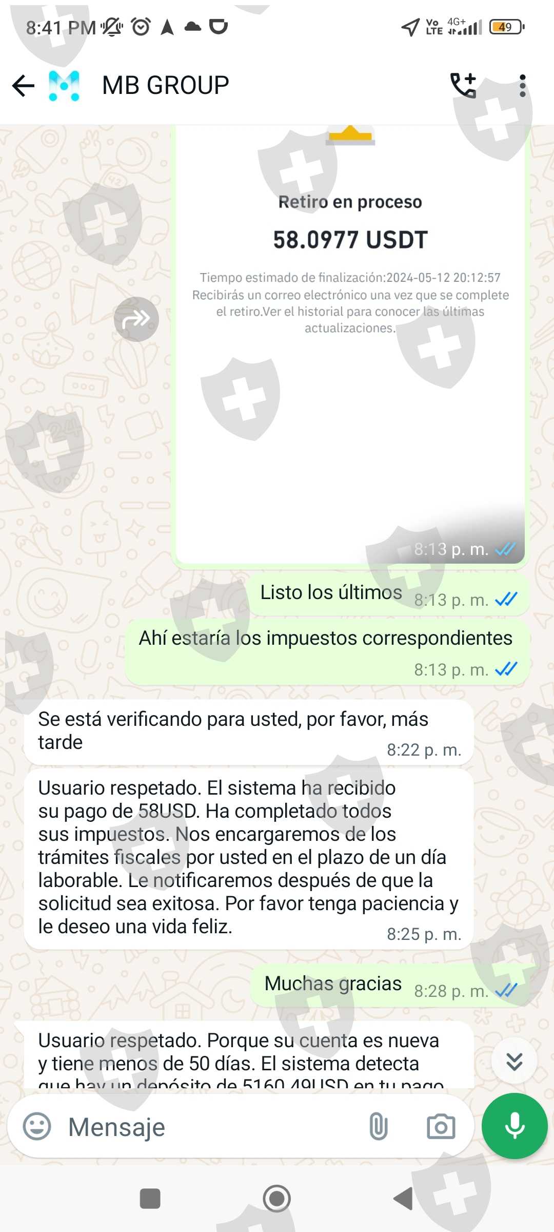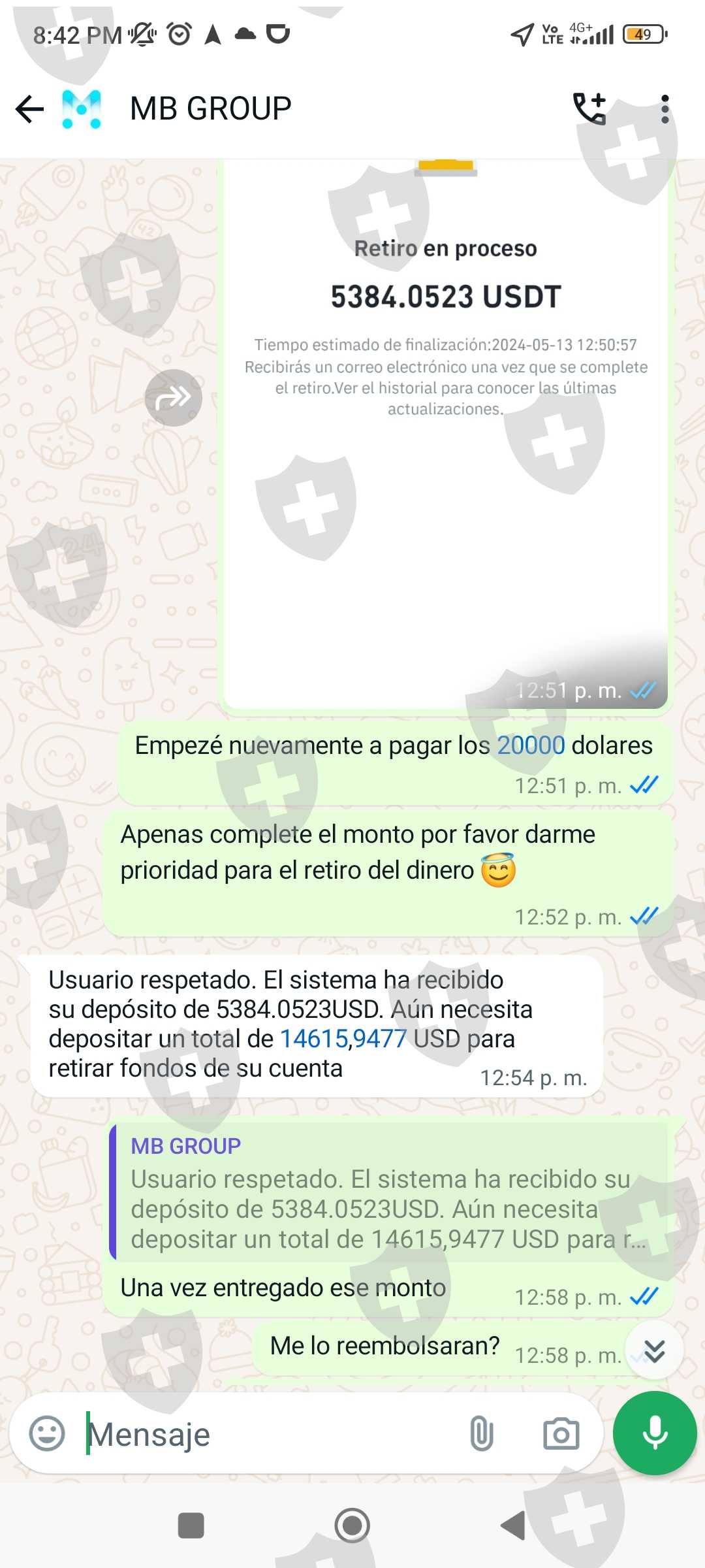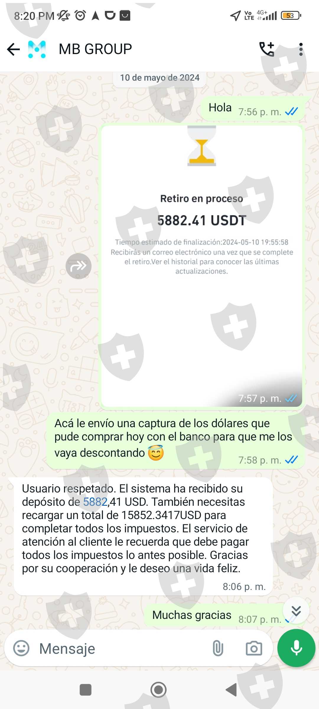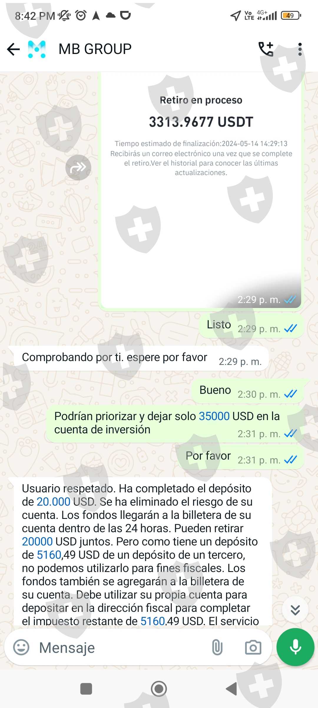 Invertí en el brokers mbgrous.cc en el mes de abril y cuando quería retirar el día 11 de mayo 2024 mis ganancias de 114393,43 USD me iso pagar el 19% de esa ganancia del impuesto de mi país, después al demorarme en cancelar, me cobró una multa de 20000 USD más para que llegaran mis fondos a mi cuenta binance. Ya al haber pagado sobre 40000 USD para que según llegué mis ganancias, aún me están cobrando 15000 USD por la demora al pagar... Actualmente me congelaron la cuenta hasta que pague los 15000 USD. Envío pruebas de la app de inversión más las conversaciones y la página del brokers.