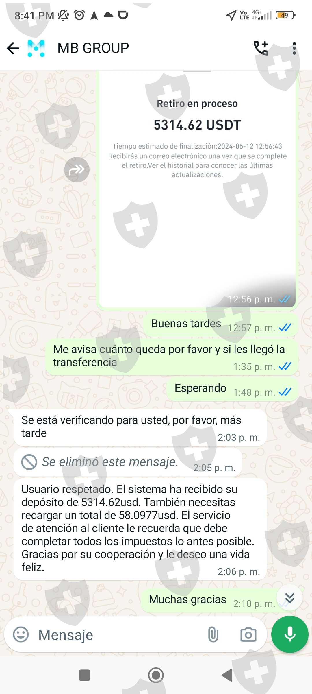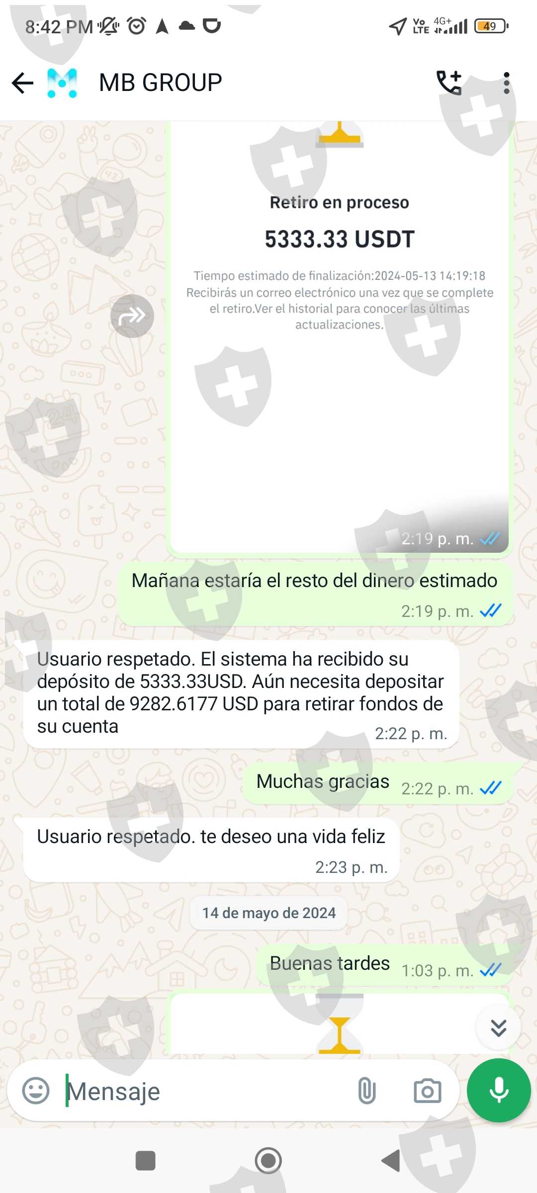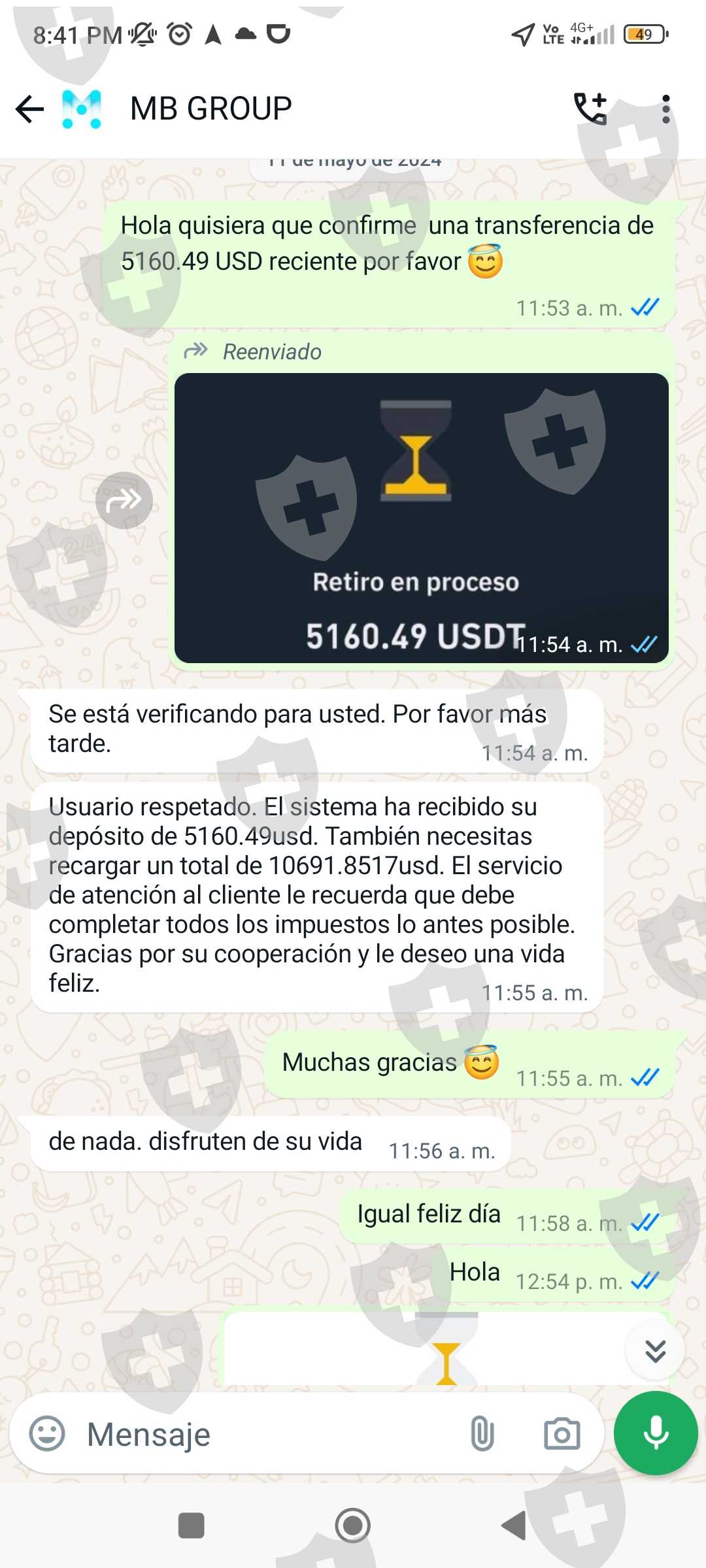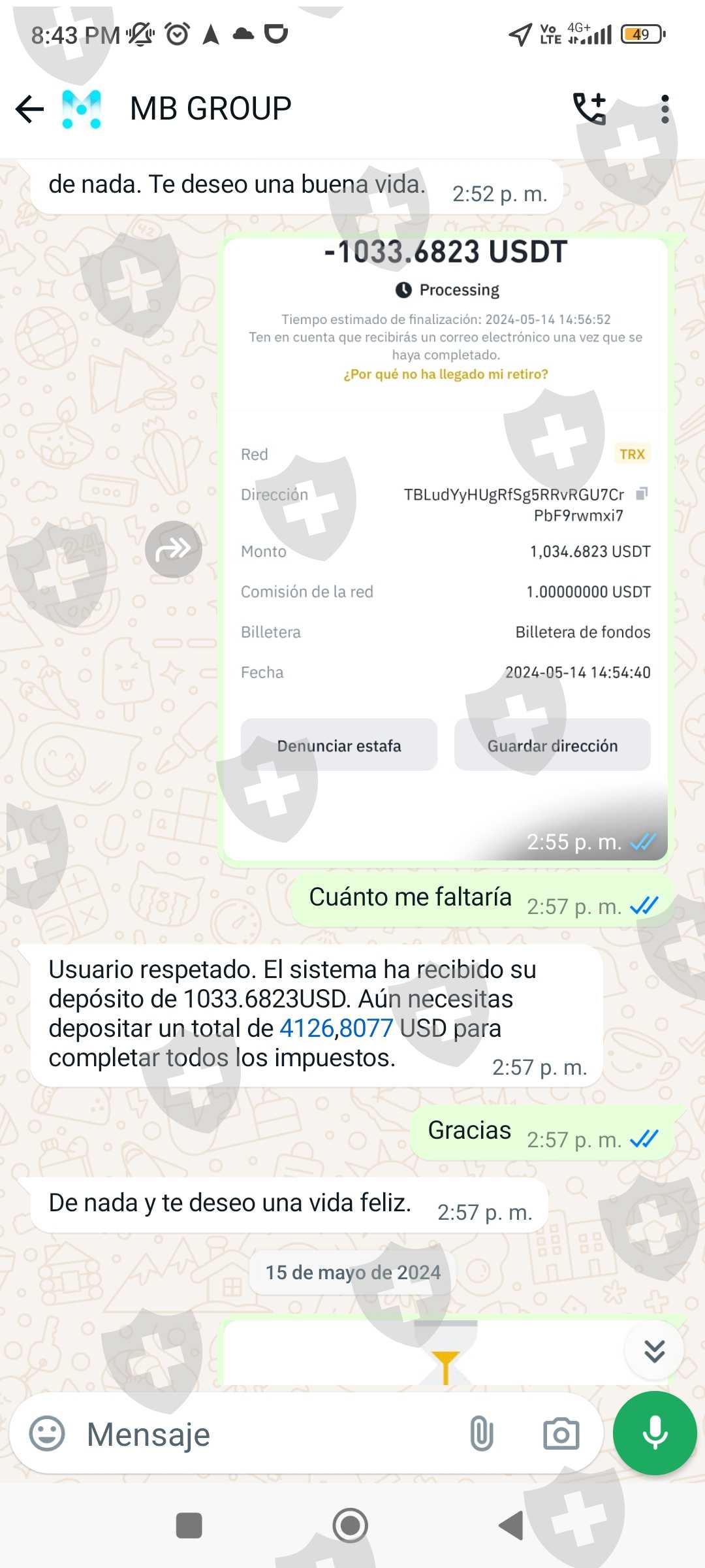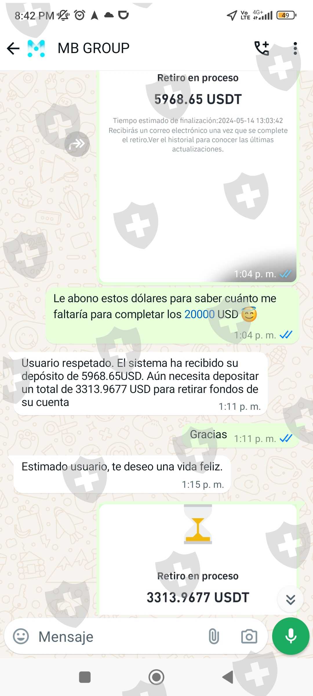 Invertí en el brokers mbgrous.cc en el mes de abril y cuando quería retirar el día 11 de mayo 2024 mis ganancias de 114393,43 USD me iso pagar el 19% de esa ganancia del impuesto de mi país, después al demorarme en cancelar, me cobró una multa de 20000 USD más para que llegaran mis fondos a mi cuenta binance. Ya al haber pagado sobre 40000 USD para que según llegué mis ganancias, aún me están cobrando 15000 USD por la demora al pagar... Actualmente me congelaron la cuenta hasta que pague los 15000 USD. Envío pruebas de la app de inversión más las conversaciones y la página del brokers.