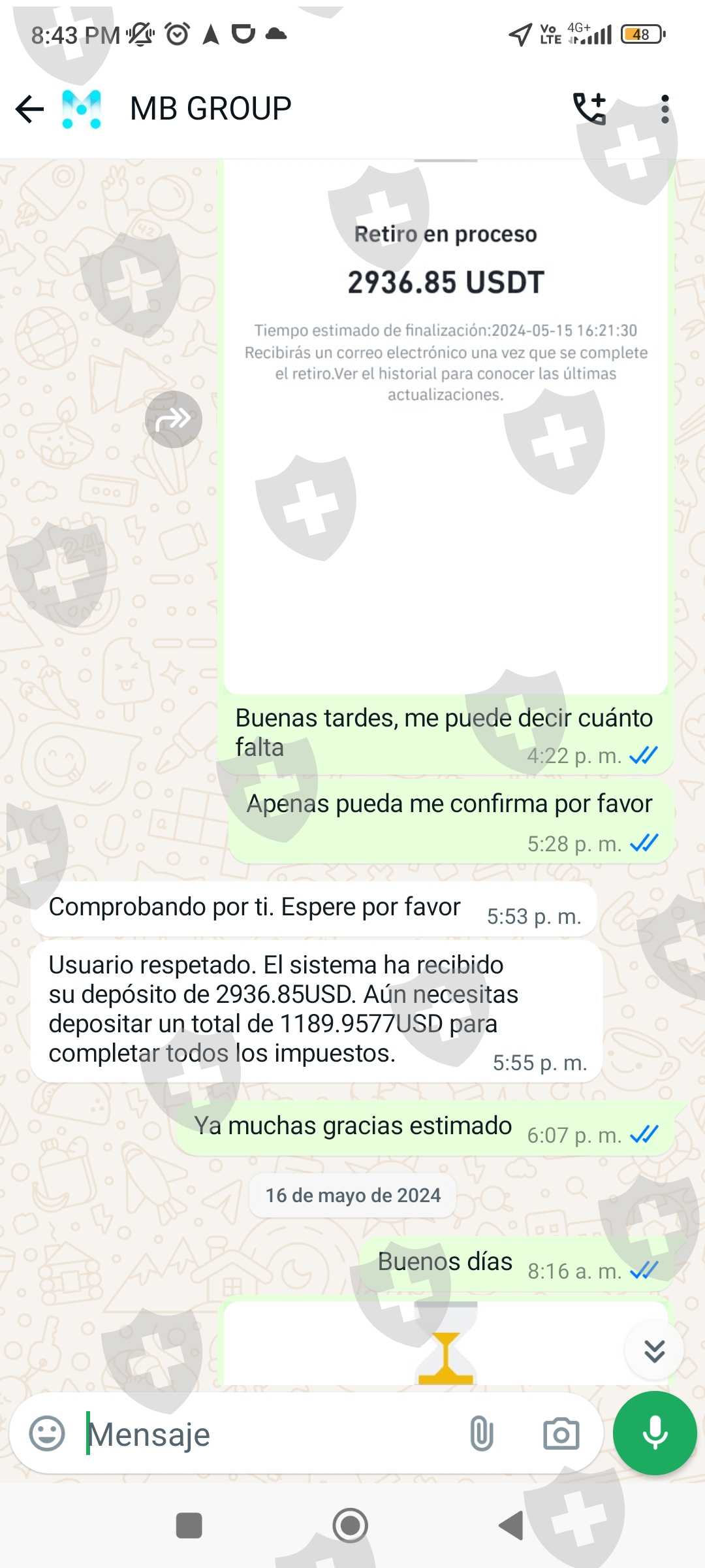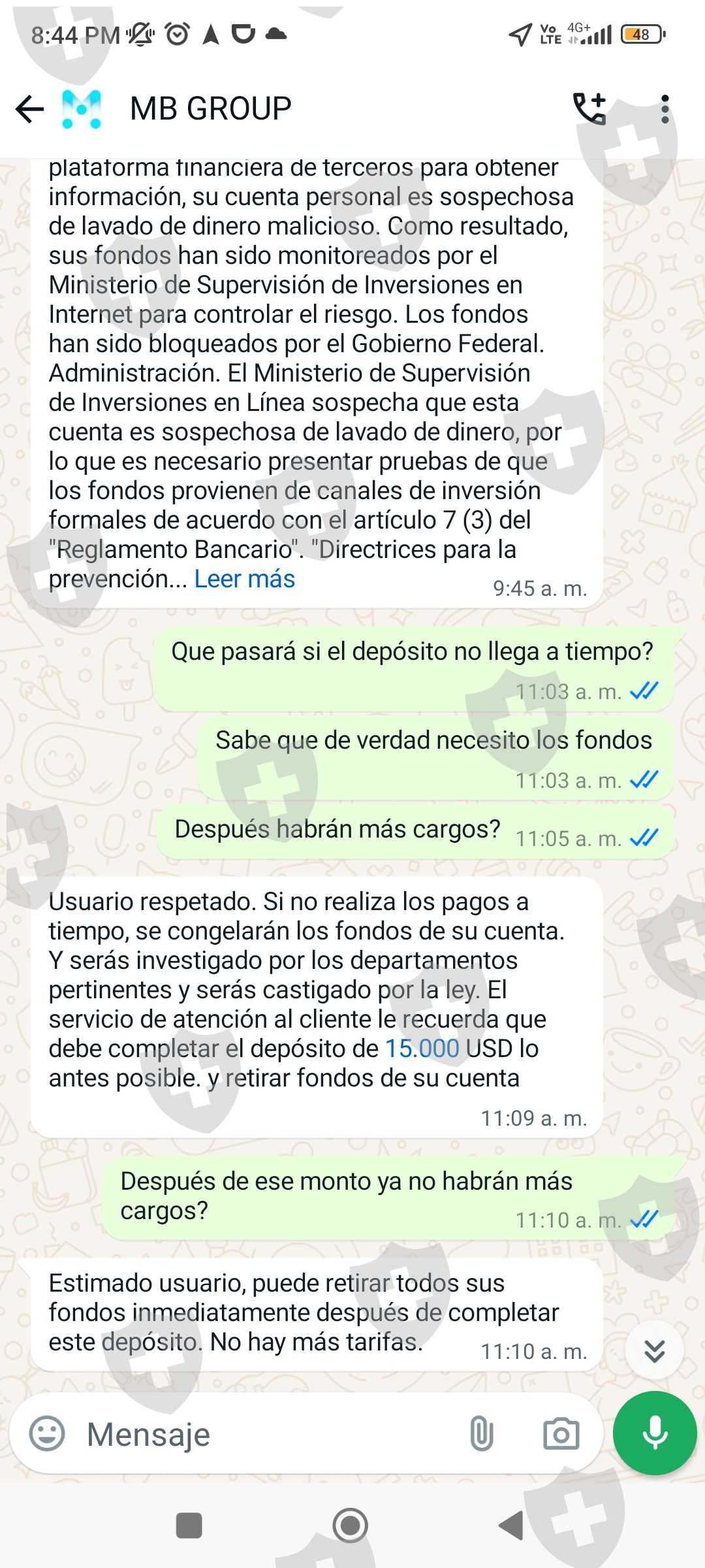 我在四月份投资了mbgrous.cc经纪商,当我想在2024年5月11日提取我赚取的114393.43美元时,他让我支付了我国税收的19%作为利润,然后当我迟迟没有取消时,他又向我收取了20000美元的罚款,以将我的资金转入我的币安账户。已经支付了超过40000美元的费用,以便我的收益到账,他们仍然向我收取15000美元的延迟支付费用... 我的账户目前被冻结,直到我支付15000美元。我正在发送投资应用程序的证明,以及对话和经纪商页面。