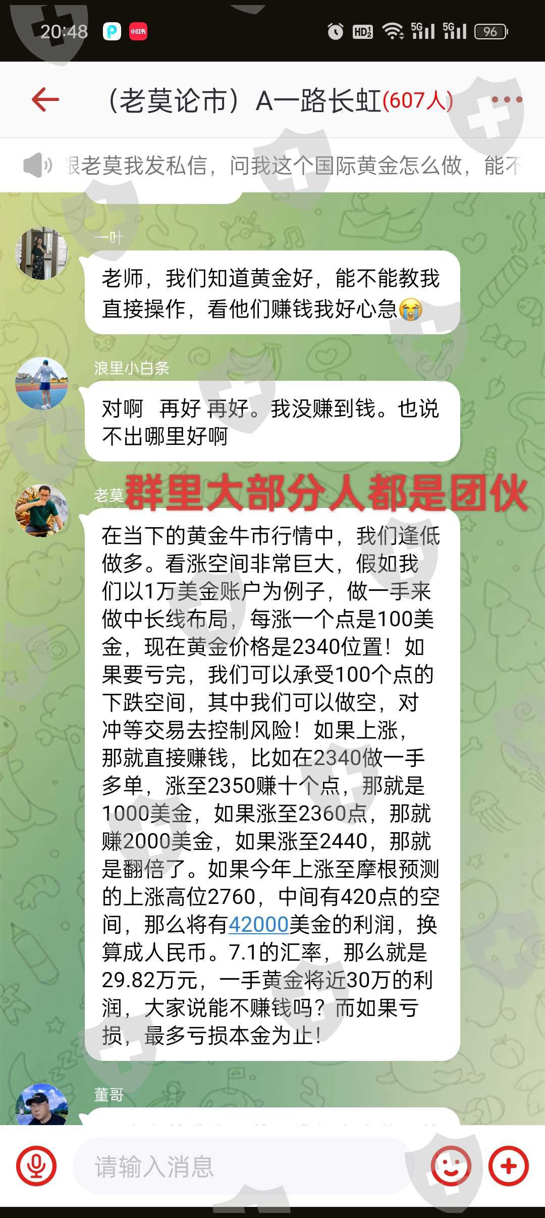 大家警惕杀🐷盘陷阱,保护好个人财务,如果正在经历要快速报👮🏻♀️哦。可以把自己碰到过的盘哥发出来,让大家避个雷。上面的图片就是我遇到的盘哥,这个盘哥和我聊过,先是把自己包装成成功人士,说自己老婆出轨跟别人跑了。取得同情,拉近关系。让你放松警惕,然后拉你去股票群。然后群里有老师有他们的团伙,每天分享国际黄金赚了多少钱?各种赚钱晒图。然后就给你推荐经理开国际账户。发些资料给你介绍洗脑都是正规平台。打着mt5交易所的旗号正当光明的骗钱。带你投资做国际黄金(伦敦金),老师分享点位,先让你赚钱。 你可以提现。慢慢的就带你亏钱,账户冻结,然后让你充钱解封。才能把钱提出来,你充了钱之后还不能解封,想方设法让你继续充钱。可能到最后也不能提现。我前后充了6万多美金。账户里有20多万美金。一分也提不出来,账户不会给你解封。慢慢的账户就登不进去了。这种国外盘最好不要碰。你充值的钱是他们国外的私人账户。警察也没有办法找回,然后他们就演戏找理由把你踢出群删了。这次血的教训,让我想死的心都有了。希望大家不要像我一样。不要太相信别人都是假象,也希望自己调整好心态能早日走出阴影,从新开始……大家一定要小心,投资需谨慎!