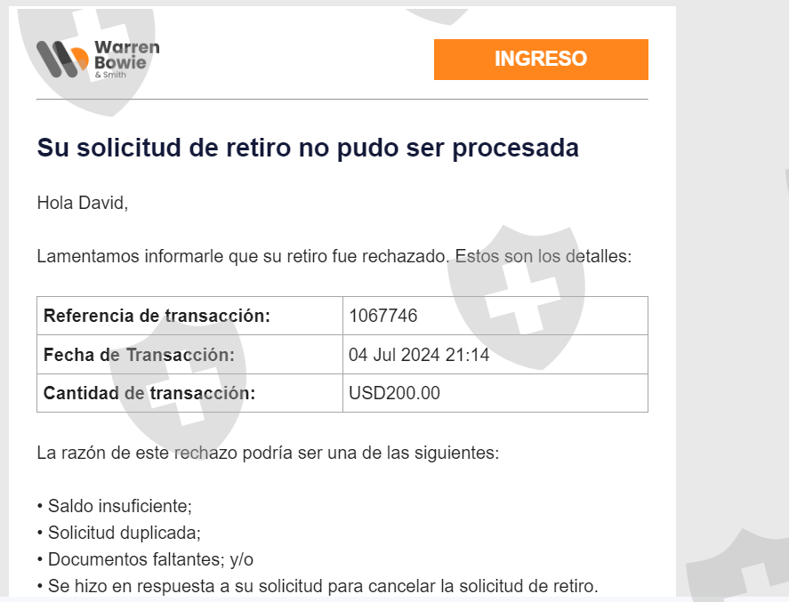 我的名字是David Herrera Luna,我是哥斯达黎加公民。我向Warren Bowie & Smith的账户存入了200美元。然而,我注意到其他用户在欺诈方面的情况。所以我决定要提取我的钱,但我发现平台不允许我这样做,并要求我提供我不想提供的信息,例如我的借记卡正反面的照片。