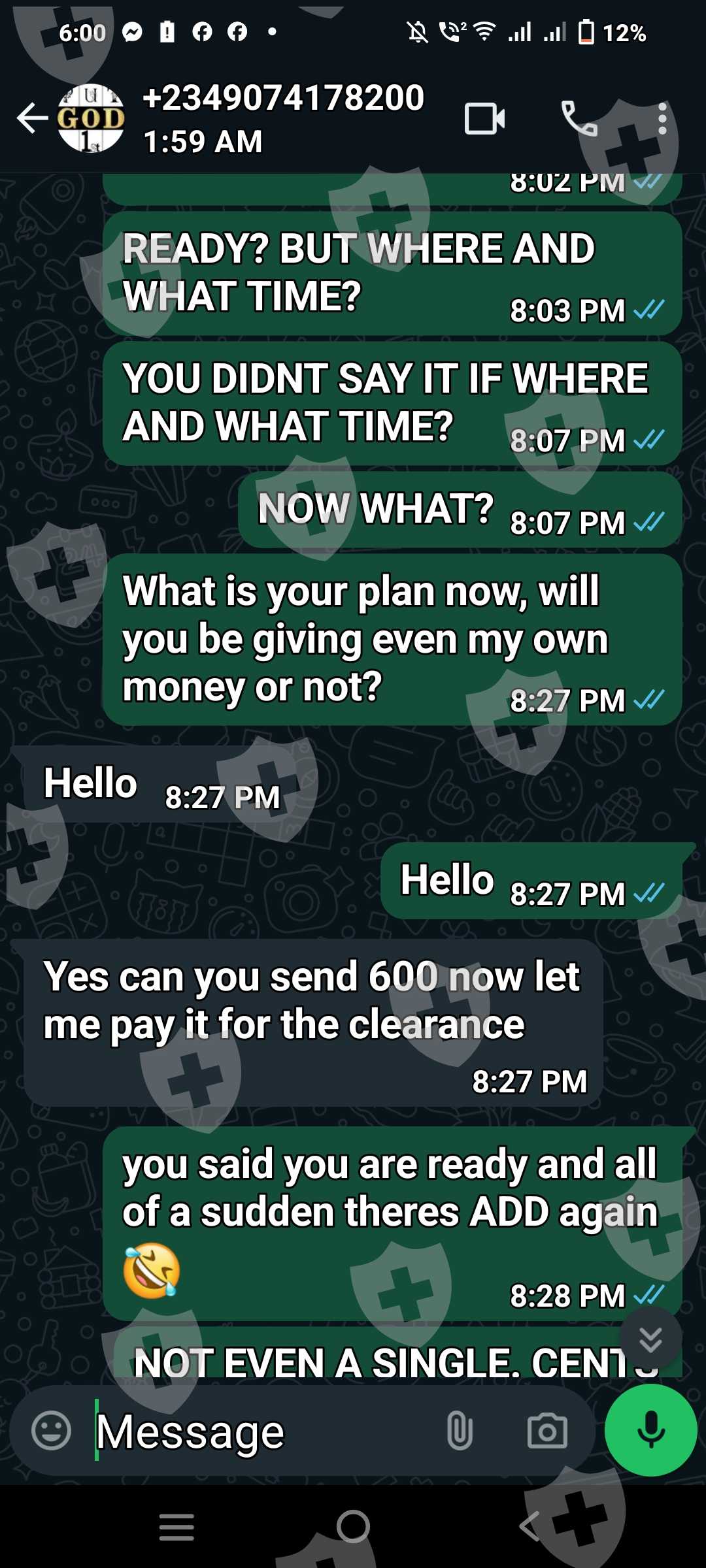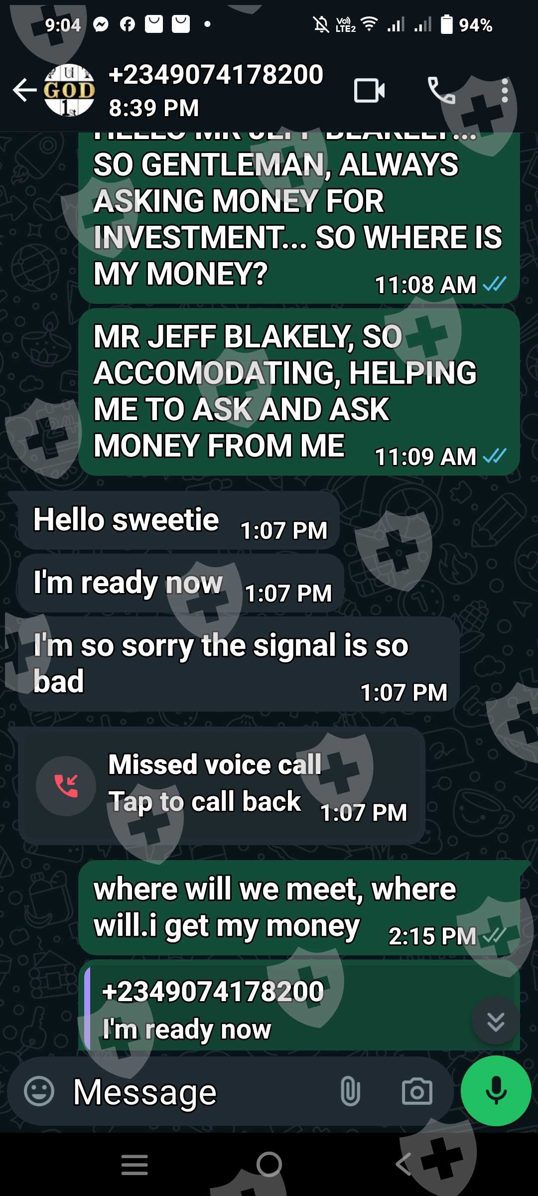 杰夫·布莱克利是美国弗罗里达人,他让我在 2023年6月5日小额入金2500比索。我当时很犹豫,但他说服了我,金额已经达到近 600,000.00比索。我们之前在facebook上聊天,但我屏蔽了他,这样就看不到,也不会再被骗。但是他又从whatsapp找到我,他的whatsapp 账号是 +234 907 417 8200。最后一次消息是在 2024 年7月1日,他告诉我会亲自把钱给我,之后我以为能拿到我的钱了,但是,他再次要求我支付 600 比索的清关费,但我已经不信了。将近 395天,我还以为他能帮我。下面是这个骗子的相关证据和照片,过去的1年零1个月了,我一直相信他。我不再指望钱会退还,我只希望这个人能被封锁,这样其他人就不会成为下一个受害者。