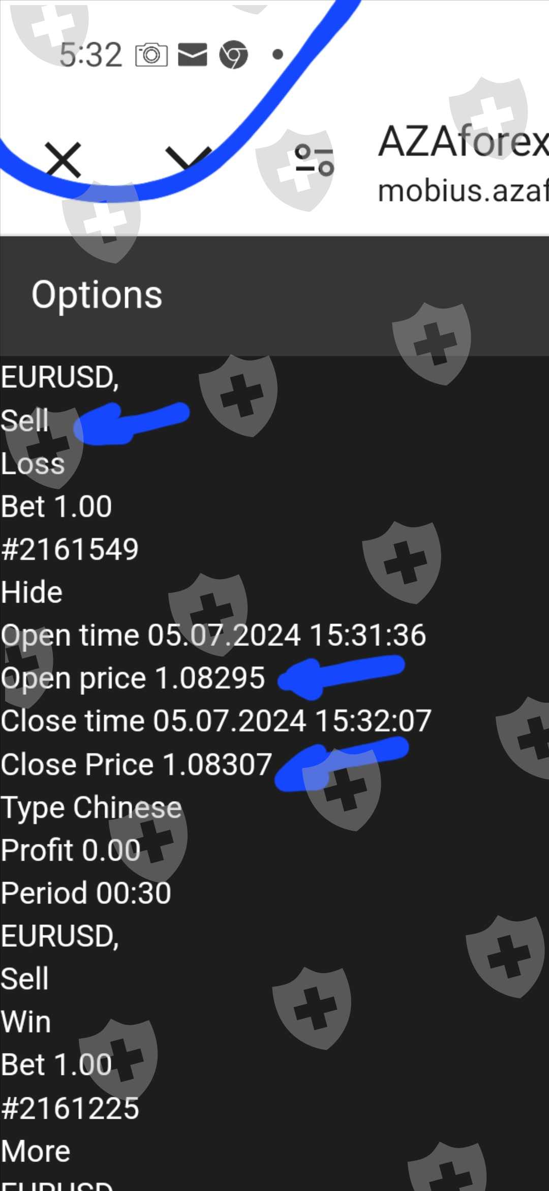 If Close price differences b/n the manipulated open option trade 1.08307 minus the correct chart close price 1.08286 gives us a 21 price difference. If AZAForex was a reliable platform and not manipulated, the close price on the correct chart reading 1.08286 must be the same as the open option trade close price. This means the Manipulated 1.08307 price must also close at chart reading price point 1.08286.