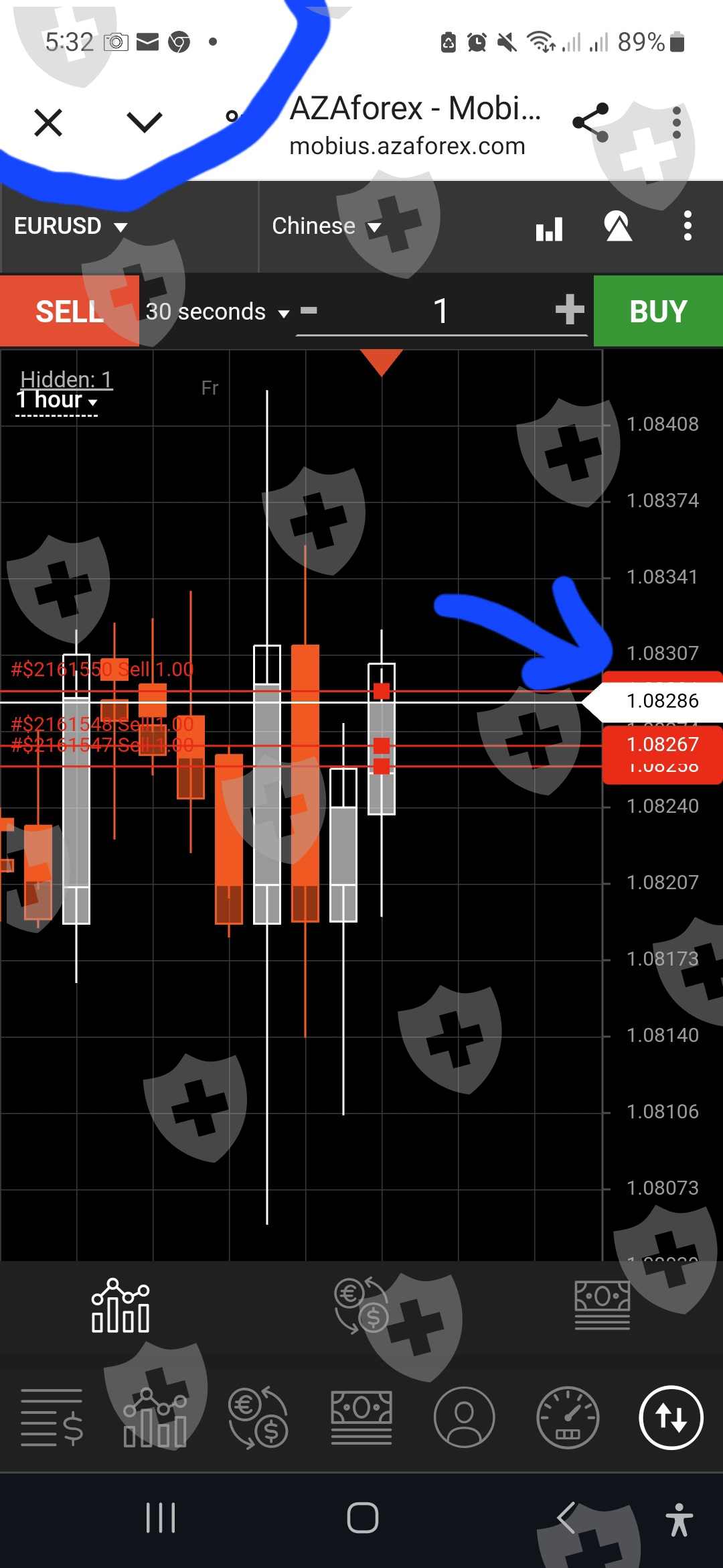 注意:操纵开盘交易的收盘价(1.08307)与正确图表的收盘价(1.08286)之间差了21点。如果AZAForex是一个可靠且非操纵性的平台,这些价格应该完全一致。