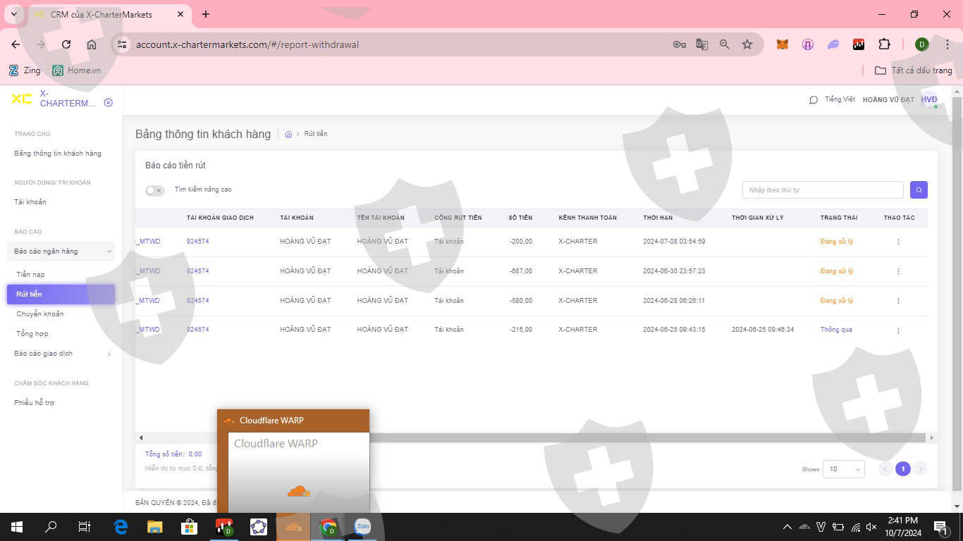 tôi tham gia sàn Xcharter. ngày 28/6/2024, ngày 30/6/2024 và ngày 8/7/2024 tôi đặt lệnh rút tiền tuy nhiên tại thời điểm hiện tại đã 13 ngày kể từ ngày tôi đặt lệnh rút tiền vẫn đang ở trạng thái đợi xử lý. Trước đó tôi đã rút tiền thành công được 1 lần. Đề nghị hỗ trợ cho tôi để tôi có thể rút tiền thành công. tôi xin chân thành cảm ơn