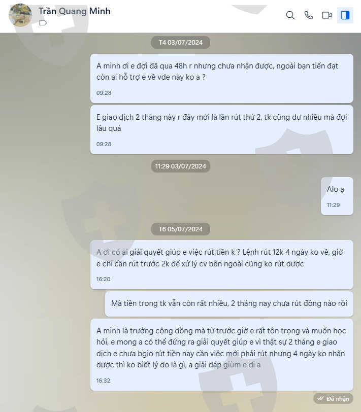 这个平台是一个彻头彻尾的骗局。我最初投资了2万的本金,总投资额增长到了超过9万,但是我一个月来没有收到任何提款的钱。当我打电话给客服时,他们只是把责任推来推去,然后在Telegram和Zalo上封锁了我的账户。我希望每个人在投资之前都能进行彻底的调查,以避免损失。
