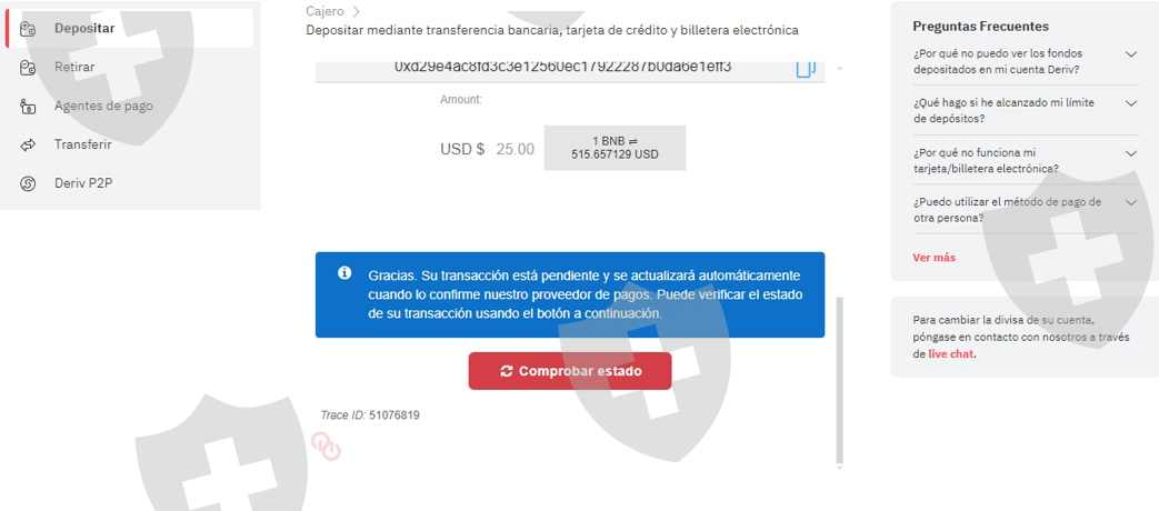 dólares ganados mas 25 dólares que fueron depositados de binance a deriv