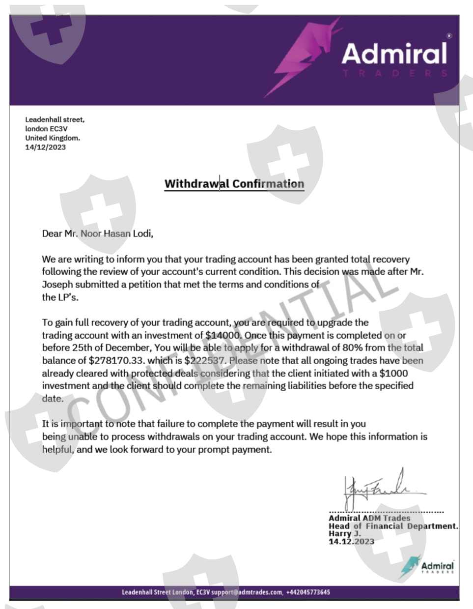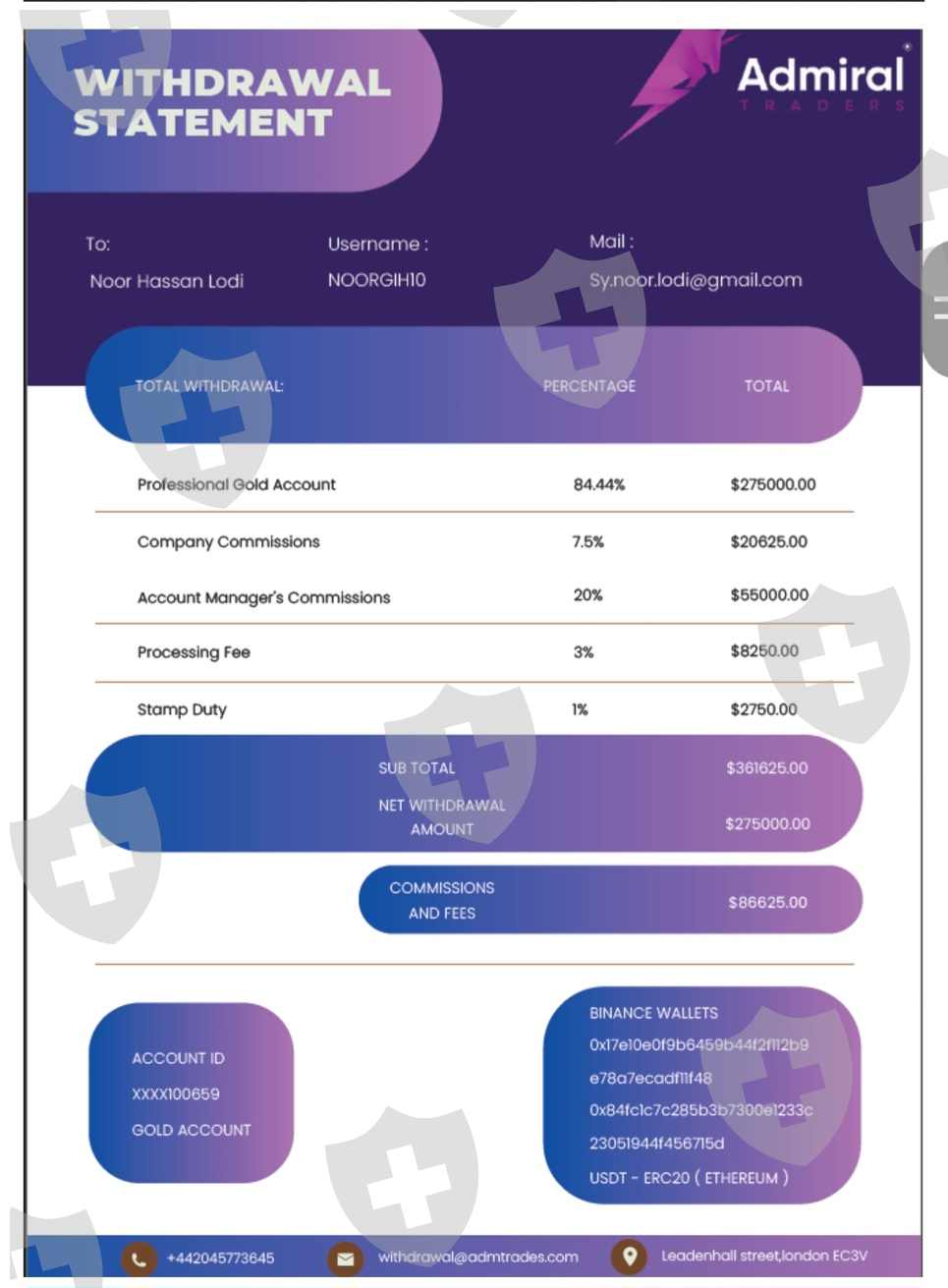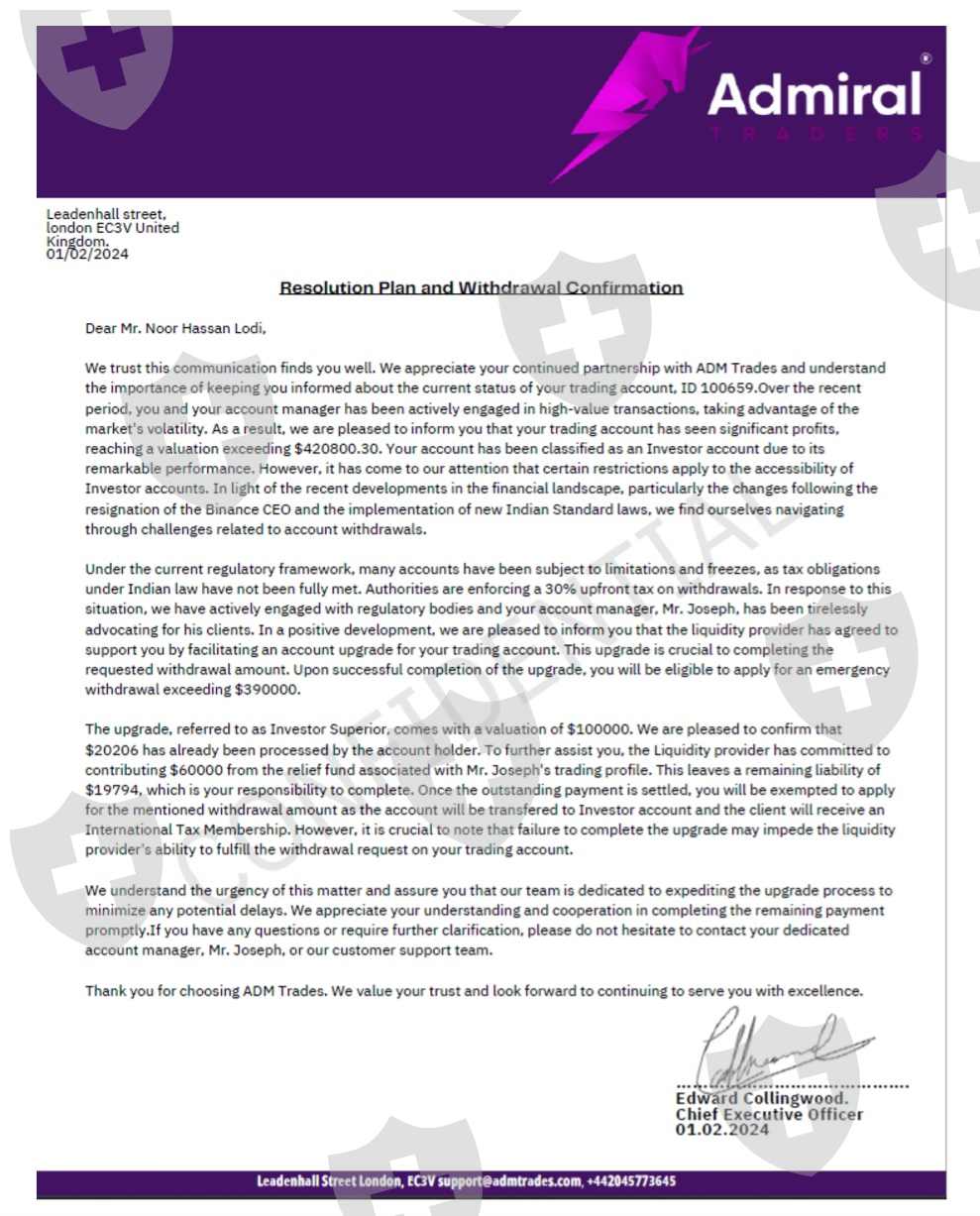 我是努尔·哈桑· 洛迪,来自马尔达阳光公园,我向朋友借钱达到最低入金5000 美元的门槛。付款后,我开始盈利,后来不知怎么的又亏损了,约瑟夫在 2023 年 12 月 14 日说要收回损失和利润,我必须将方案升级为 20000美元,恢复所有的亏损和利润,并给我安排另外1.5万美元。约瑟夫对我说,一旦你付款,他们将在接下来的 24 小时内处理我的所有出金275000美元,但我必须在 2023 年 12 月 26 日之前付款。按照约瑟夫的建议,我在 2023 年 11 月 13 日至 2024 年 1 月 10 日期间向 Admiral 付款。我向约瑟夫支付了20430 美元后,biniance说他正在处理我的提款,努力清算我的提款。但他们无法清算提款,因为印度政府在印度封禁了 Biniance,20 天后,约瑟夫开始找各种借口,他们再次开始要求我通过支付另一笔 19000 美元的押金来升级账户,升级我的账户后,他们才能提供国际税务会员证书,通过证书他们才能清算提款。他们给我打了好几次电话,直到 4 月 25 日 - 24 日,他们不打电话了,还屏蔽了我 ID 的交易软件,但在线 ID 仍然有效,现在不接电话也没有回复。但现在他们不给我出金。