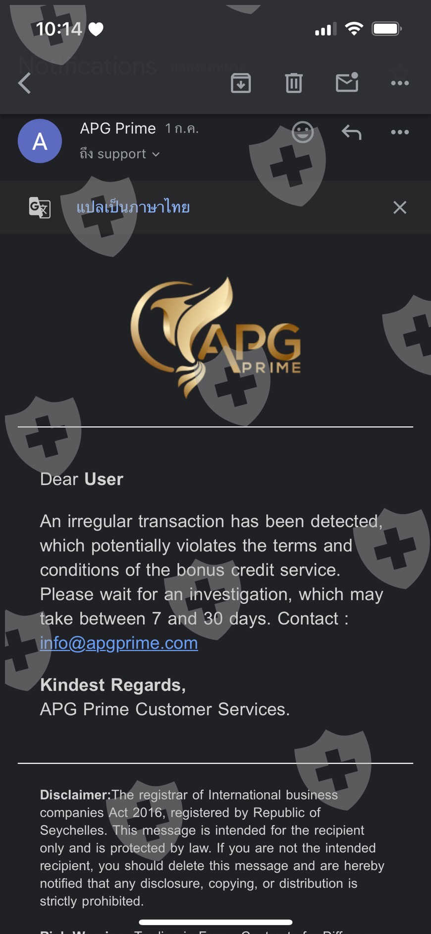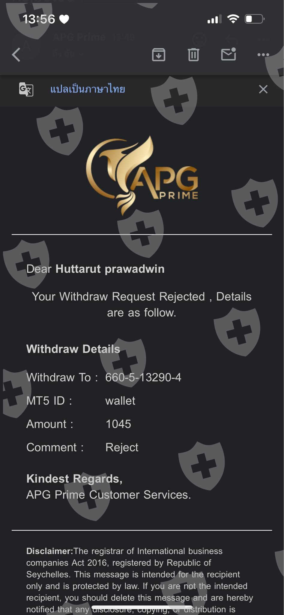 เติมเงินแบบรับโบนัส 100% ถึงเวลาถอนเงิน ถอนไม่ได้ ขึ้นรีเจค รายละเอียดตามรูปที่แนบ เขาบอกว่าอาจมีการละเมิดกฎโบนัส แต่เราไม่ได้ทำการ อาบิทาจ หรืออะไรเลย เป็นการเทรดปกติ สอบถามทางซัพพอร์ตแจ้งว่า ระหว่ารอเราสามารถทำการเทรดได้ปกติ เราเลยเทรดต่อ ตอนนี้ในวอลเล็ท มีเงินอยู่ประมาณ 1,300+ usd แต่ปัจจุบันไม่สามารถ เข้าสู่ระบบได้แล้วค่ะ รอบแรก ขึ้นว่าถูกบล็อค ปัญจุบัน ขึ้นว่า อีเมลล์ไม่ได้รับการยืนยัน