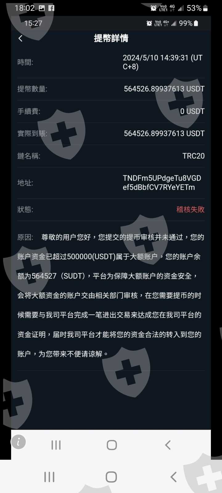 臉書交友到加line認識,慫恿入金滿幣平台,介紹幣商購買泰達幣轉入平台操作,獲利了要提領,平台說要繳交個人綜合所得稅20%,繳了個人所得稅以後審核不過還是不能提領,說我是大額提領用戶,帳戶資金凍結,還要繳一筆保證金才能提領,我也繳了一部分,沒錢在繳了,於是平台跟我說要把我的帳戶資金交由第三方銀行監管,覺得被詐騙。